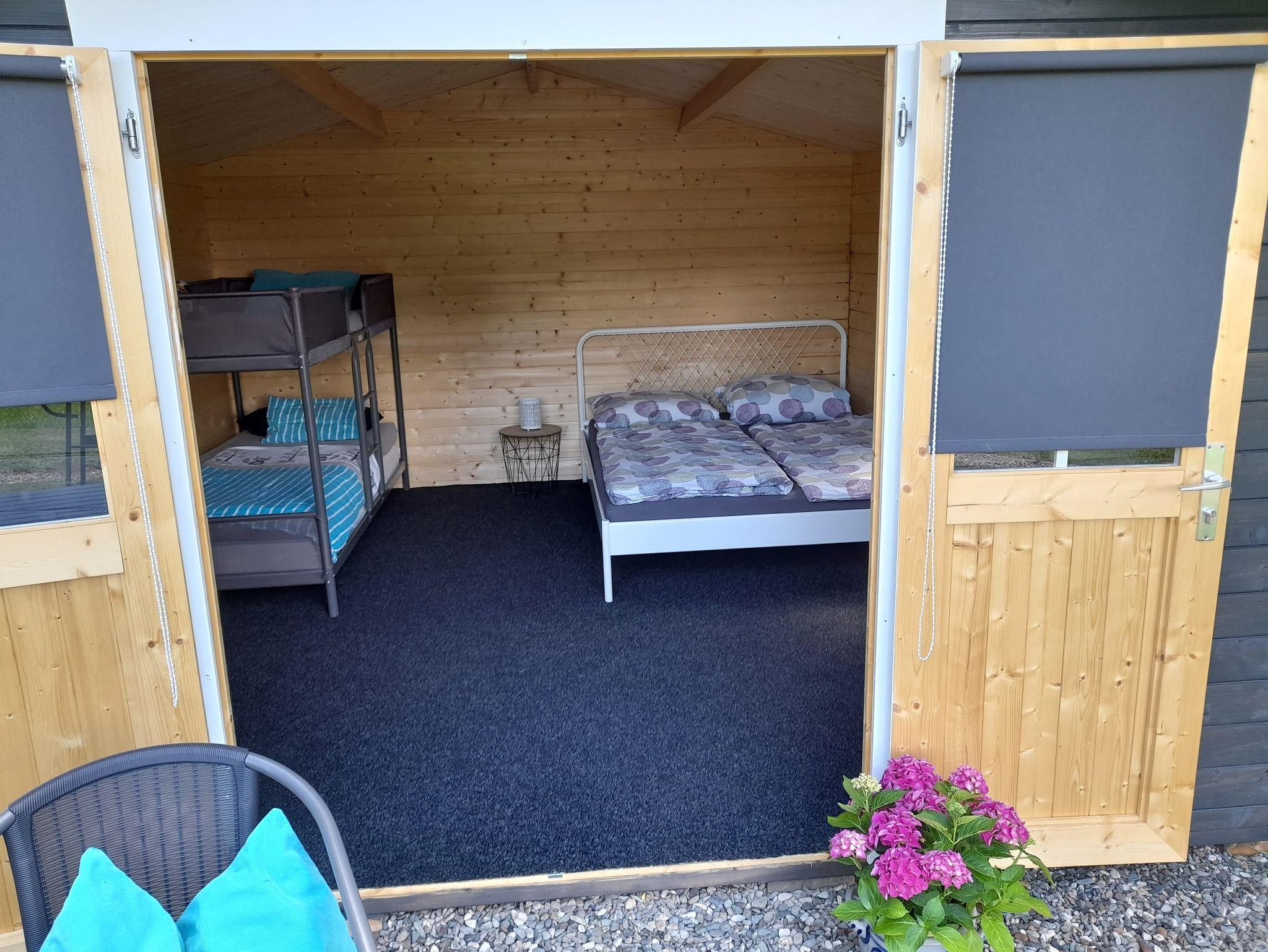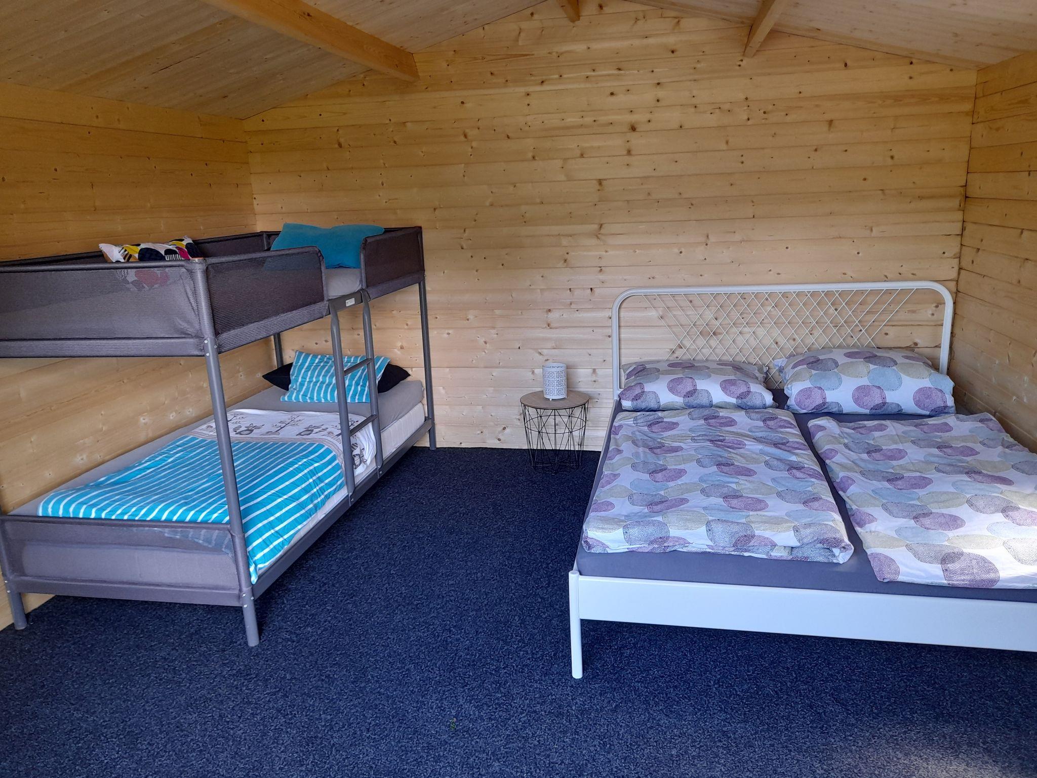 Unsere Campinghütte Luisa verfügt über ein Bett 160 x 2,00 und ein Etagenbett 90 x 2,00 für Kinder. In dieser 16 qm großen Hütte befindet sich ein Doppelbett und ein Hochbett, sie bietet somit Platz für bis zu 4 Personen. Ebenfalls gibt es Licht, Strom, W-LAN, Fensterrollos zum Abdunkeln, Tisch und Stühle auch im Außenbereich befindet sich ein Tisch mit Stühlen der zum Verweilen einlädt. Die Übernachtung in unseren Campinghütten beinhaltet Bettwäsche, Beleuchtung,