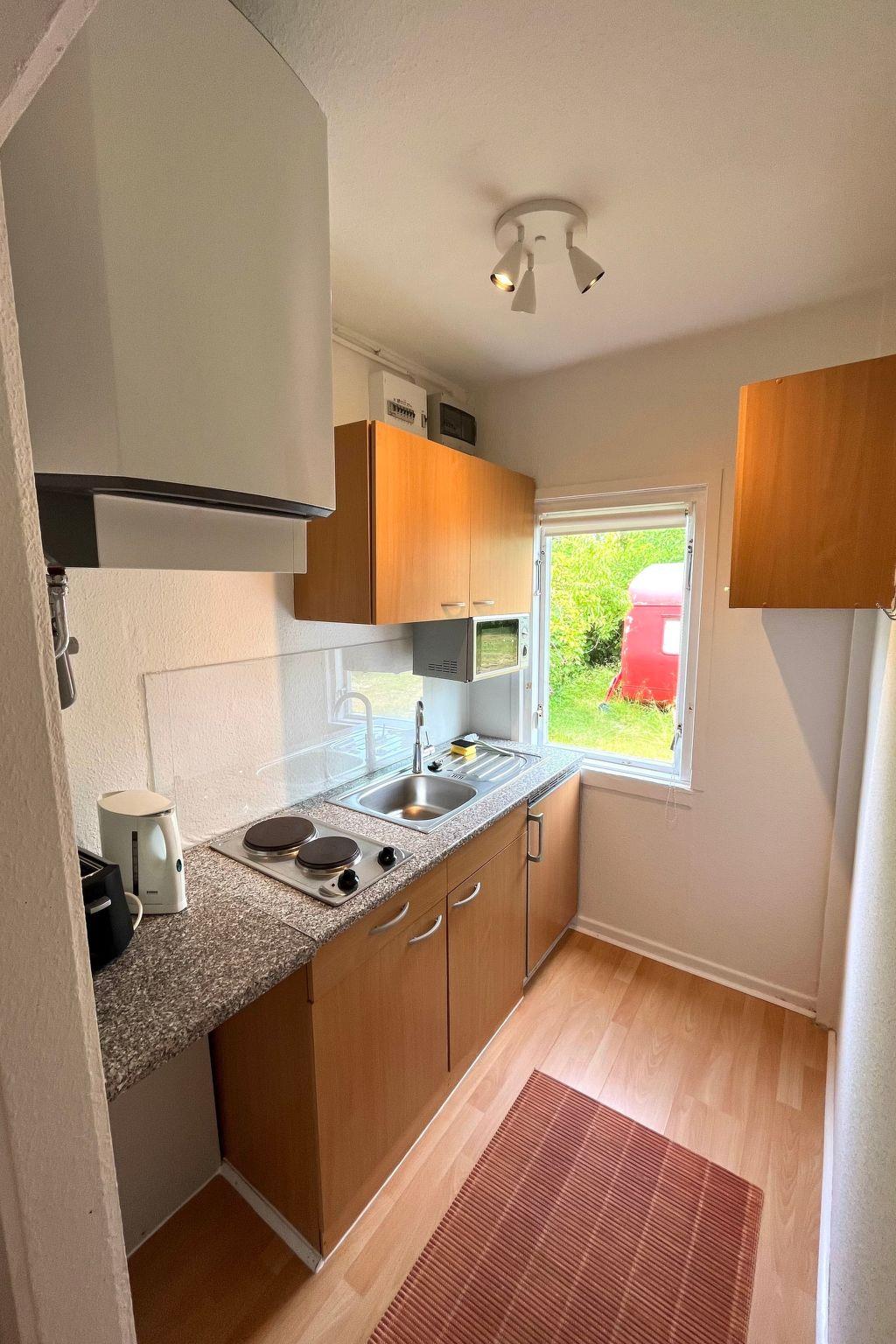 The kitchen is equipped with a 2-burner hob and fridge and offers you the opportunity to prepare small meals. Enjoy your meals at the dining table for four and let yourself be enchanted by the marvellous view of the garden.