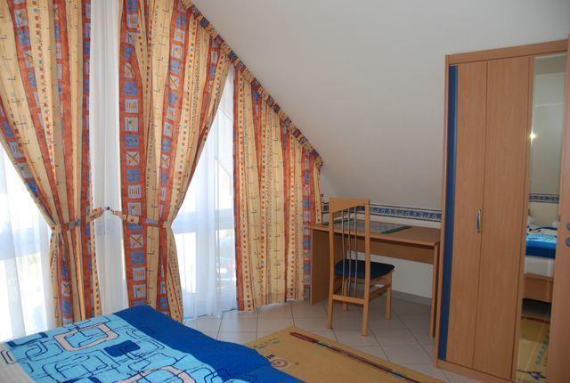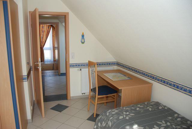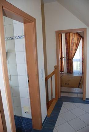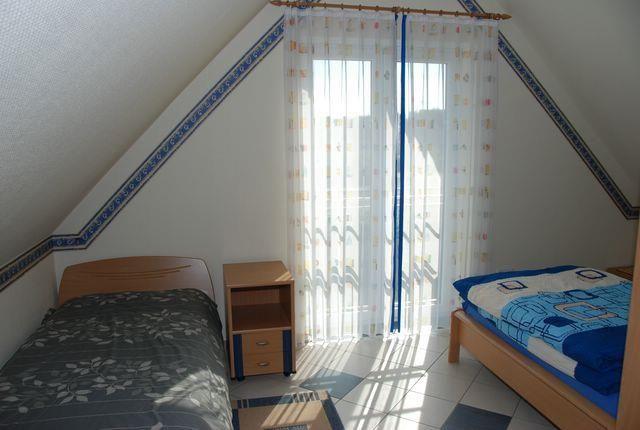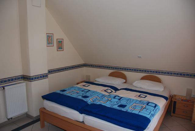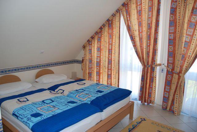 Über eine offene Treppe gelangen Sie in die obere Etage des Hauses. Hier befinden sich die zwei separaten Schlafzimmer, die beide mit einem Doppelbett und Kleiderschrank möbliert sind. Eins der Zimmer bietet außerdem ein zusätzliches Einzelbett.