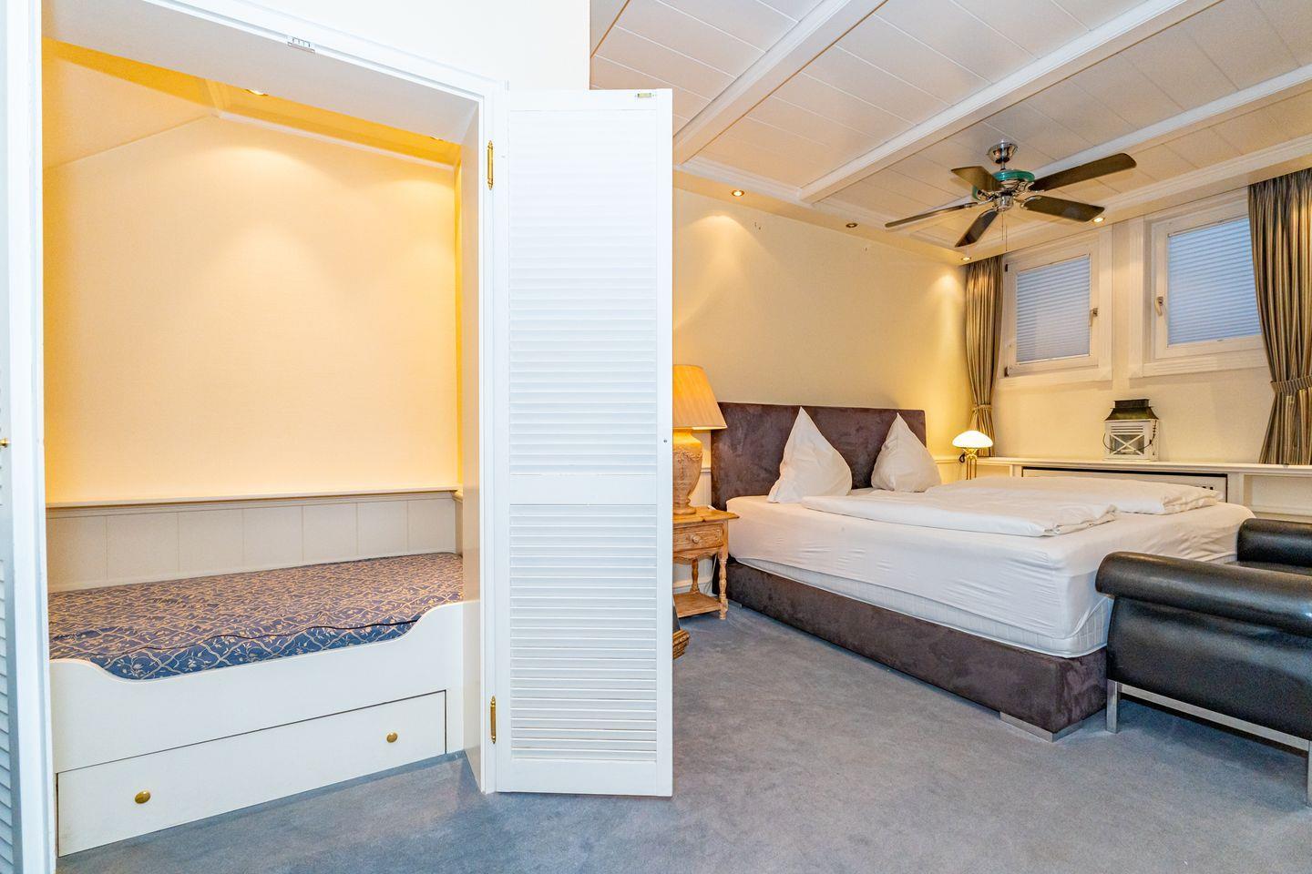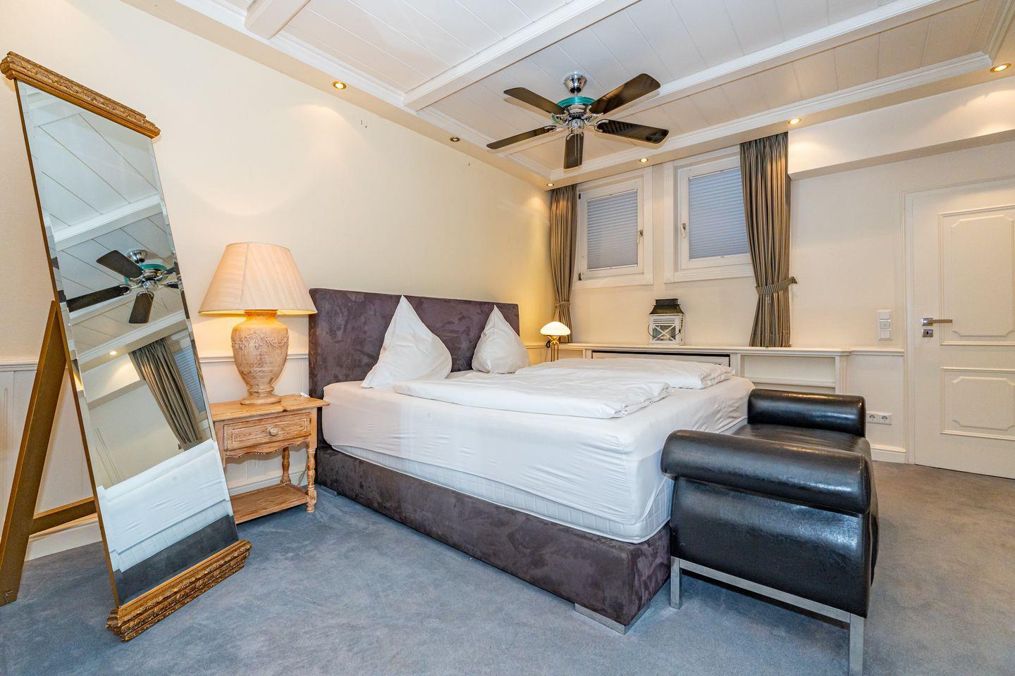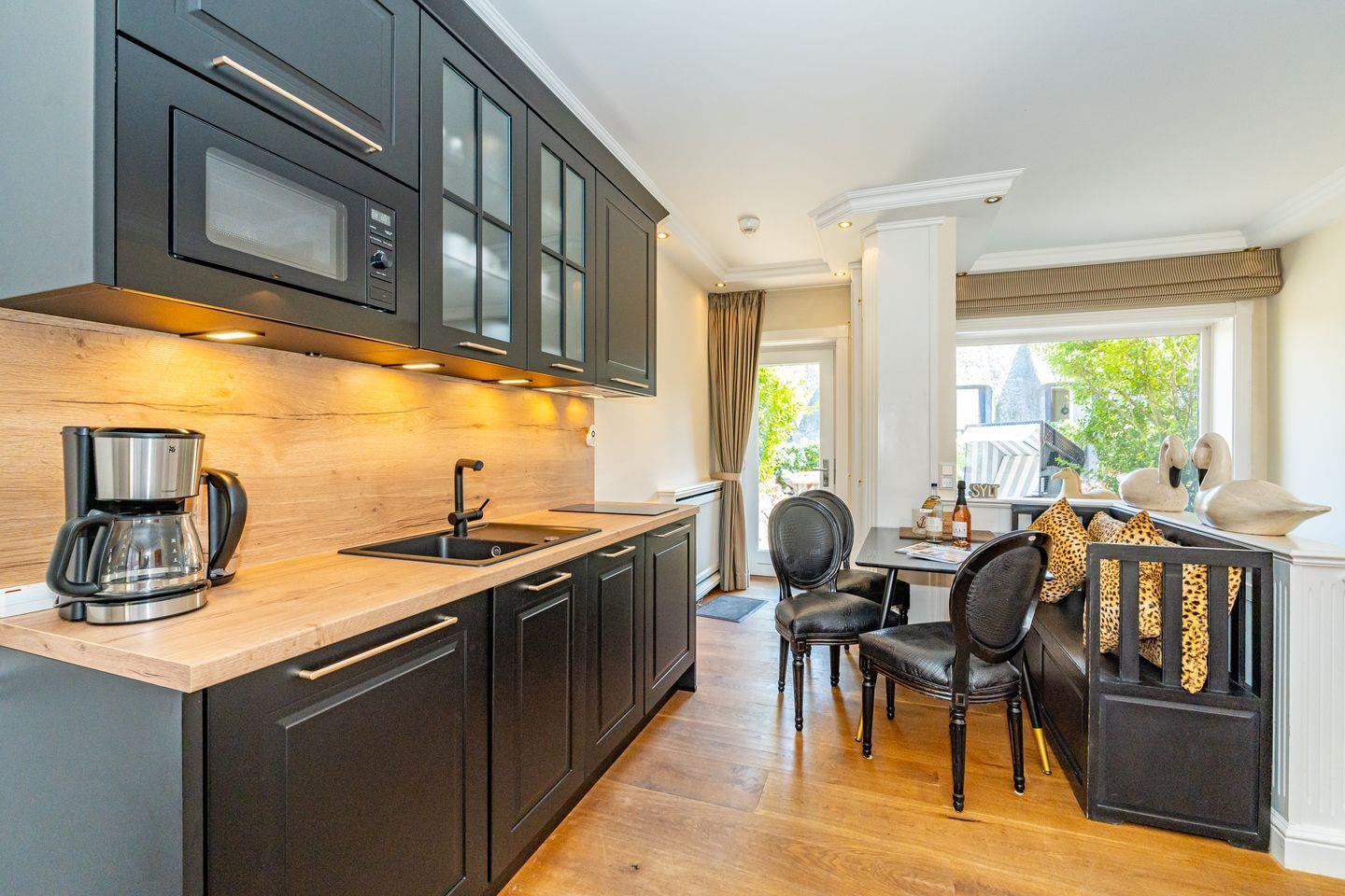 Die 2-Zimmer-Ferienwohnung verteilt sich über zwei Ebenen. Im Erdgeschoss der Ferienwohnung befindet sich der offene und helle Wohn- und Essbereich mit Couch, TV (Alle TV Geräte sind ausschließlich für eigene Streamingdienste nutzbar.) und Essplatz. Die voll ausgestattete Küche ist mit modernen Geräten wie einem Induktionsherd, Kühlschrank, Mikrowelle und sogar einer Spülmaschine ausgestattet, sodass Sie im Handumdrehen Ihr Lieblingsgericht zaubern können. Vom gemütlichen Wohn- und Essbereich haben Sie auch Zutritt zur nach Osten ausgerichteten Terrasse mit Gartenmöbeln und Strandkorb (saisonal). Über eine Treppe gelangen Sie in das Untergeschoss (Souterrain) der Wohnung, dort befindet sich das gemütliche Schlafzimmer mit Doppelbett und einem maritimen Kojenschrankbett (Länge ca. 170cm) für Kinder. Ein Highlight dieser Unterkunft ist das Badezimmer, das sowohl über eine große, offene Dusche als auch über eine Badewanne verfügt. Hier können Sie nach einem erlebnisreichen Tag an der frischen Luft entspannen und die Seele baumeln lassen. Ein Parkplatz gehört nicht zur Ferienwohnung, Sie können aber kostenfrei direkt an der Straße vor dem Haus parken. Im Haus befindet sich ein neu sanierter Wellnessbereich mit Pool und Saunen zur gemeinschaftlichen Nutzung.