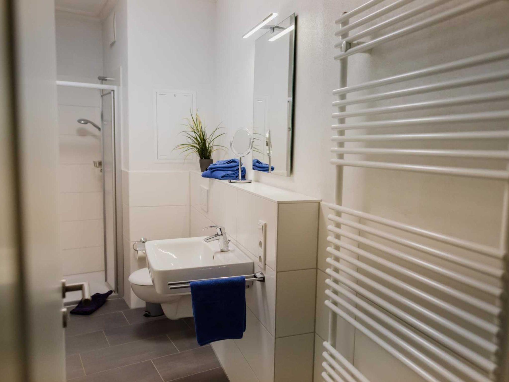 Das Duschbad mit WC verfügt über eine Klarglasduschkabine, die großzügige Spiegelanlage über dem Waschbecken ist beleuchtet. Ein im Duschbad eingebautes Radiogerät rundet den Komfort ab.