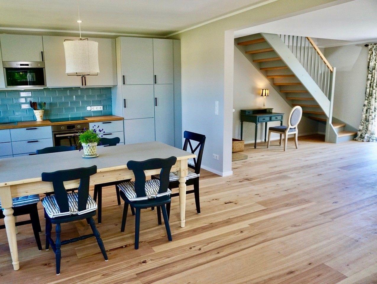 Der kombinierte Wohn- und Essbereich des Meierhus ist mit einem Kaminofen ausgestattet und grenzt an die offene Küche. Die Küche ist voll ausgestattet mit einer Mikrowelle, Induktionskochfeld, Backofen, Kühlschrank, Gefriermöglichkeit, Spülmaschine, Filterkaffeemaschine und Kaffeevollautomat, Wasserkocher, Toaster, Handrührgerät, Eierkocher, Raclette sowie Geschirr und Besteck.