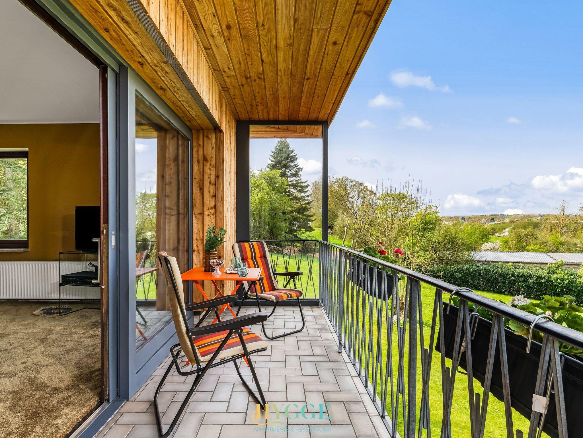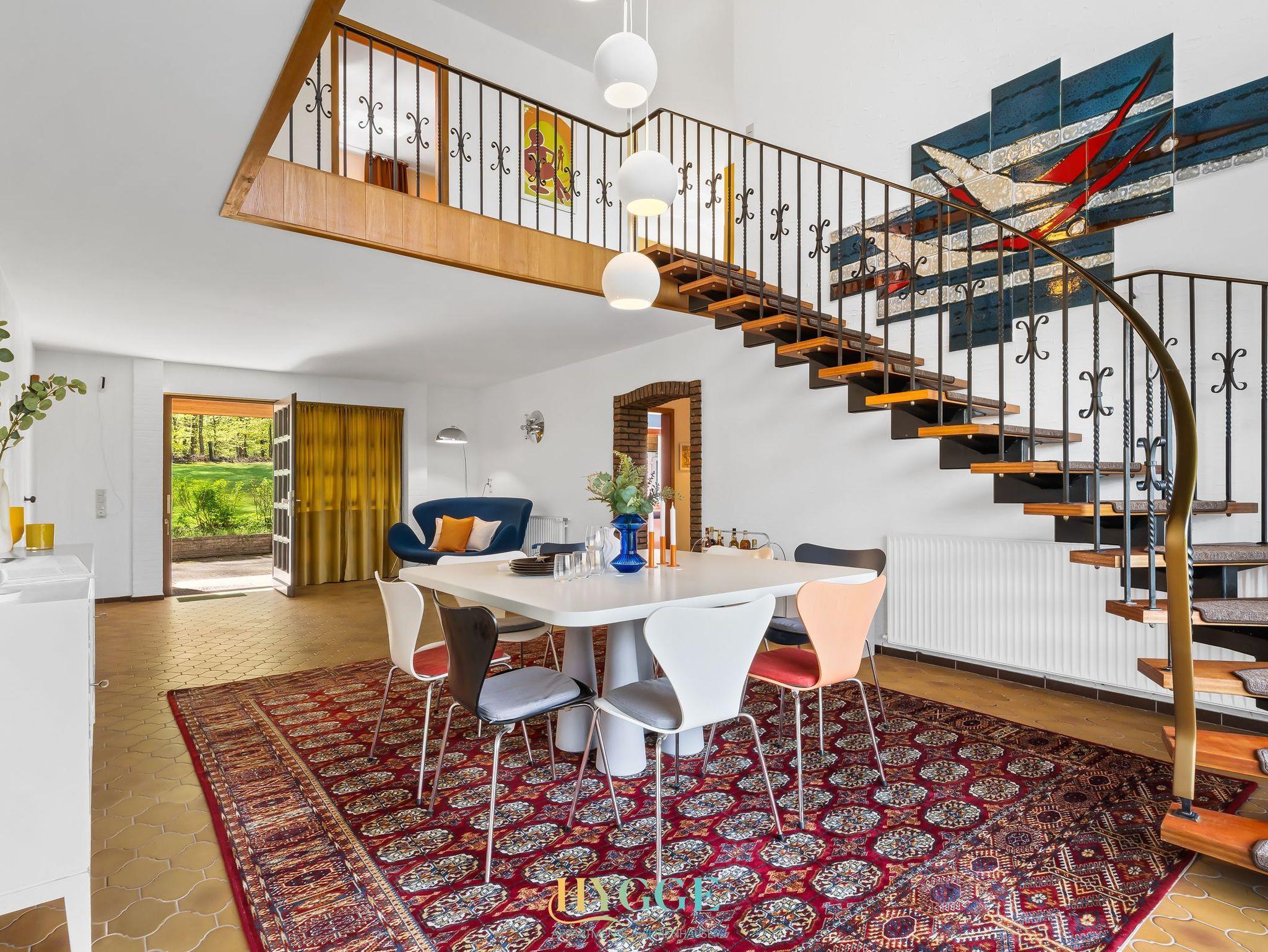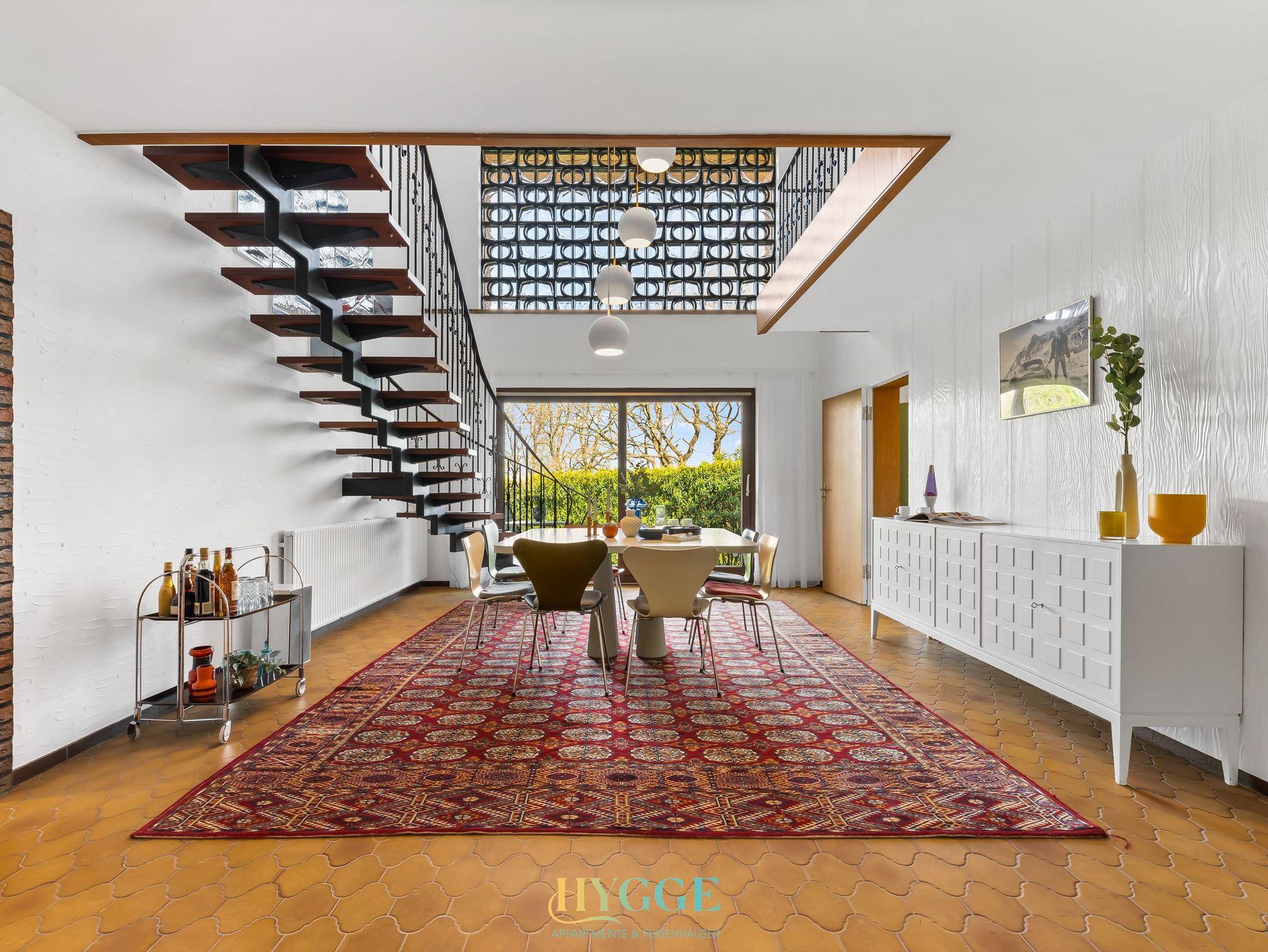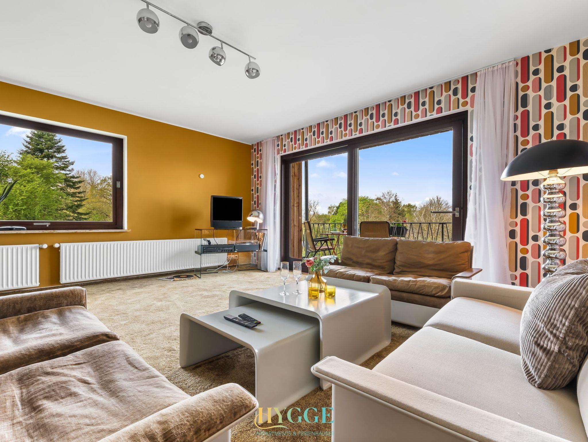 Über die große Treppen gelangen sie in den oberen Teil des 70er Jahre Bundgalow. Dort befindet sich das große Wohnzimmer mit Terrasse, Blick über die Felder und Annehmlichkeiten wie B&O Fernseher, Stereoanlage, Kamin, Ofen, Spirituosenbar und viel Platz.
