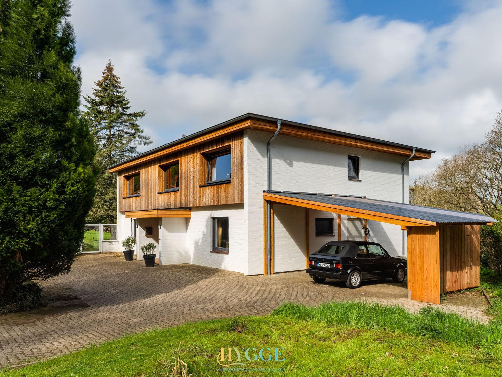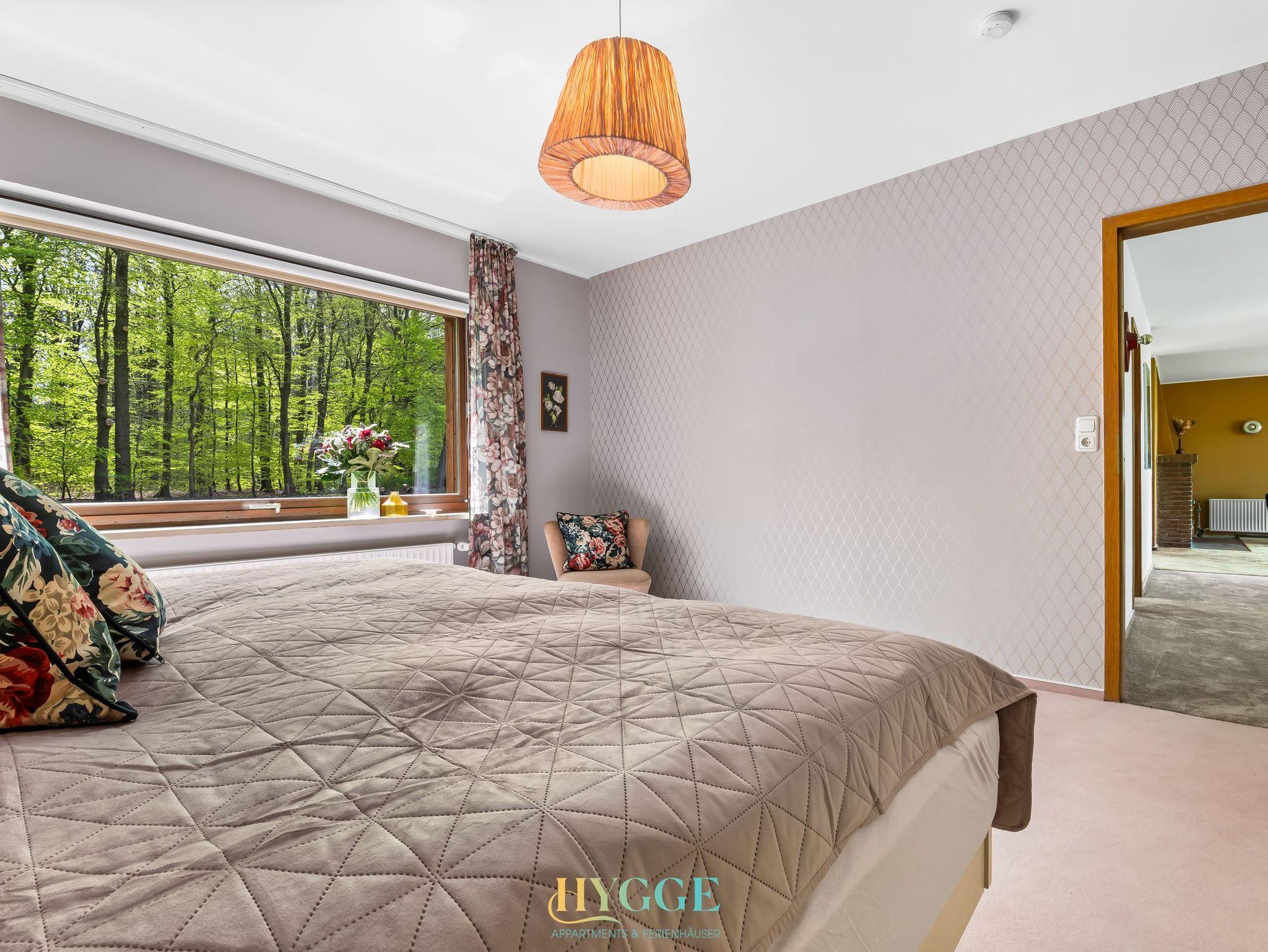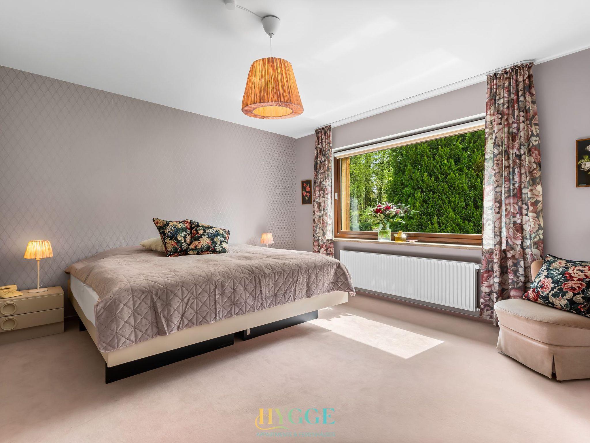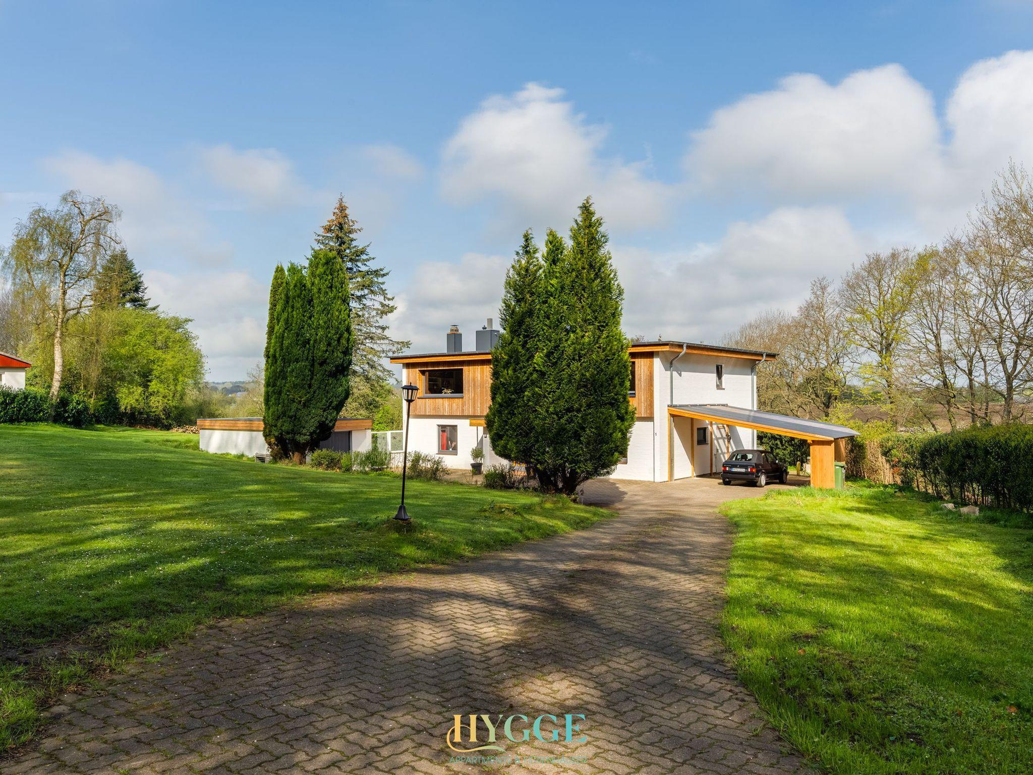 Über die große Treppen gelangen sie in den oberen Teil des 70er Jahre Bundgalow. Dort befindet sich das große Wohnzimmer mit Terrasse, Blick über die Felder und Annehmlichkeiten wie B&O Fernseher, Stereoanlage, Kamin, Ofen, Spirituosenbar und viel Platz.