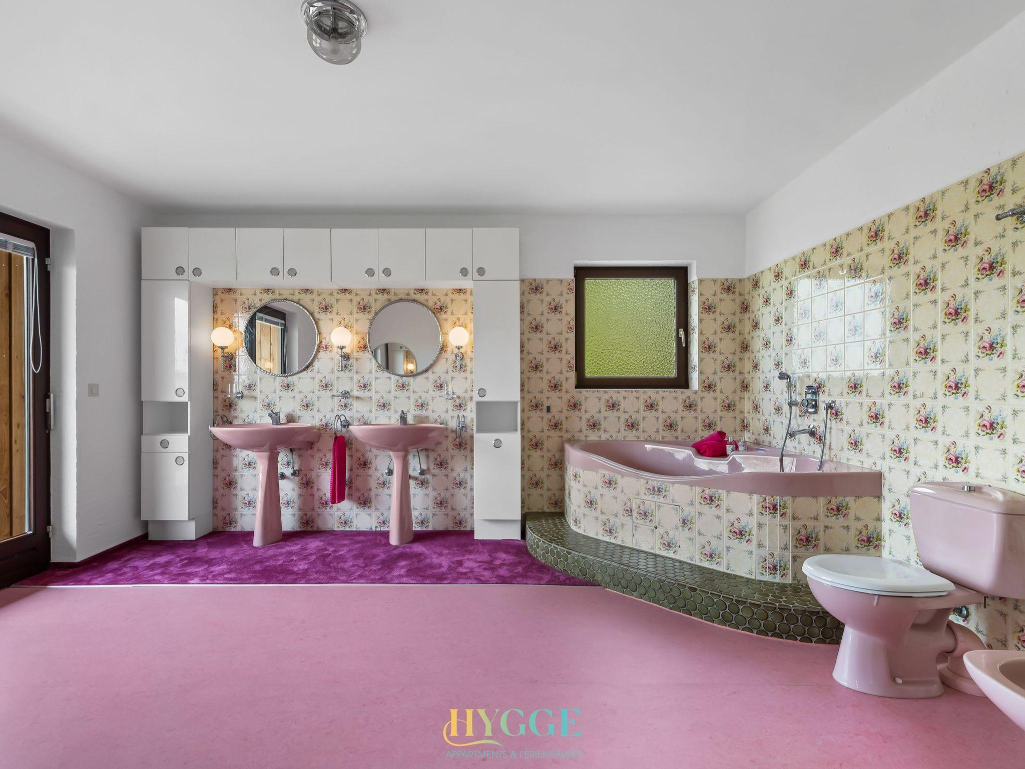 Daneben befindet sich das ABBA Zimmer mit zwei Einzelbett, sowie ein weitere Schlafzimmer im Stil der 70er Jahre. Highlight ist das große Badezimmer in Rosa mit Eckbadewann, zwei Waschbecken, BD, Toilette, Dusche und Infrarotsauna (ab Ende September 2025). Partys oder Feiern mit zusätzlichen Gästen, die nicht angemeldet wurden, sind in dem Haus untersagt und führen zur sofortigen Aufhebung des Mietvertrages. Die Kosten dafür trägt der Mieter.