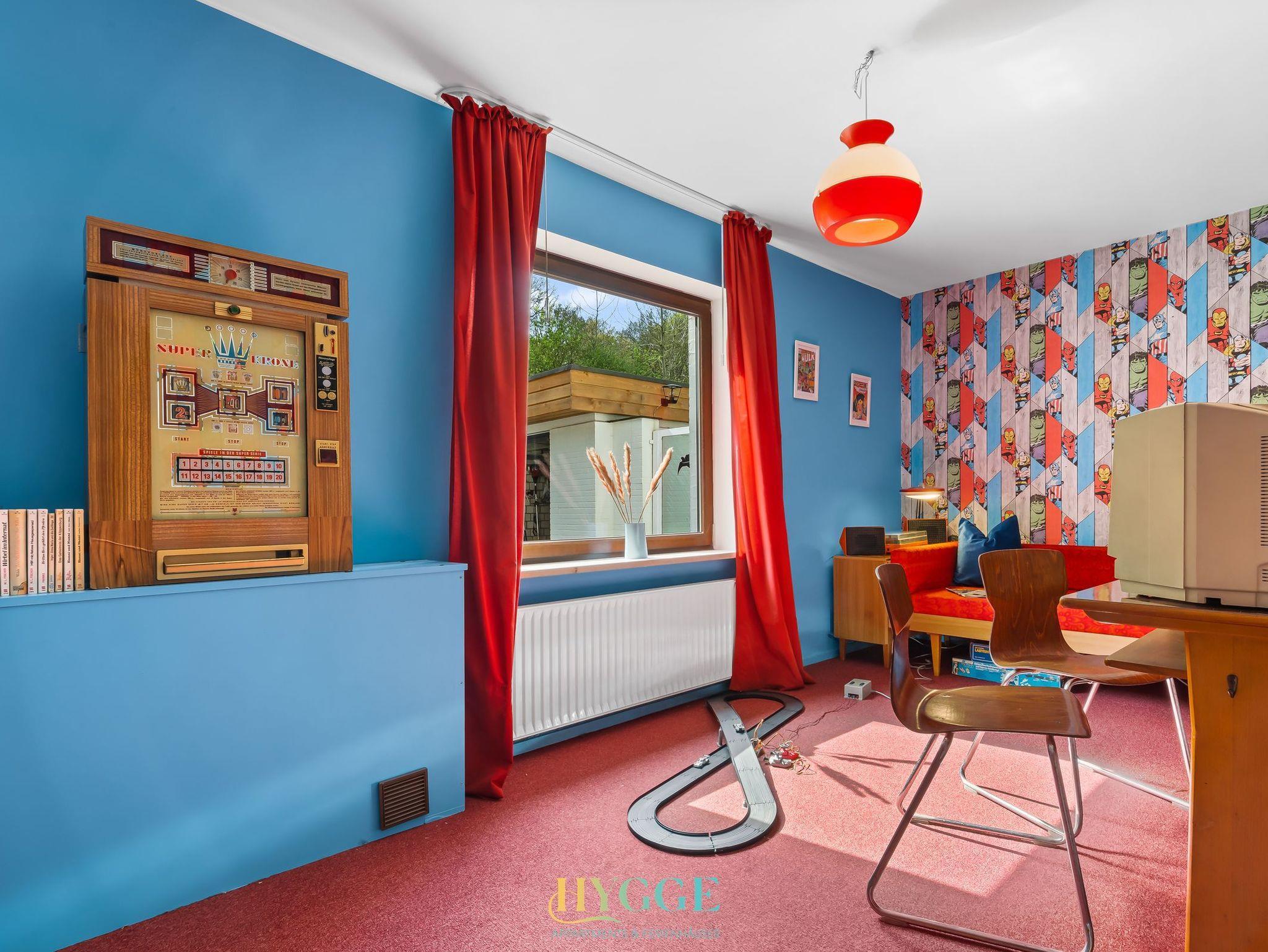 Das Haus verfügt über zwei Etagen. Du betrittst das Haus durch die Haustür in einen Licht durchfluteten Raum mit großzügigem Essbereich für acht Personen. Im hinteren Bereich zum Garten befindet sich die große 70er Jahre Küche mit original Geräten. Auf der gleichen Seite finden Sie das Dschungel Zimmer für eine Person und das 70er Jahre Bad mit Doppelwaschbecken und Dusche. Auf der linken Seite befinden sich das Marvel Kinder- & Spielzimmer sowie zum Garten gelegen, dass einzigartige Schlafzimmer im Tiger Style mit Jetbett.