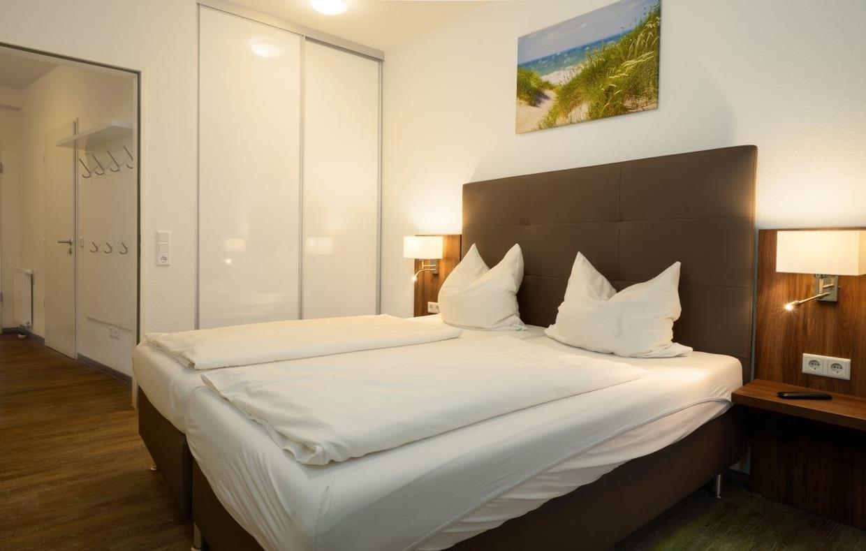 3-Zimmer-Ferienwohnung für 4-6 Personen, 72 m², 2 Schlafzimmer mit Doppelbett, Wohn-Schlafraum mit Doppelbettcouch, separater Essplatz, voll ausgestatteter Küchenbereich mit Geschirrspüler, Bad mit Dusche/WC, Terrasse, SAT-TV, W-LAN. Sky Bundesliga HD, Sport1 HD, Cinema HD, Disney Cinemagic.