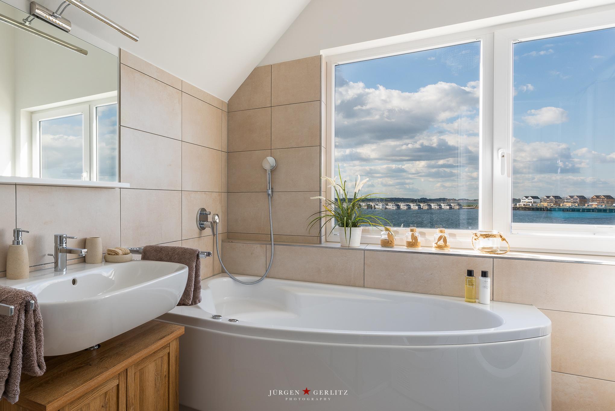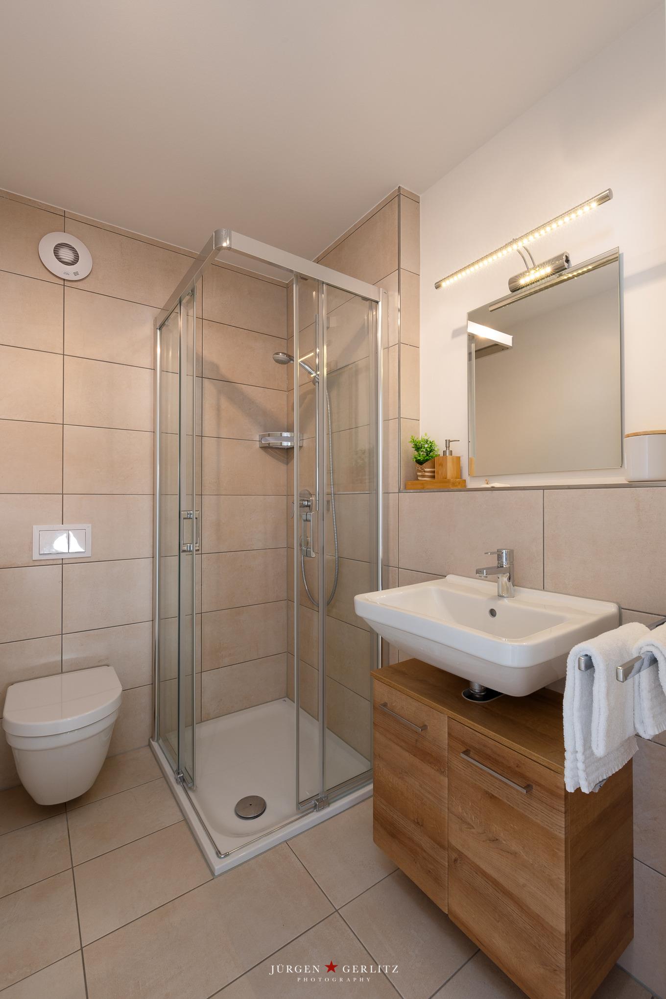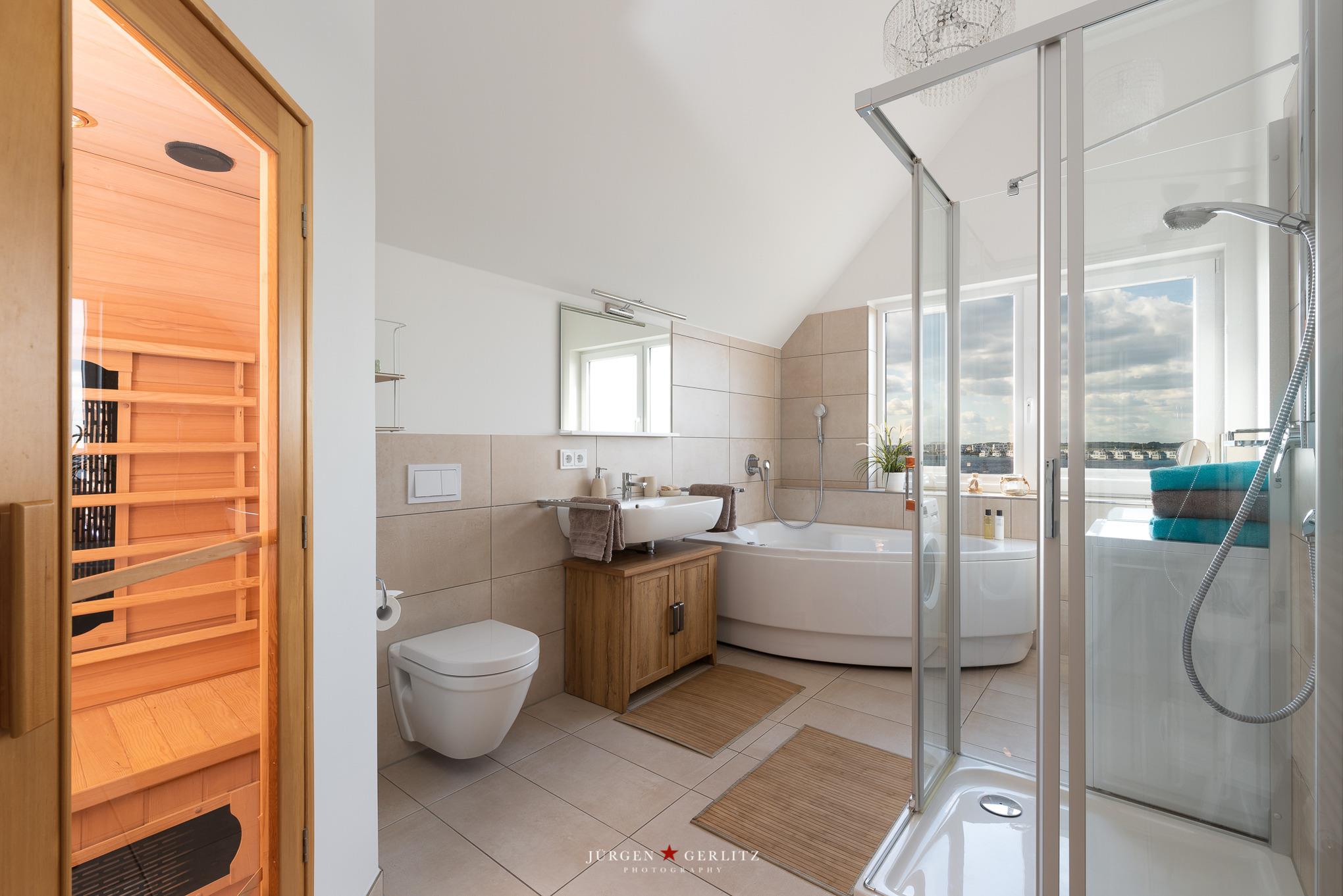 In dem großzügigen Hauptbadezimmer befinden sich eine Whirlwanne, eine Dusche und eine Infrarotsauna mit Musikanlage. Zusätzlich befindet sich ein Duschbad in der unteren Wohnebene.