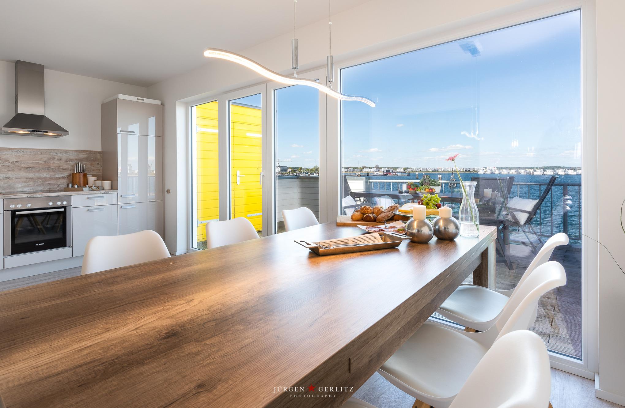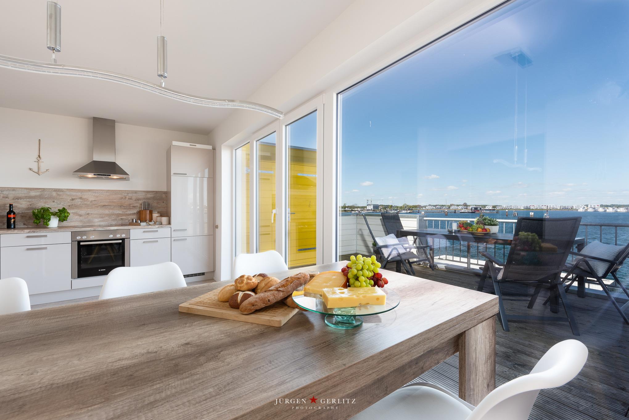 Die Wohnung ist mit einem Essbereich und einer neuen und modernen Küche ausgestattet. Von dort haben Sie einen direkten Hafenblick. Das lichtdurchflutete Wohnzimmer ist offen gehalten und nach Süden ausgerichtet. Zu drei Seiten des Hauses befinden sich Balkone, so dass Sie je nach Wind und Sonne den besten Platz finden. Auf der Hauptterrasse steht Ihnen ein Elektrogrill von Napoleon zur Nutzung zur Verfügung.