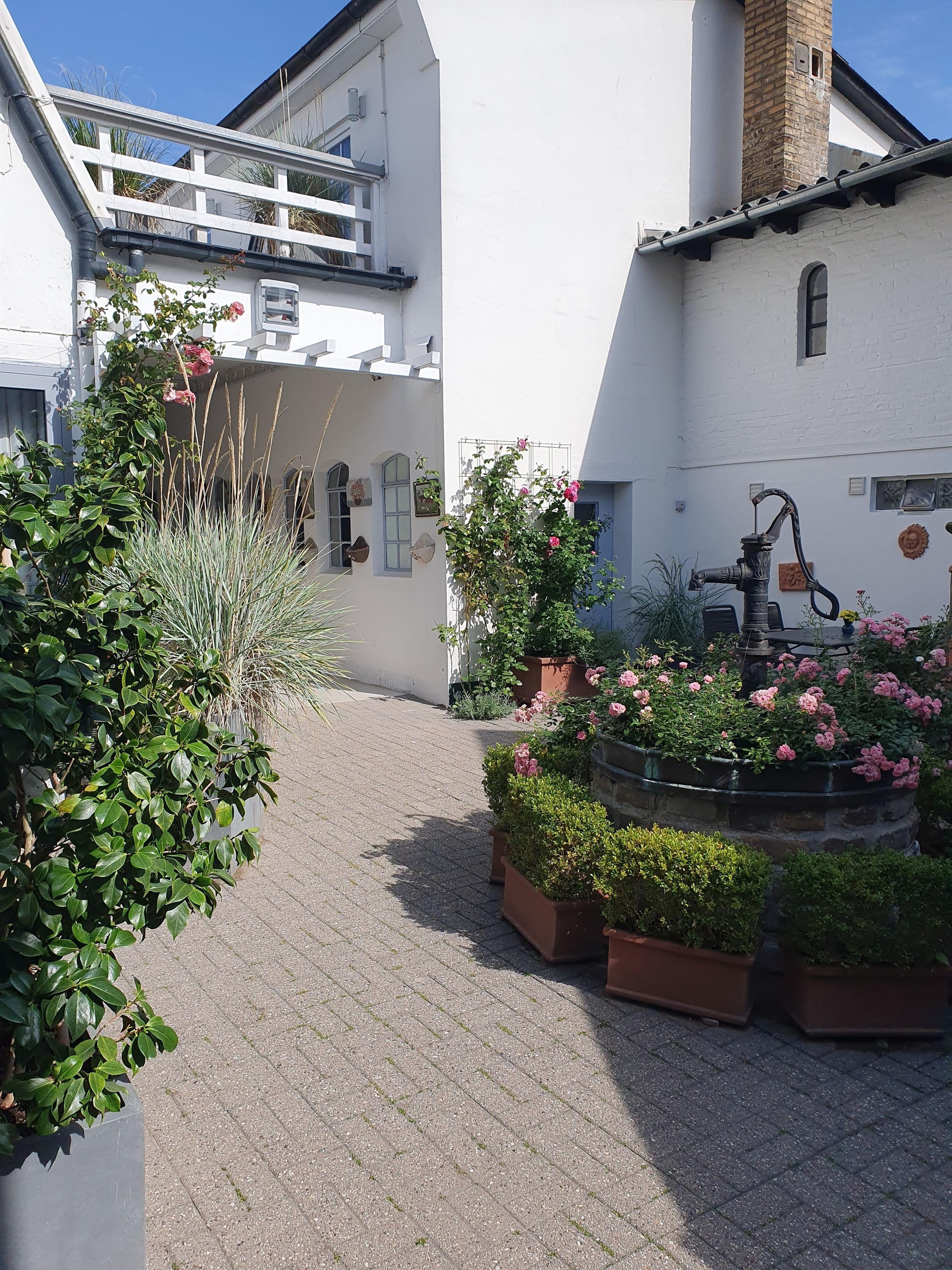 Die Südseite des Gebäudekomplexes reiht sich als Stadthaus in die Häuserfronten der Mühlenstrasse ein, die Nordseite grenzt an die Straße Schanze. Hier befindet sich der Zugang zur Ferienwohnung Kappeln 334 sowie zum sehr schön gestalteten Innenhof, Rosen umrankt und mit Brunnen, Strandkorb sowie Sitzecken- eine Oase mitten in Kappeln.