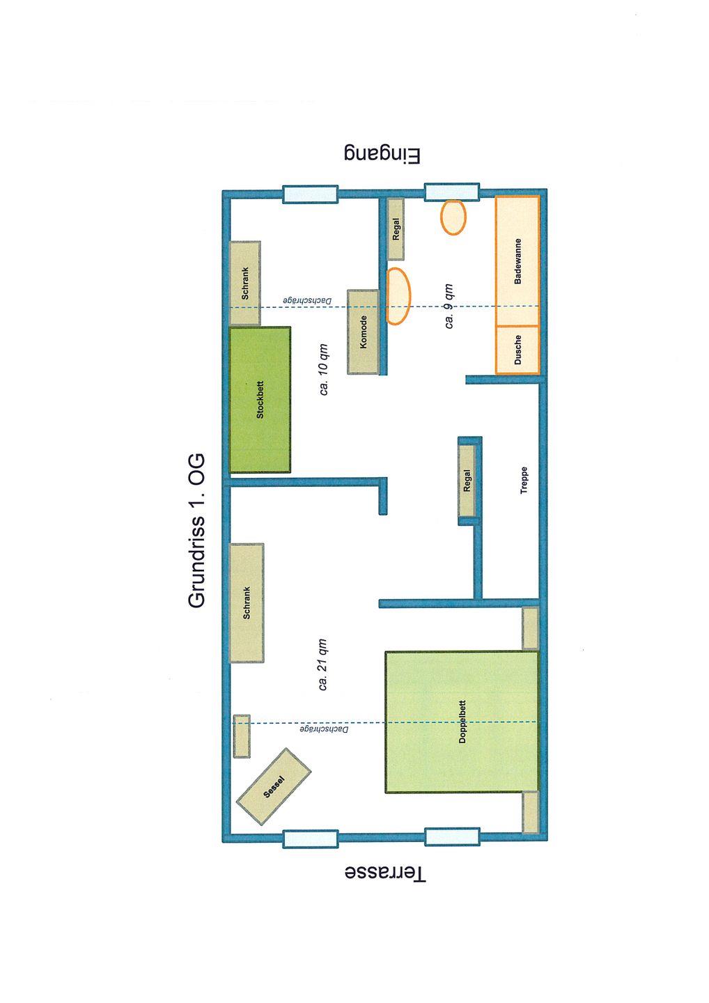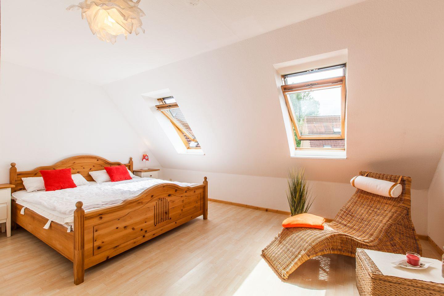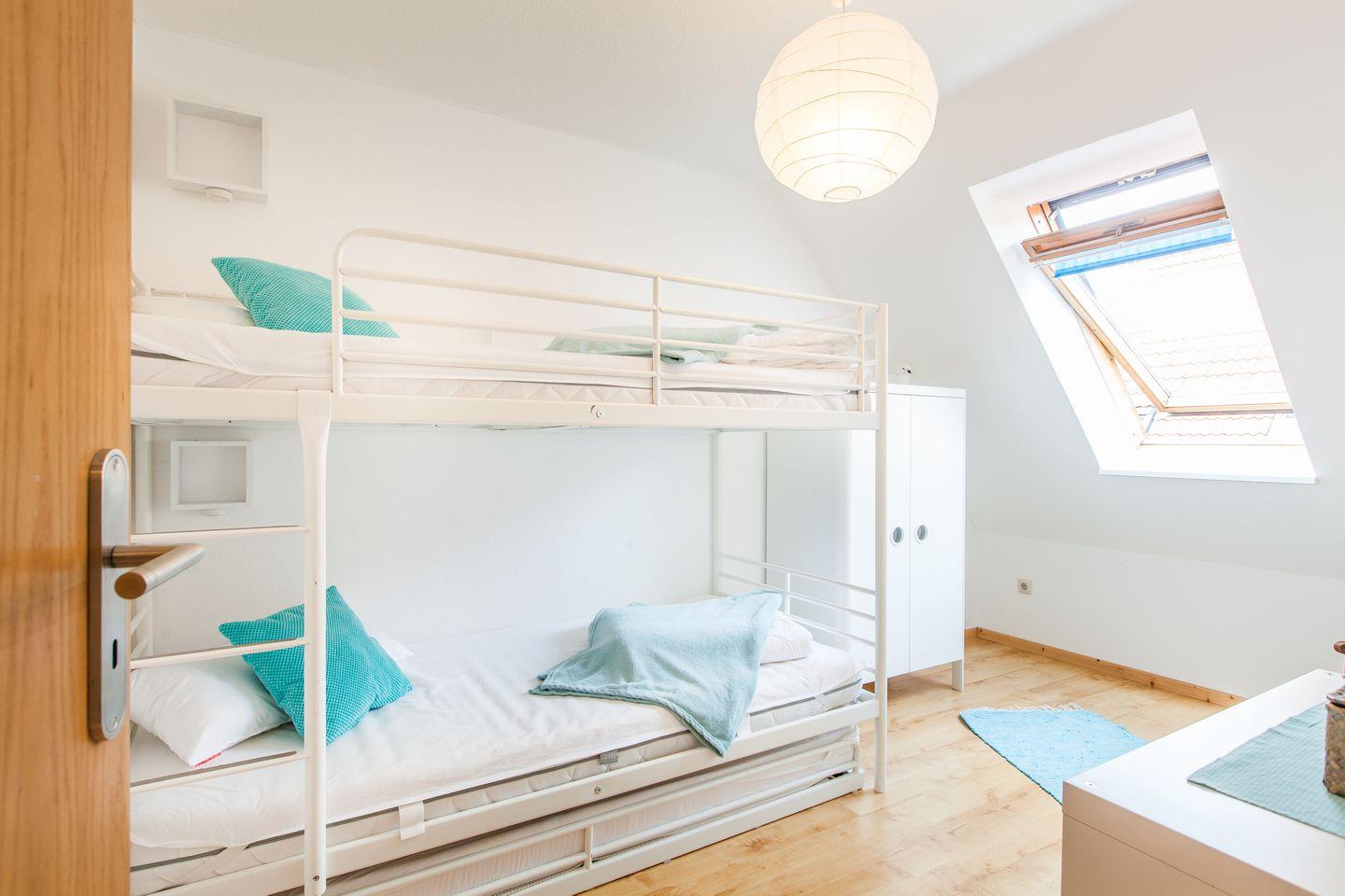 Es gibt 2 Schlafzimmer im Obergeschoss: Eins mit Doppelbett (2x 90x200 cm) und eins mit Etagenbett, sowie einem Einzelbett.