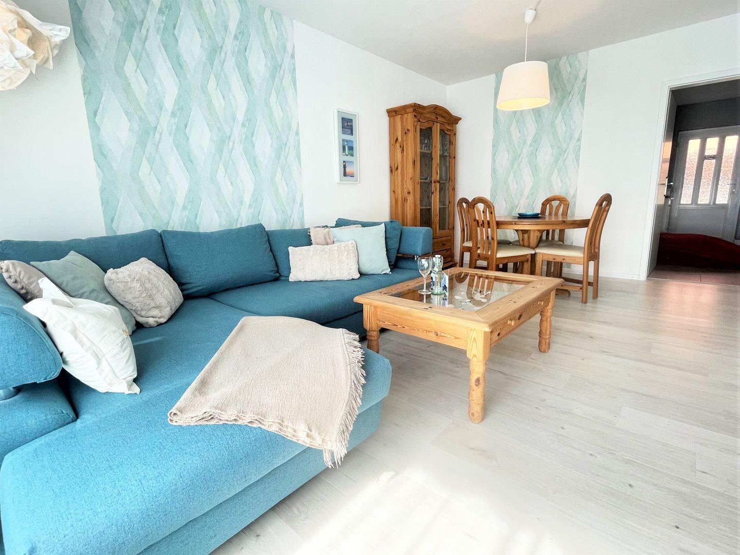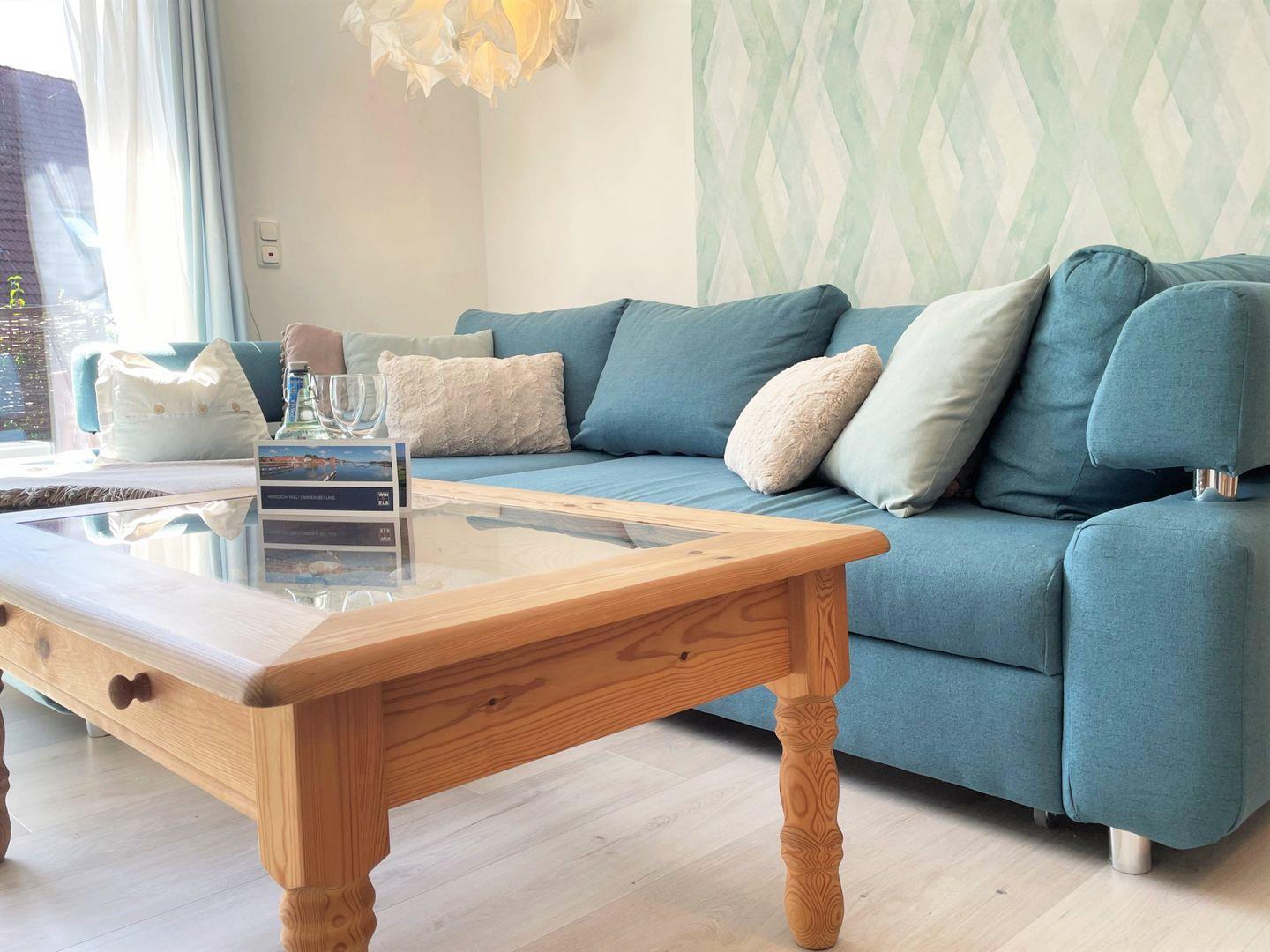 Der große Wohn- und Essbereich verfügt über eine gemütliche Sofaecke mit TV und einen Esstisch.