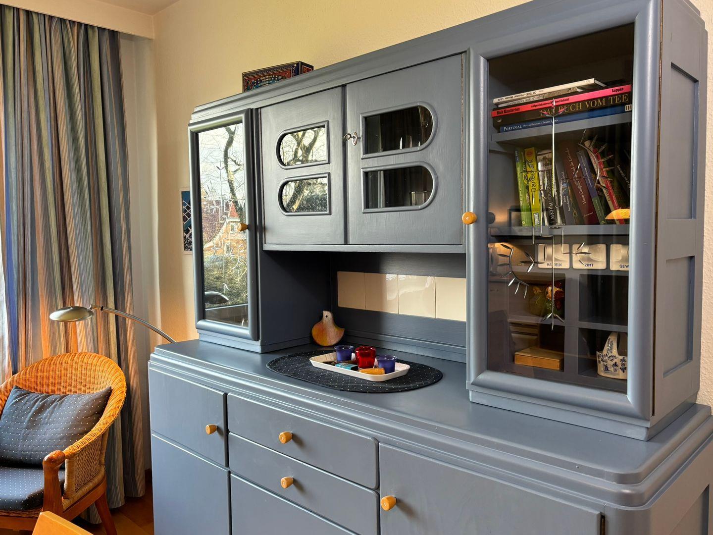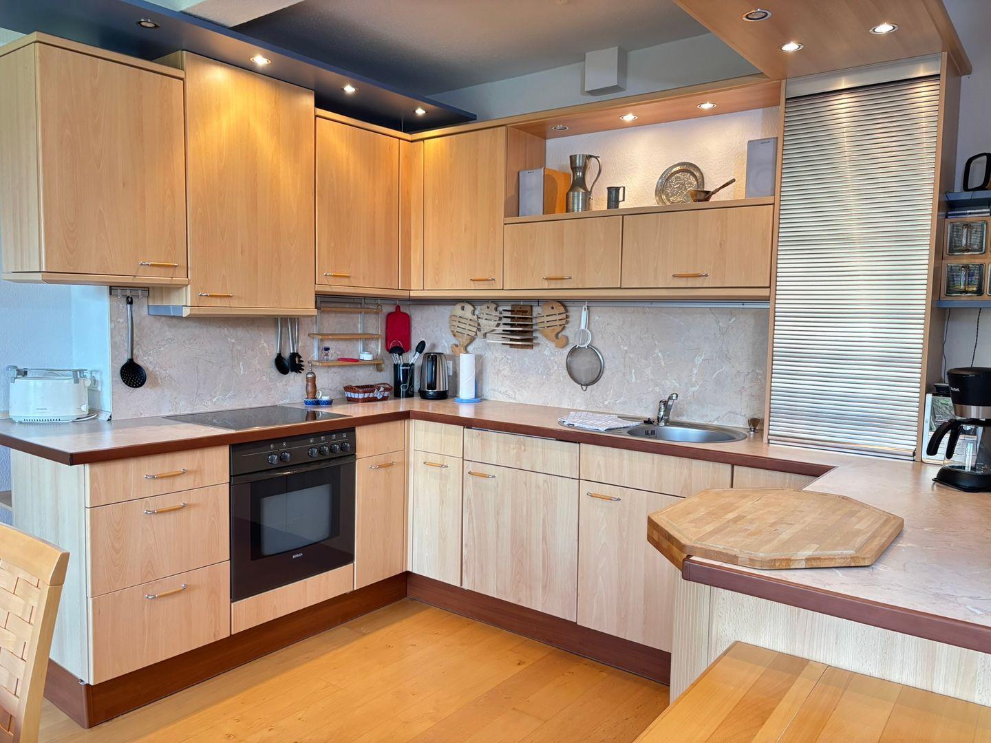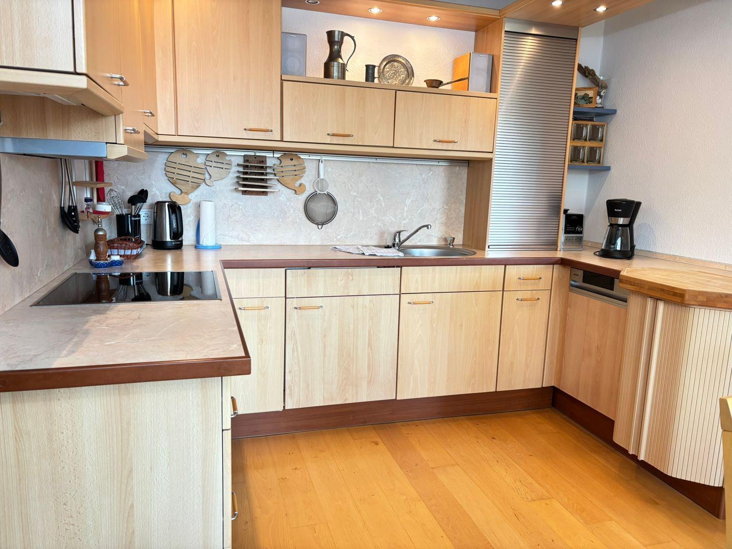 Der großzügige Wohn- und Essbereich lädt zum Verweilen ein. Hier finden Sie einen Esstisch, ein Sofa und einen Schreibtisch/Sekretär, ideal für kleine Arbeiten oder Urlaubsplanungen. Die angrenzende offene Küche ist funktional ausgestattet mit einem Cerankochfeld, Elektrobackofen, kleinem Kühlschrank mit Gefrierfach und einer Spülmaschine. Für den perfekten Start in den Tag stehen Ihnen eine Filterkaffeemaschine, Wasserkocher, Toaster und Eierkocher zur Verfügung.