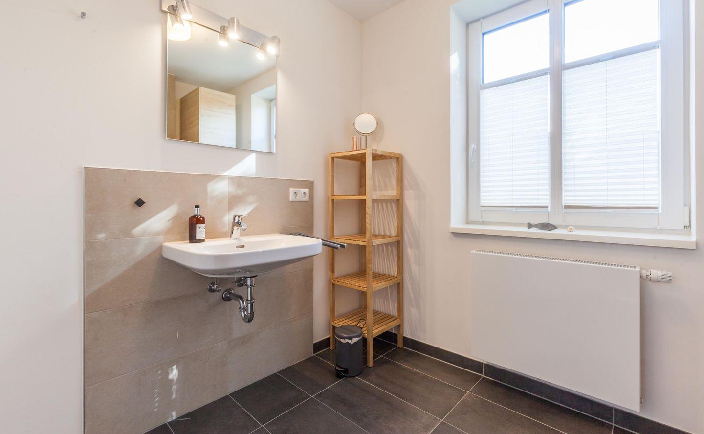Das wohlige Bad bietet eine Glasdusche mit bequemer Einstiegshöhe.