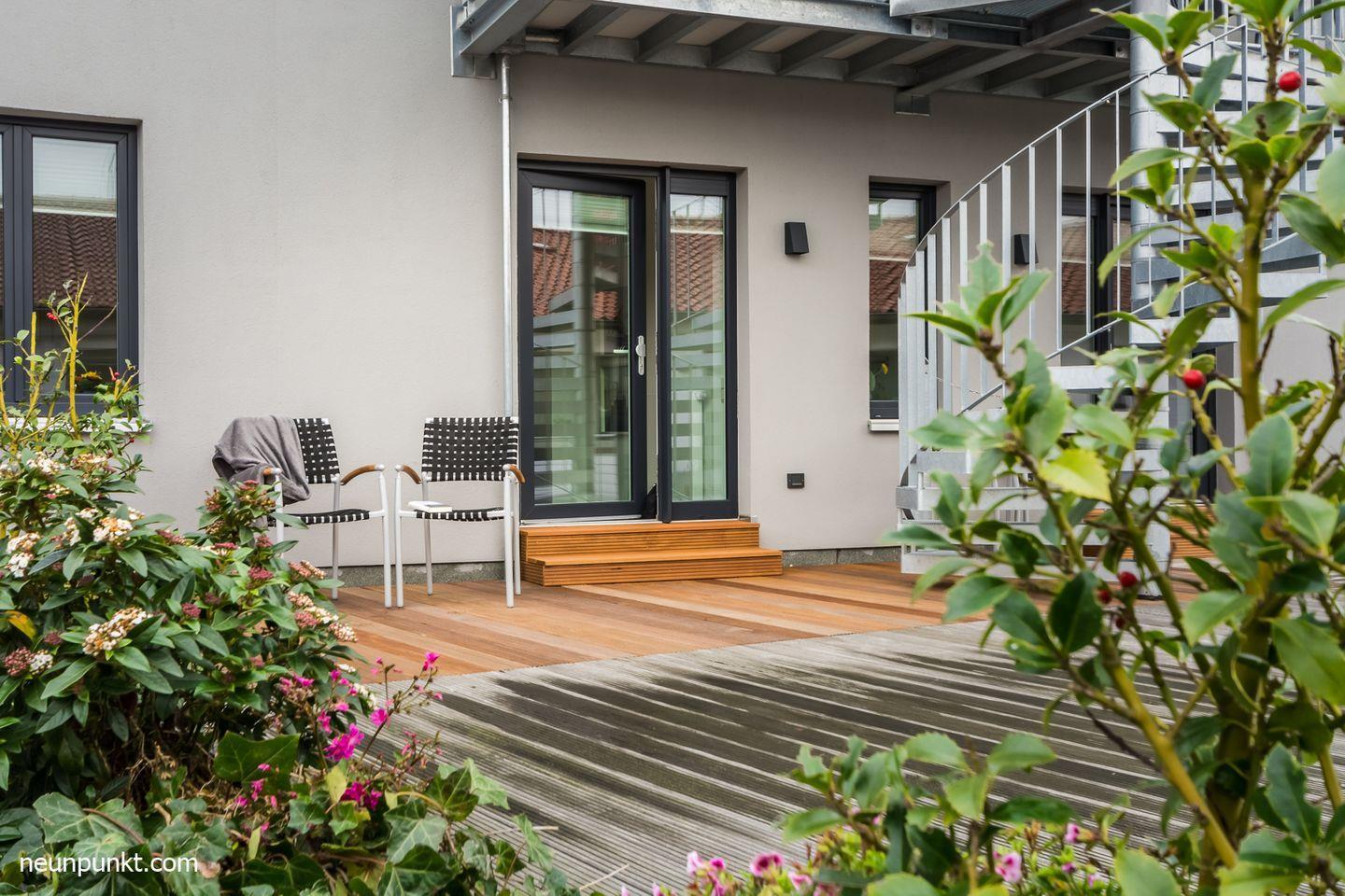 Zur Ferienwohnung gehört eine Terrasse mit Bestuhlung und einem Sonnenschirm.