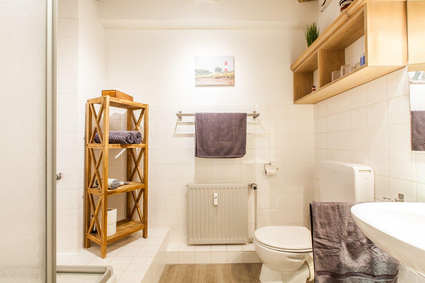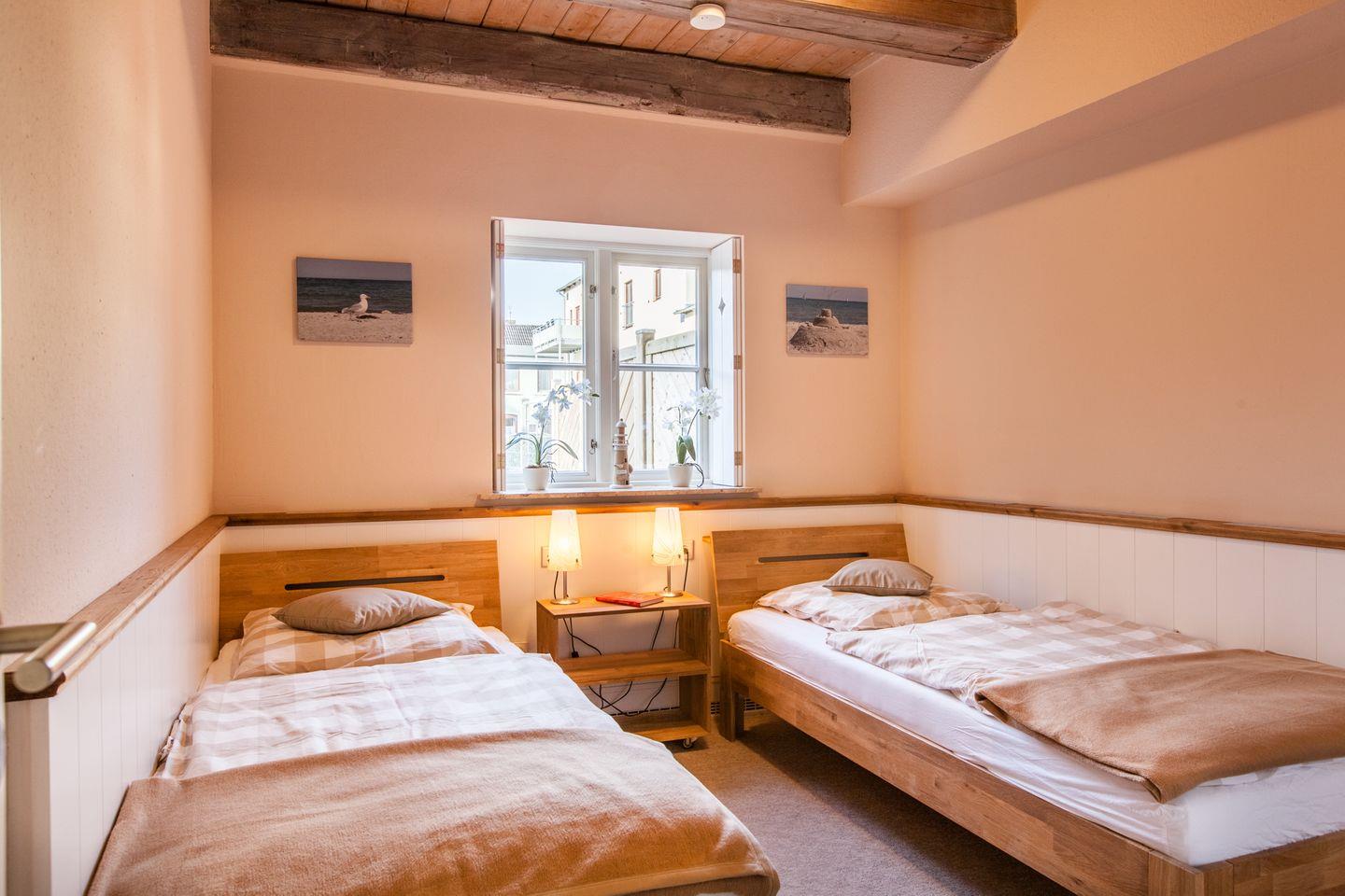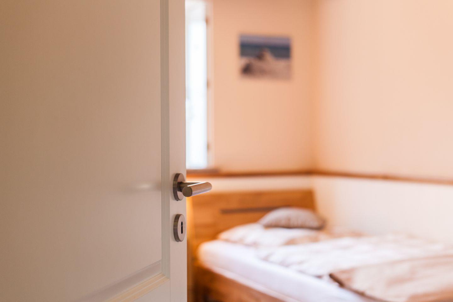 Sie besteht aus einem großzügigen Wohn-/ Essraum mit offener Einbauküche, ein Schlafzimmer mit Doppelbett (2x 80x200 cm), ein weiteres Schlafzimmer mit 2 Einzelbetten (2x 90x200 cm), ein Duschbad und einem kleinen Abstellraum mit Bügelbrett/-eisen.