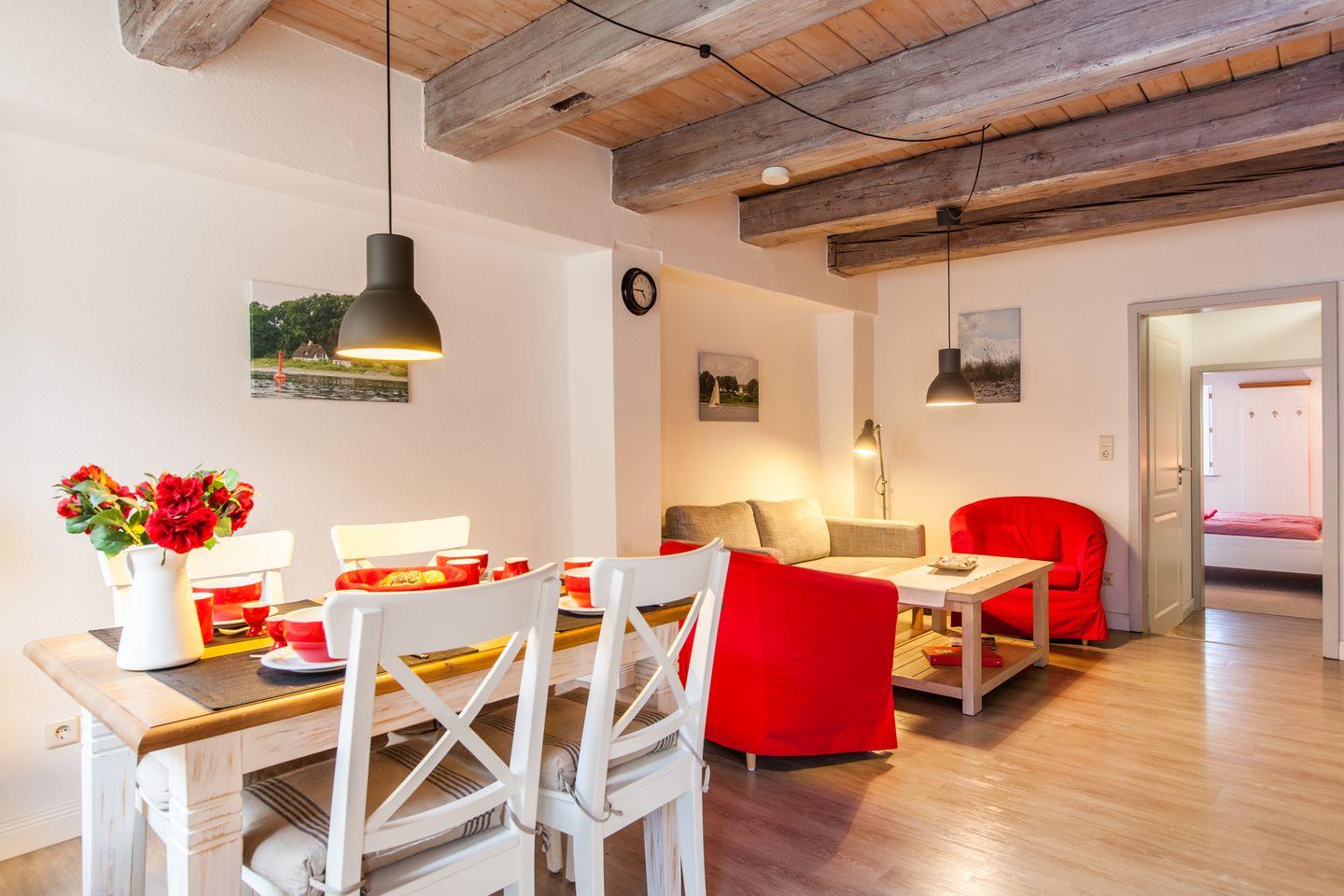 Die Ferienwohnung verleiht mit ihren Deckenbalken und Fensterladen einen gemütlichen Landhaus-Wohnstil.
