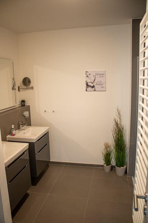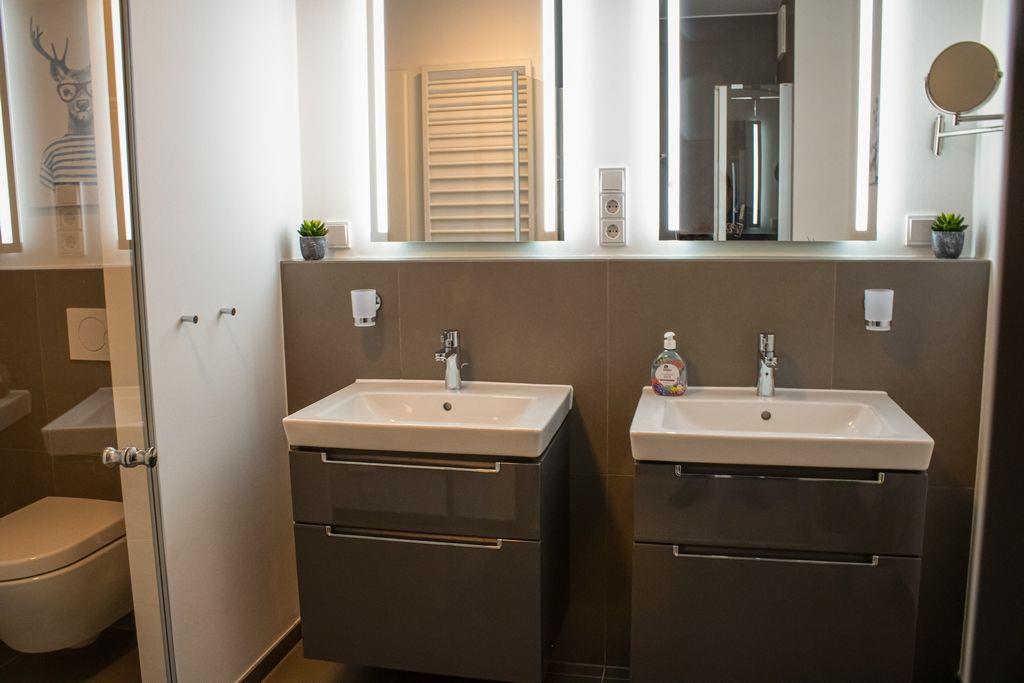Das moderne Badezimmer ist mit einer ebenerdigen Dusche und zwei Waschtischen ausgestattet, und optional können Sie Wäschepakete (Bettbezüge und Handtücher) gegen Gebühr hinzubuchen.