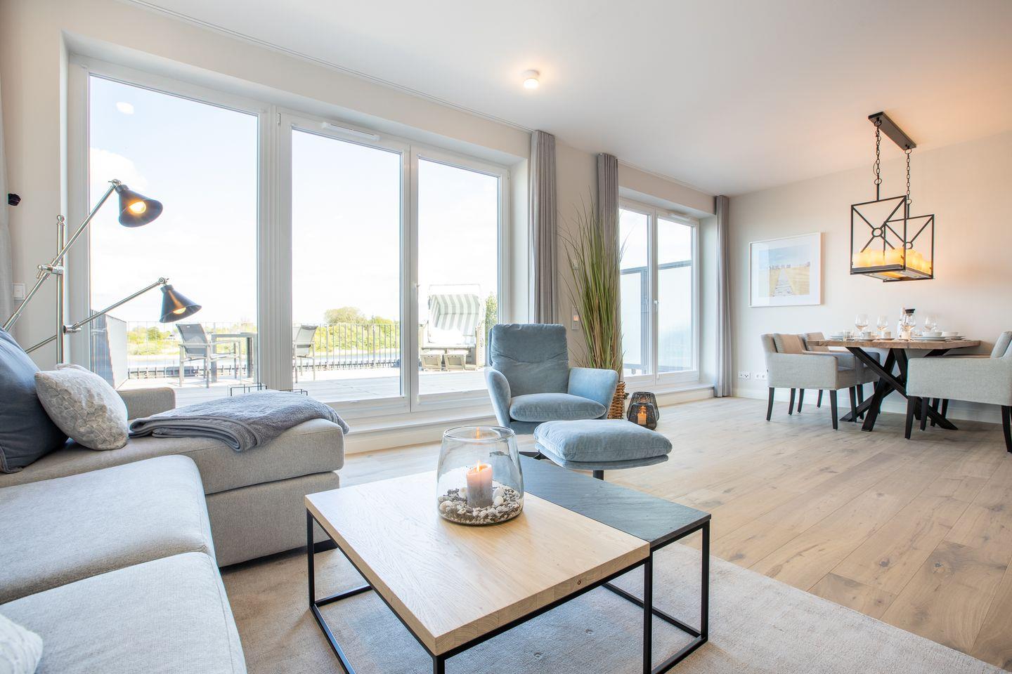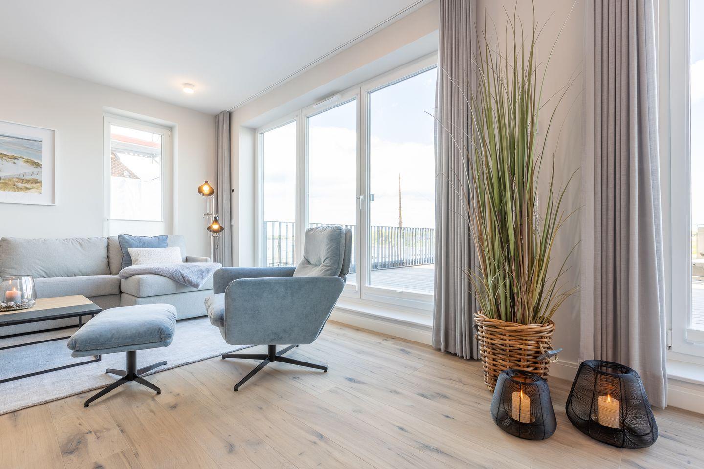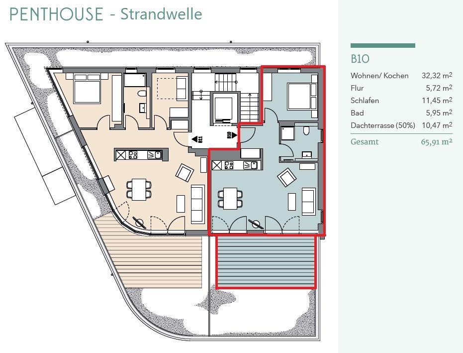Das Highlight bildet die großzügige, möblierte Dachterrasse (Strandkorb, Gartenmöbel, Sonnenliegen, Markise, Elektrogrill) mit direktem Schleiblick. Die Strandwelle ist für zwei Erwachsene konzipiert.