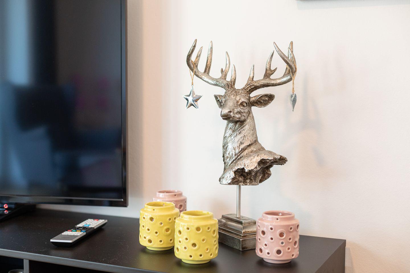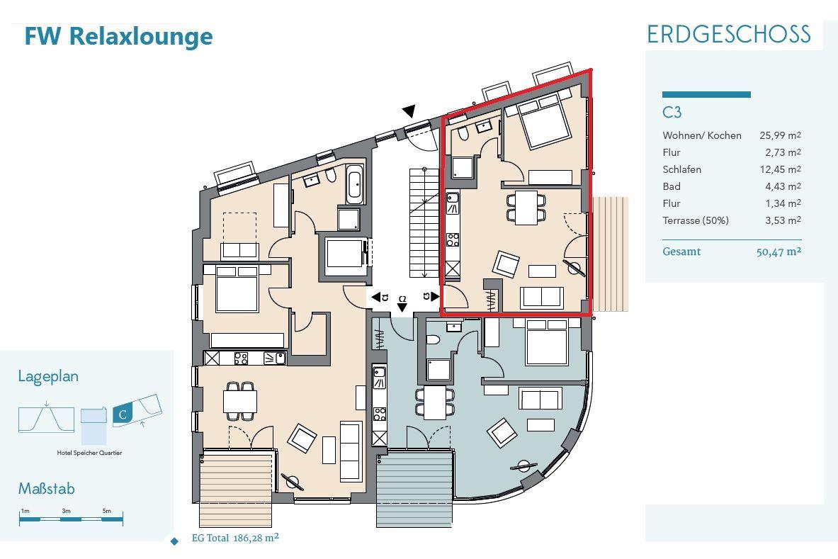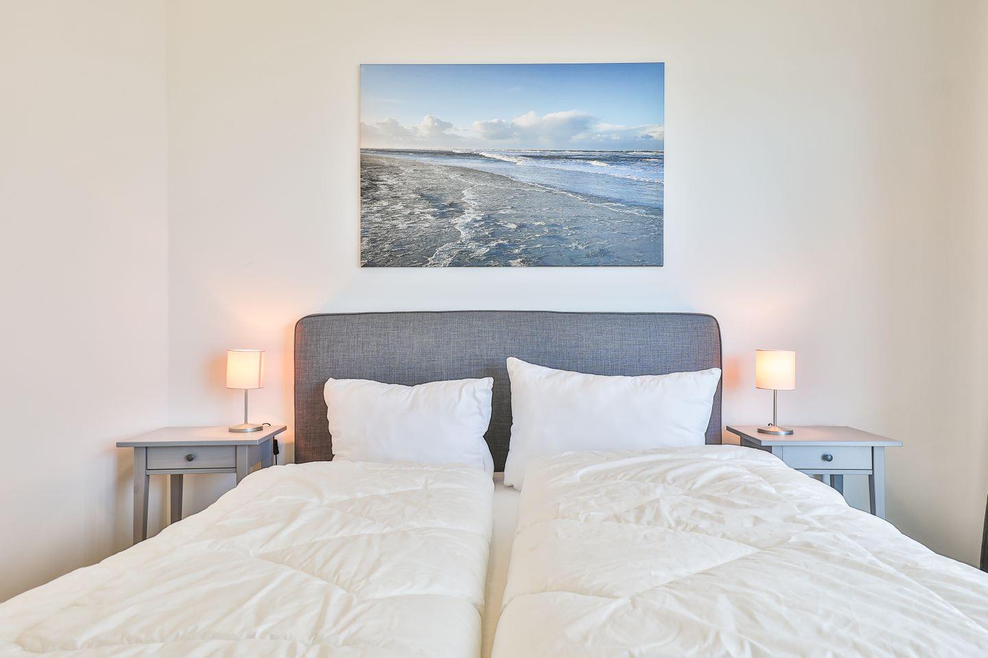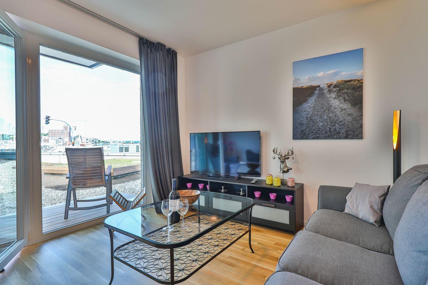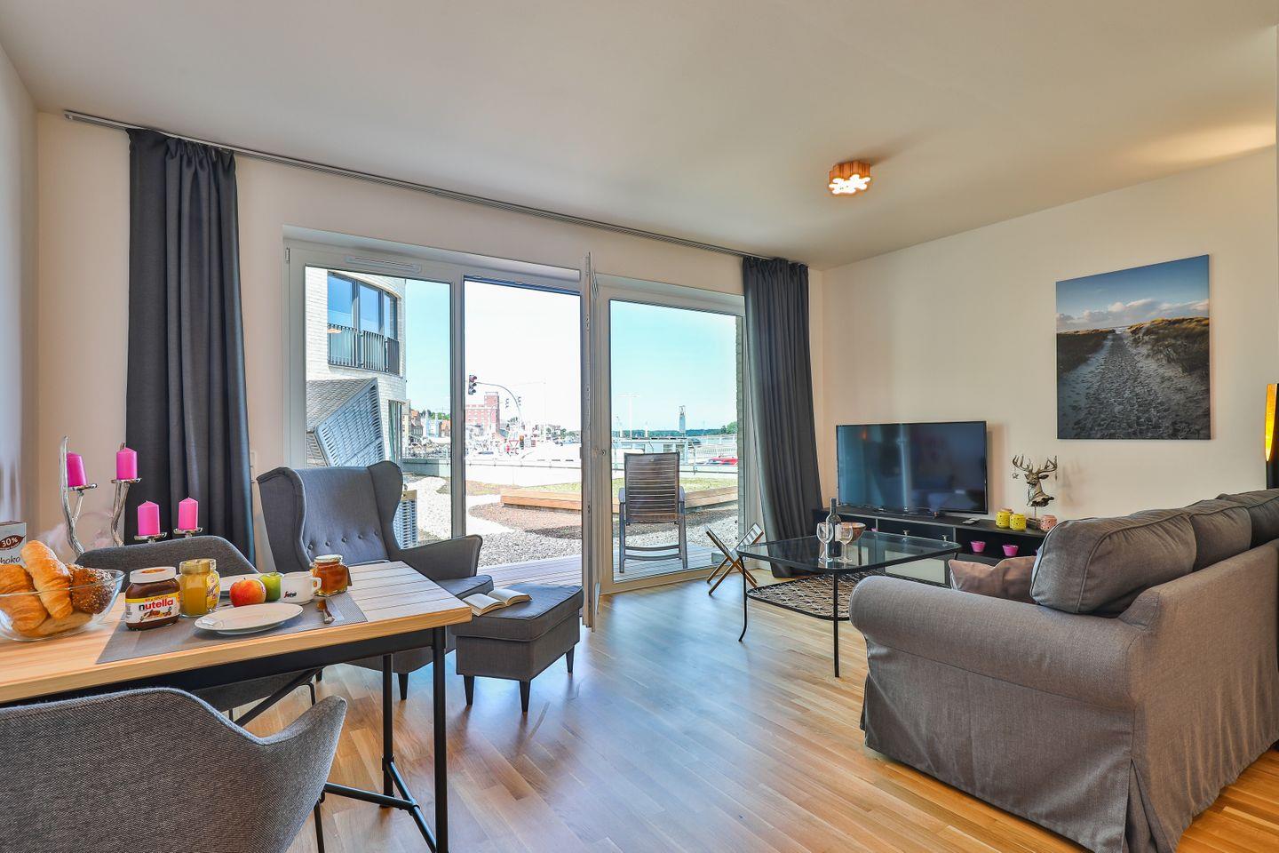 Desweiteren befindet sich hier der Zugang zur Terrasse der Wohnung. Diese ist mit Gartenmöbeln, einem Sonnenschirm und mit einem Strandkorb bestückt.