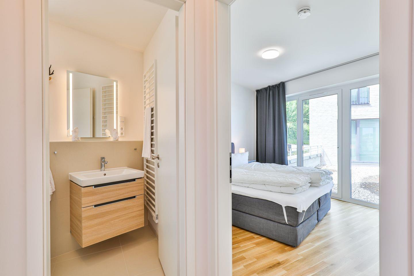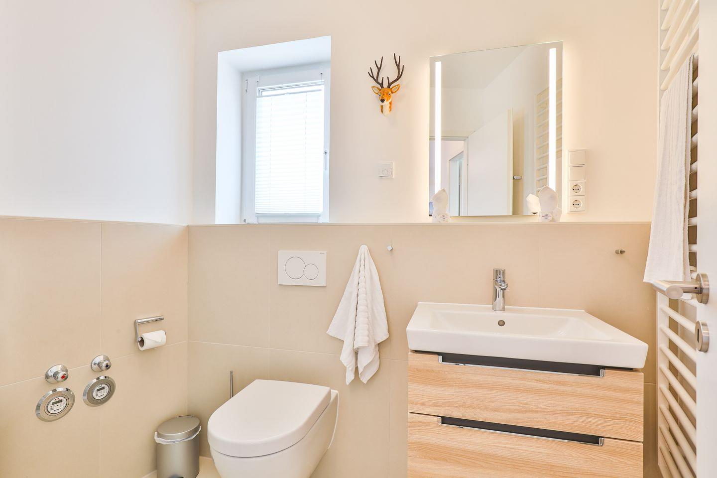 Das Tageslicht-Badezimmer bietet eine ebenerdige Dusche und weitere moderne Ausstattungen für die tägliche Nutzung.