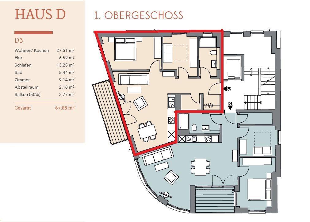 Die 68qm Wohnung liegt im 1. Obergeschoss des Hauses und besteht aus drei Zimmern.