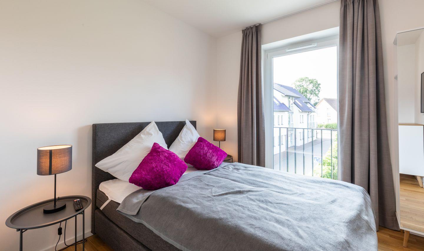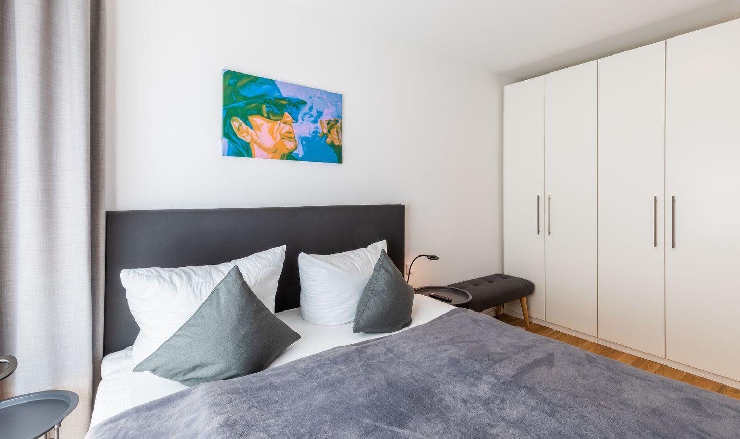 Angrenzend an den Wohn-/ Essbereich liegen die beiden Schlafzimmer der Wohnung. Das Hauptschlafzimmer ist mit einem Doppelbett der Größe 180x200 cm, einem Kleiderschrank und einem Fernsehgerät ausgestattet. Das zweite Schlafzimmer ist mit einem Einzelbett der Größe 140x200 cm versehen.