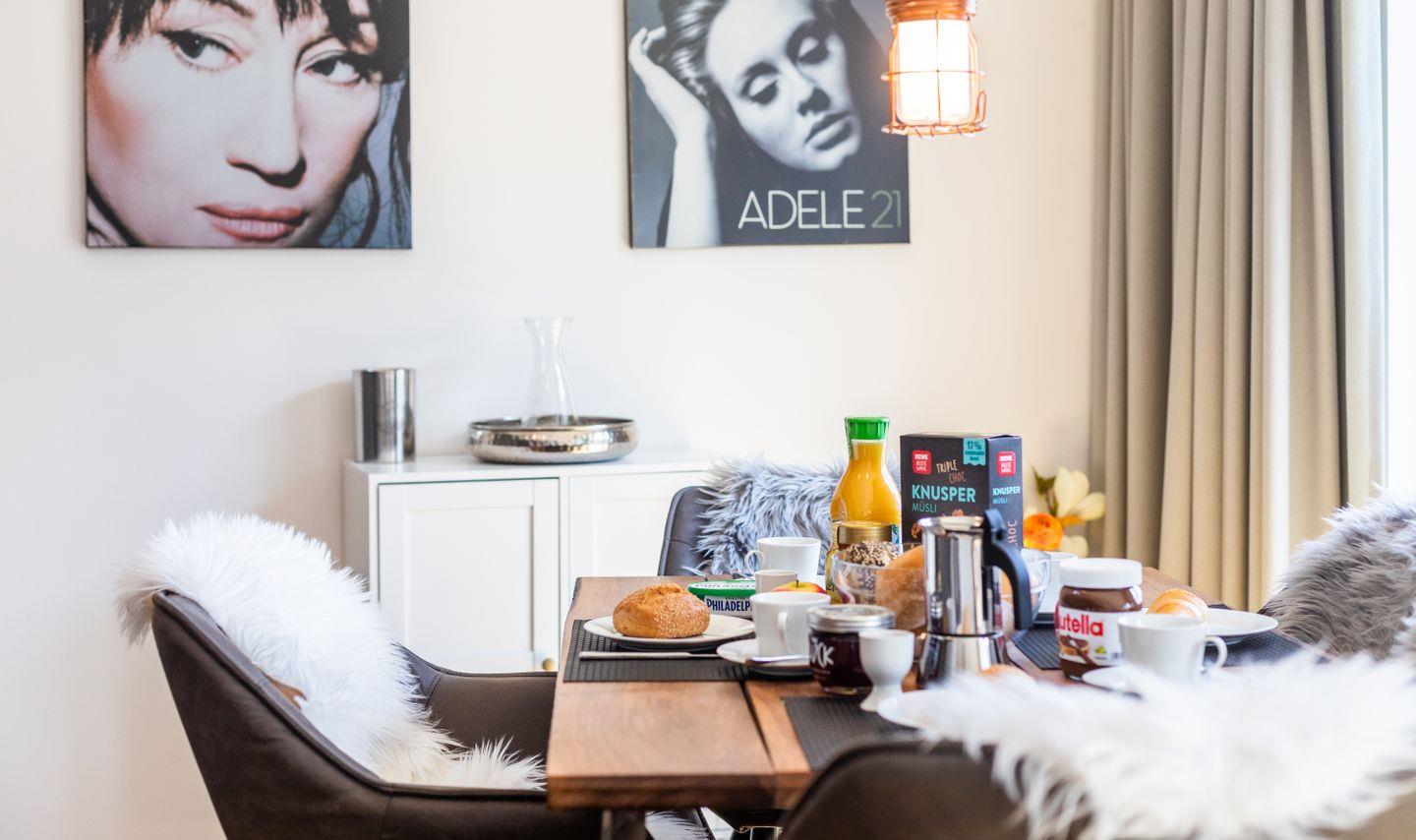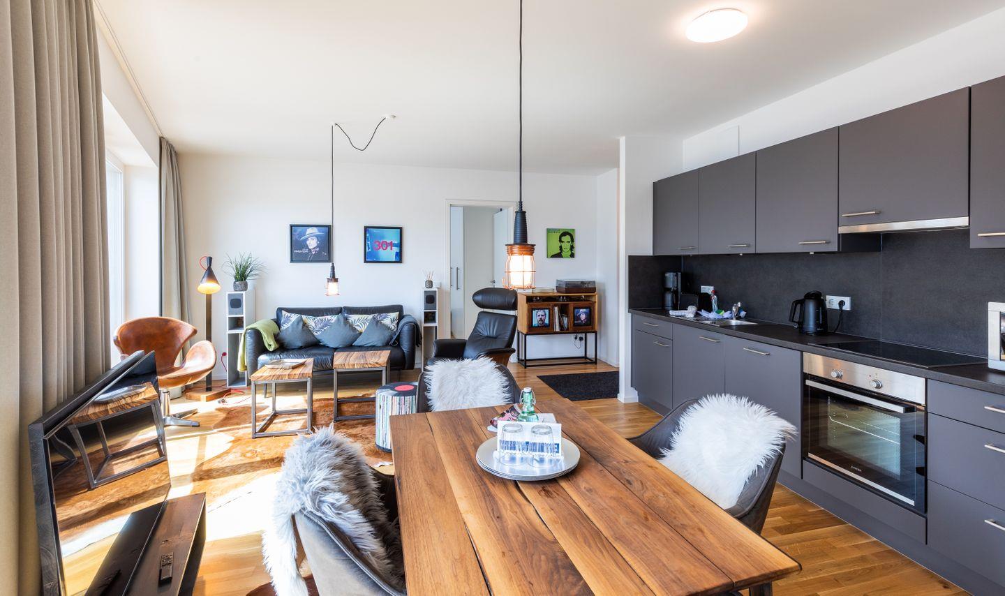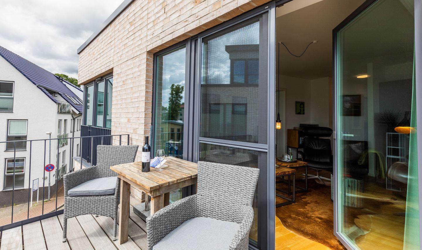 Durch einen kleinen Flur gelangt man in den weitläufigen und modern eingerichteten Wohn-/ Essbereich, welcher mit einer Einbauküche, einem Esstisch und einer Sofagarnitur ausgestattet ist. Zudem befindet sich hier der Zugang zum Balkon. Dieser ist mit Gartenmöbeln und einem Elektrogrill für sonnige Stunden bestückt.