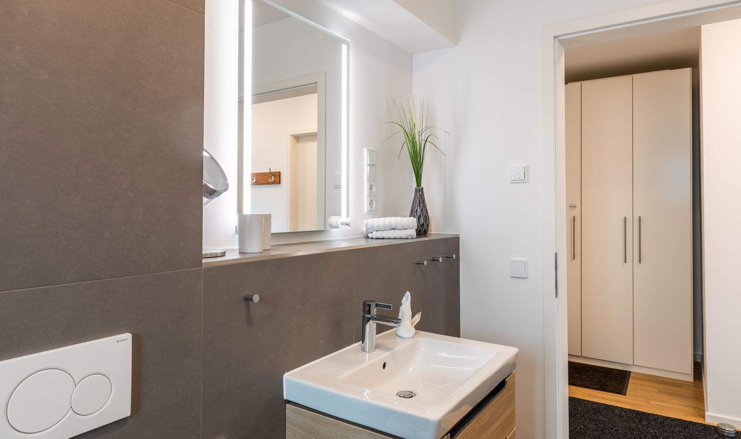 Darüber hinaus bietet die Wohnung ein elegant eingerichtetes Tageslichtbadezimmer mit ebenerdiger Dusche und weiteren modernen Ausstattungen.