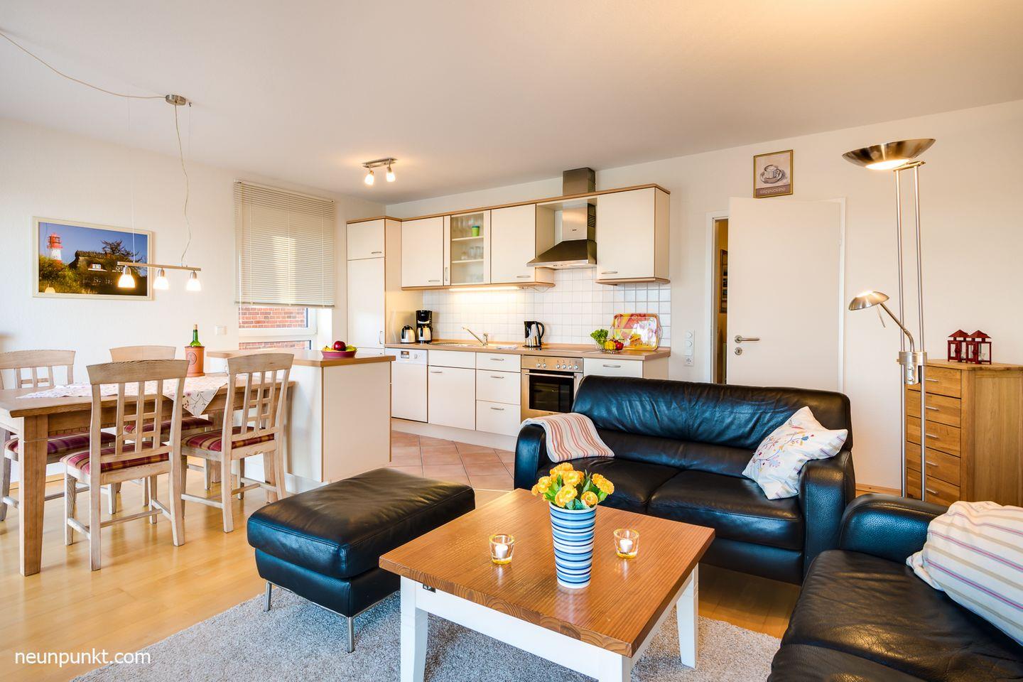 Der Wohn-/Essbereich verfügt über eine gemütliche Couch, einen Esstisch und eine integrierte gut eingerichtete Küchenzeile. Die Schlafzimmer sind jeweils mit einem Doppelbett und Kleiderschrank ausgestattet. Das Badezimmer ist mit einer Eckbadewanne, einer Dusche und einer Waschmaschine eingerichtet.
