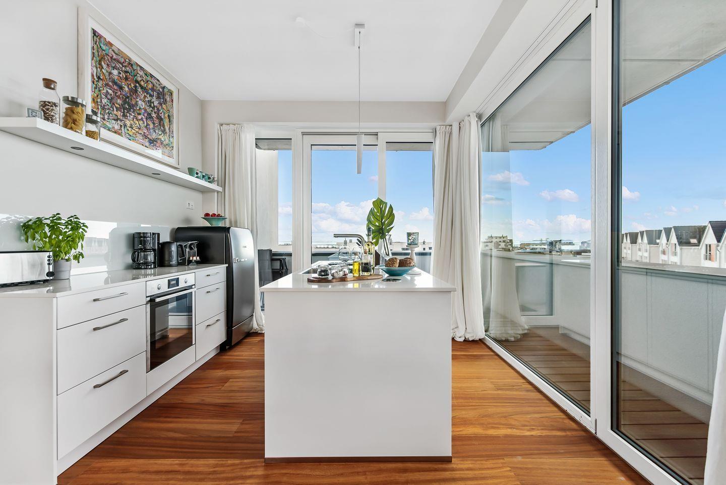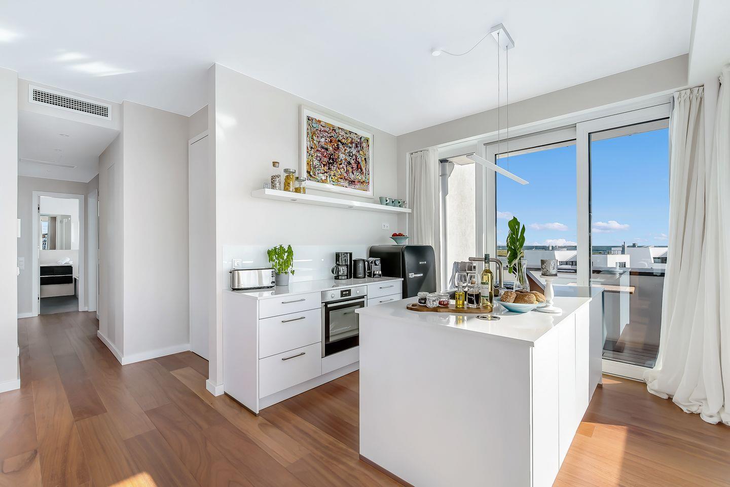 Schon beim Eintreten wandert der Blick direkt durch die großen Panoramafenster auf das Wasser und in diesem Penthouse ist aus jedem bodentiefen Fenster der Meerblick garantiert. Der große Wohn-Essbereich mit offener Küche bildet den Dreh- und Angelpunkt des Urlaubs. Hier ist eine hochwertige Küche mit perfekt ausgestatteter Kochinsel verbaut. Auch beim Kochen muss somit nicht auf den Meerblick verzichtet werden. Der sich anschließende gemütliche Esstisch für 4 Personen befindet sich mittig im Raum und bietet den perfekten Platz für schöne Spieleabende oder ein mehrgängiges Menü.