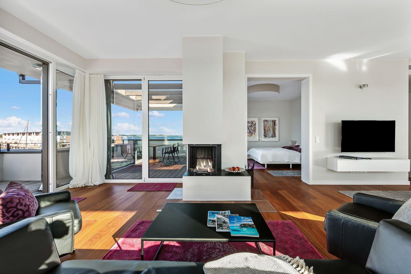 Das luxuriöse Penthouse "Sky Lodge" liegt nur wenige Meter vom fein abfallende Sandstrand im Ostseeresort Olpenitz entfernt und bietet mit seiner großen Dachterrasse, der luxuriösen Ausstattung und dem Kaminofen einen wunderbaren Rückzugsort um dem Alltag zu entfliehen.