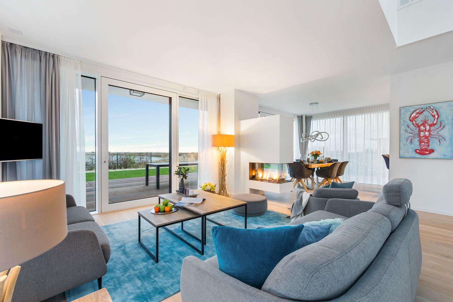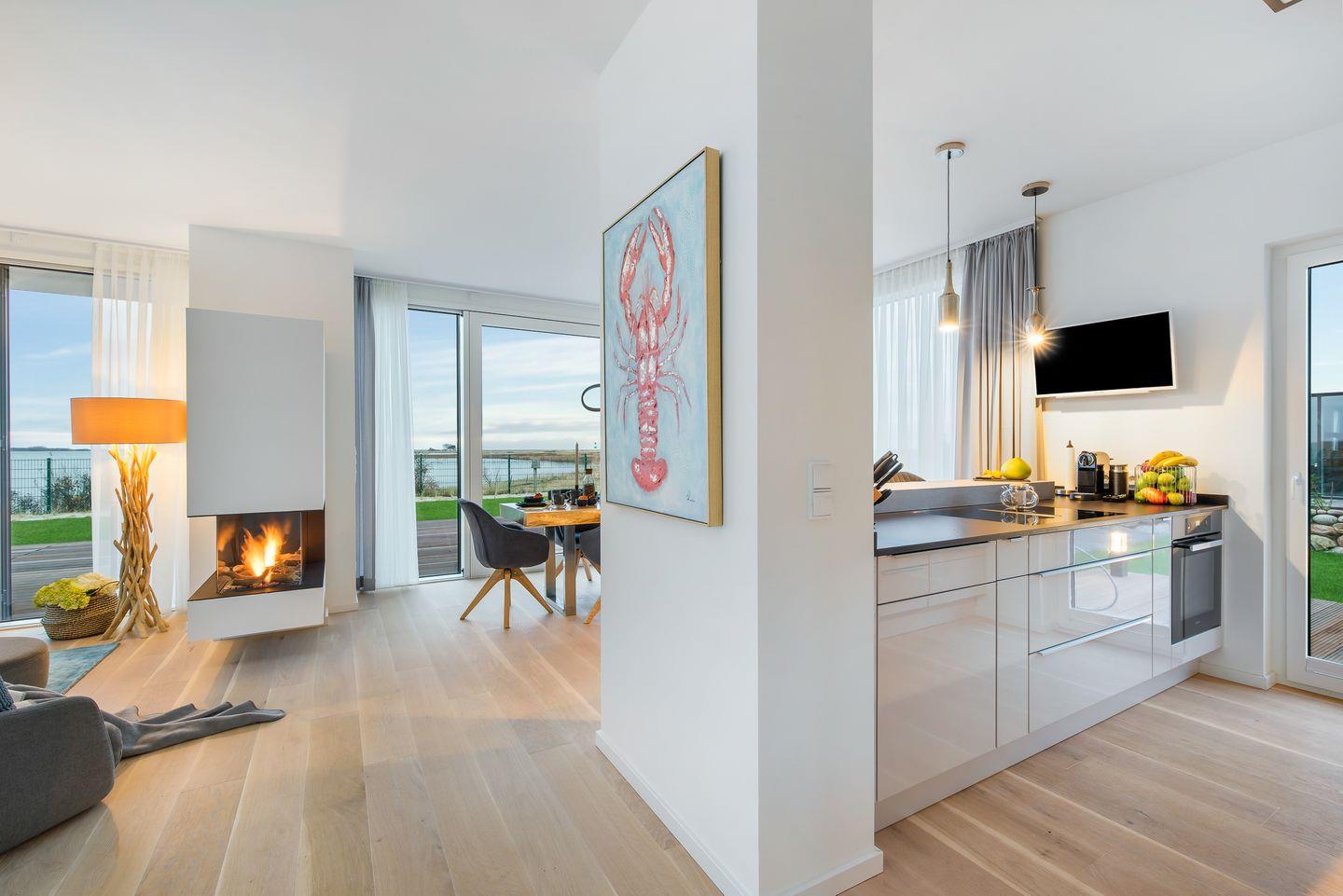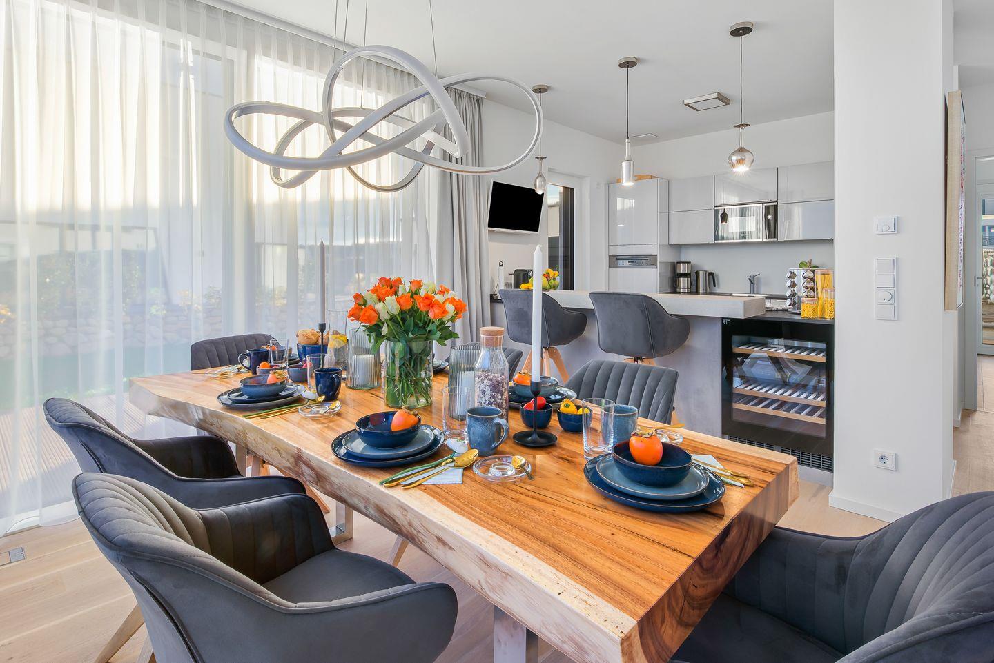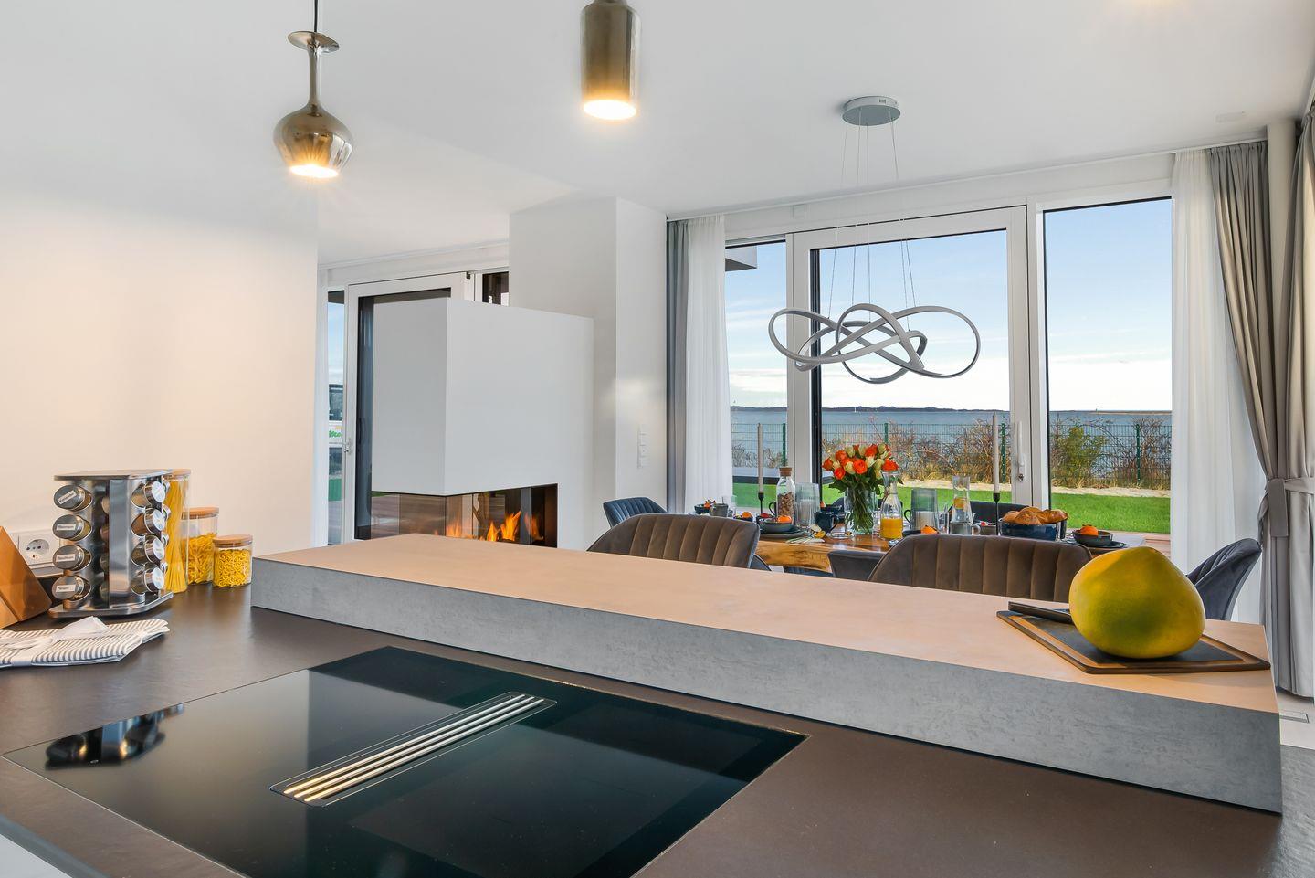 Der große, helle Wohnbereich mit bodentiefen Fenstern schließt an den Flur an und bietet einen herrlichen Ausblick in den Garten und auf das Meer. Die hohen Räume dieser Villa lassen den ca. 50 qm großen Raum zum Mittelpunkt Ihres Urlaubes werden. Die integrierte voll ausgestattete Küche mit Kochinsel bietet selbst beim Kochen Meerblick. Ein Fernseher ist ebenfalls in der Küche installiert, sodass die Lieblingsgerichte direkt nachgekocht werden können. Der offene Essbereich für 6 Personen grenzt an die Kochinsel und lädt zu schönen Spieleabenden mit der ganzen Familie ein. In der Mitte des Wohnbereiches unterteilt ein großer freischwebender Kaminofen den Wohn- und Essbereich. Dieser verbreitet auch an kälteren Tagen Gemütlichkeit und ein wohliges Gefühl.