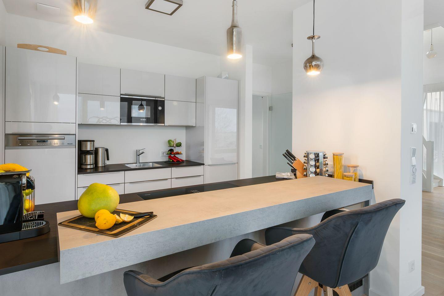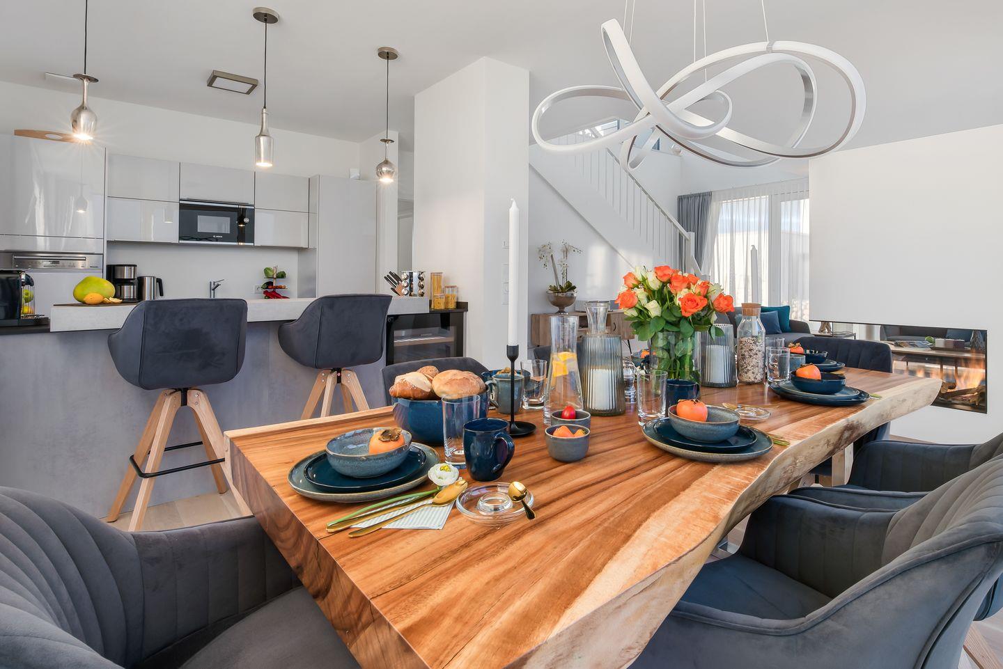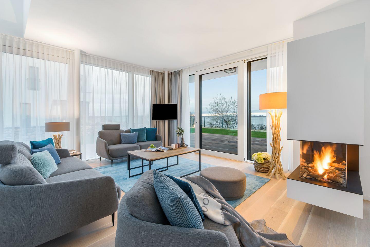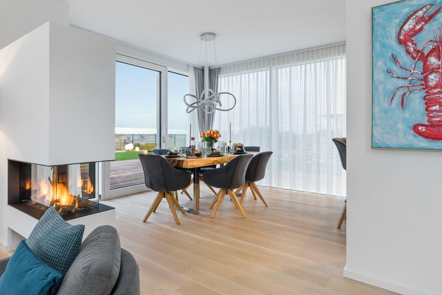 Der große, helle Wohnbereich mit bodentiefen Fenstern schließt an den Flur an und bietet einen herrlichen Ausblick in den Garten und auf das Meer. Die hohen Räume dieser Villa lassen den ca. 50 qm großen Raum zum Mittelpunkt Ihres Urlaubes werden. Die integrierte voll ausgestattete Küche mit Kochinsel bietet selbst beim Kochen Meerblick. Ein Fernseher ist ebenfalls in der Küche installiert, sodass die Lieblingsgerichte direkt nachgekocht werden können. Der offene Essbereich für 6 Personen grenzt an die Kochinsel und lädt zu schönen Spieleabenden mit der ganzen Familie ein. In der Mitte des Wohnbereiches unterteilt ein großer freischwebender Kaminofen den Wohn- und Essbereich. Dieser verbreitet auch an kälteren Tagen Gemütlichkeit und ein wohliges Gefühl.