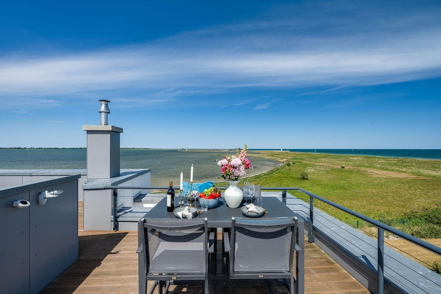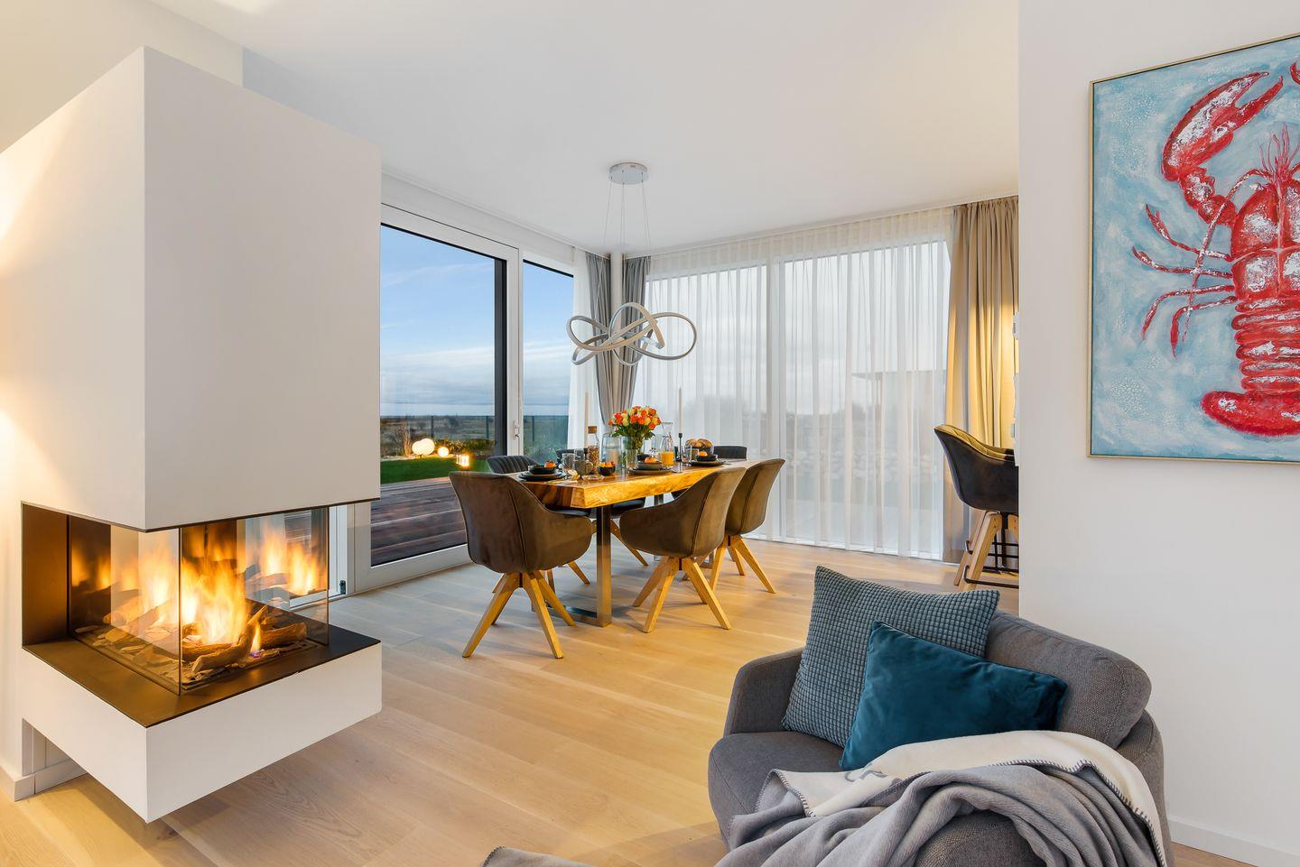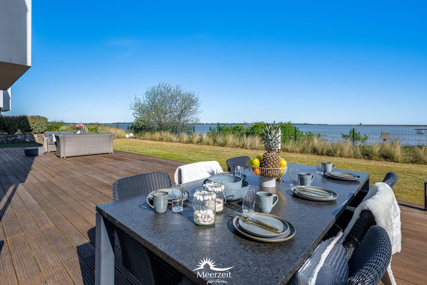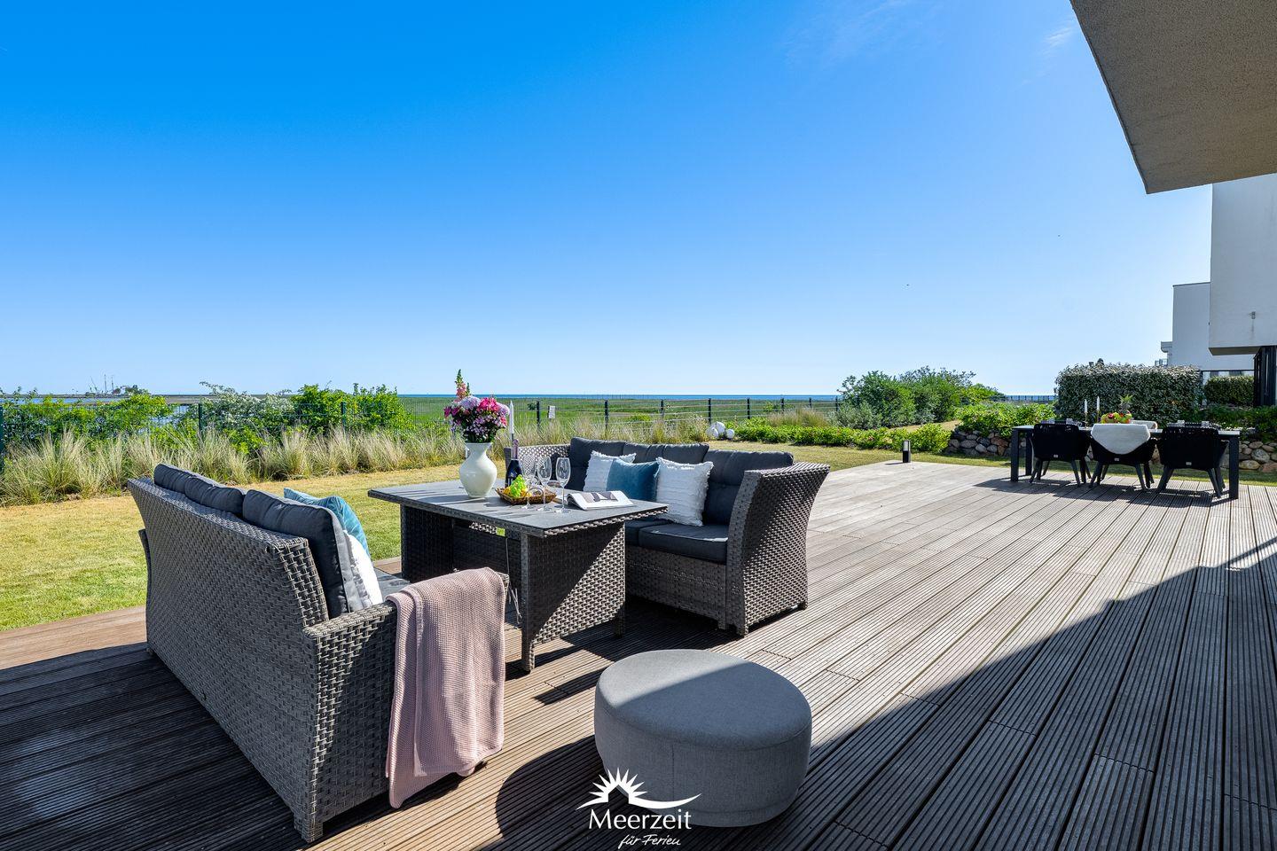 Die daran angrenzende Wohnlandschaft mit gemütlichem Sofa und TV bietet Platz für die ganze Familie und kuschligen Stunden vor dem Kamin. Das gesamte Erdgeschoss ist in U-Form mit großen Schiebetüren ausgestattet, über diese die angrenzende Terrasse und der Garten betreten werden können. Auch hier versprechen ein gemütlicher Outdoorbereich mit Esstisch und eine Loungeecke schöne Stunden mit Meerblick. Ein Grill steht unseren Gästen ebenfalls zur Verfügung, sodass nicht nur der Sundowner auf der Terrasse genossen werden kann, sondern Grill-Fans voll auf ihre Kosten kommen.