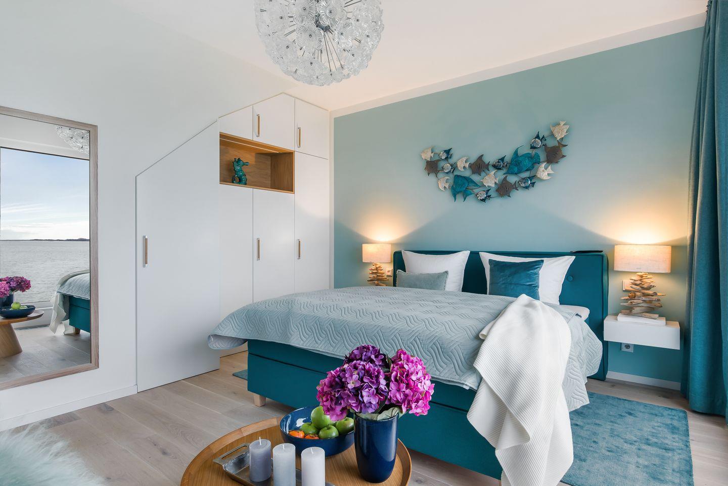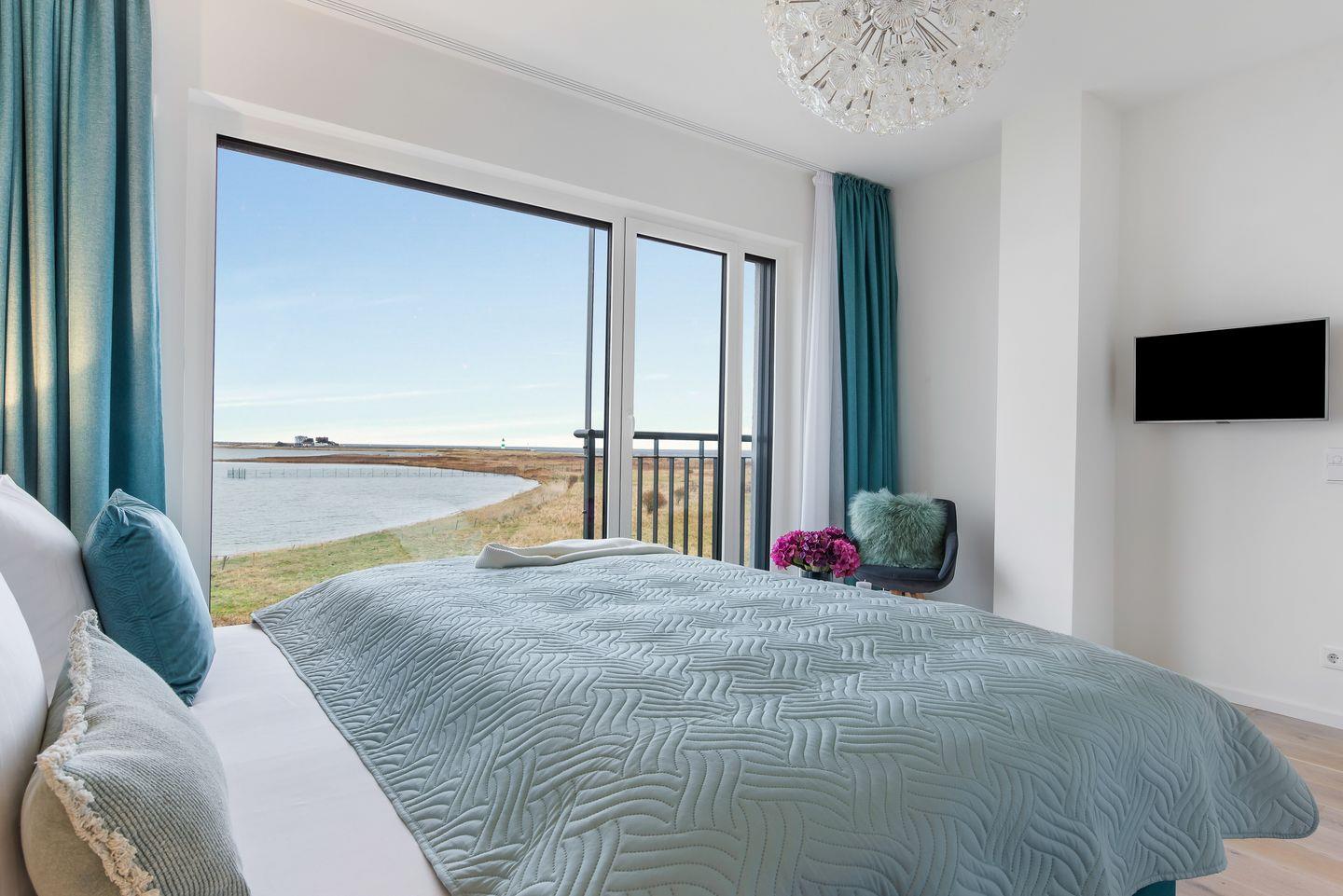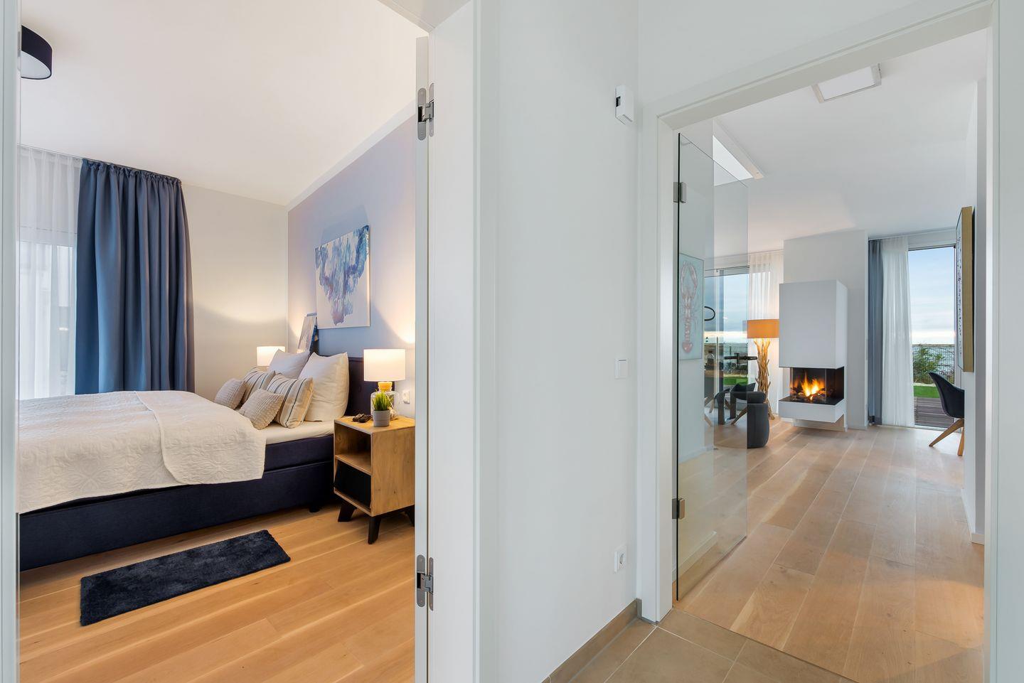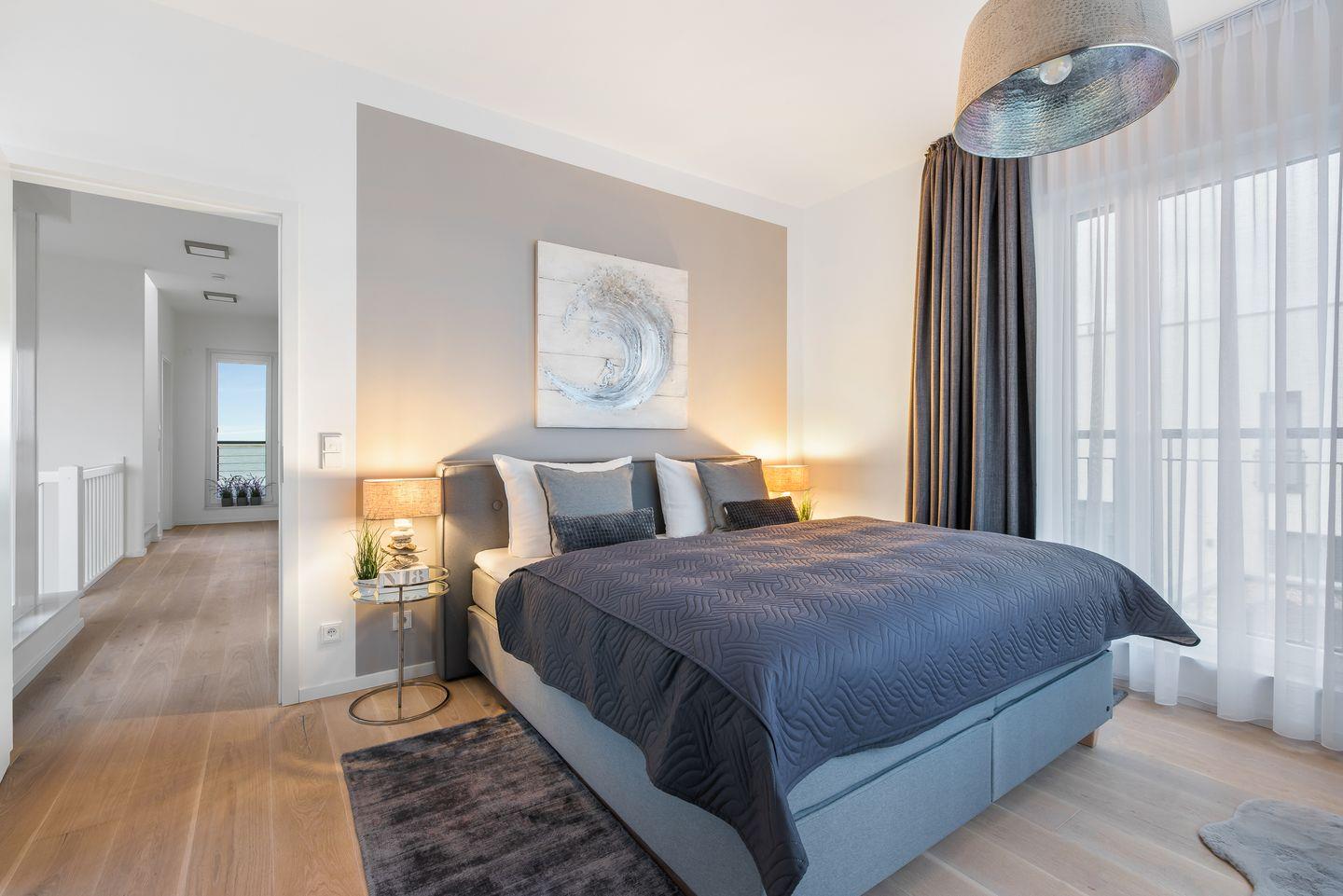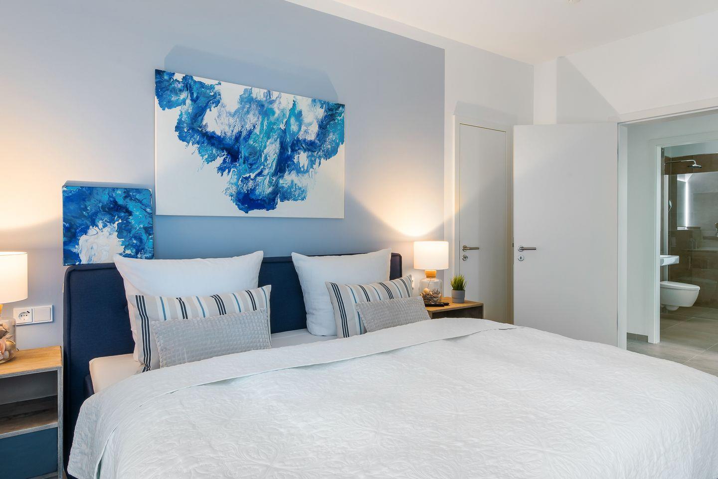 Die große edle Treppe hinauf geht es dann in das 1. Obergeschoss mit zwei weiteren Schlafzimmern, einem Wellenessbadezimmer mit Sauna, einer Sonnenterrasse und einem weiteren Badezimmer. Beide Schlafzimmer sind mit hochwertigen Betten - inkl. gemütlicher Daunen-Decken und Daunen-Kissen-, Kleiderschränken und TVs ausgestattet. Der Masterbedroom verfügt zudem noch über eine große Fensterfront mit Blick auf das Meer. Mit einer Tasse Kaffee oder Tee den Morgen begrüßen, den Segel- und Fischerbooten beim Auslaufen aus der Schlei zusehen und dabei den Sonnenaufgang bewundern. Schöner kann ein Tag nicht beginnen.