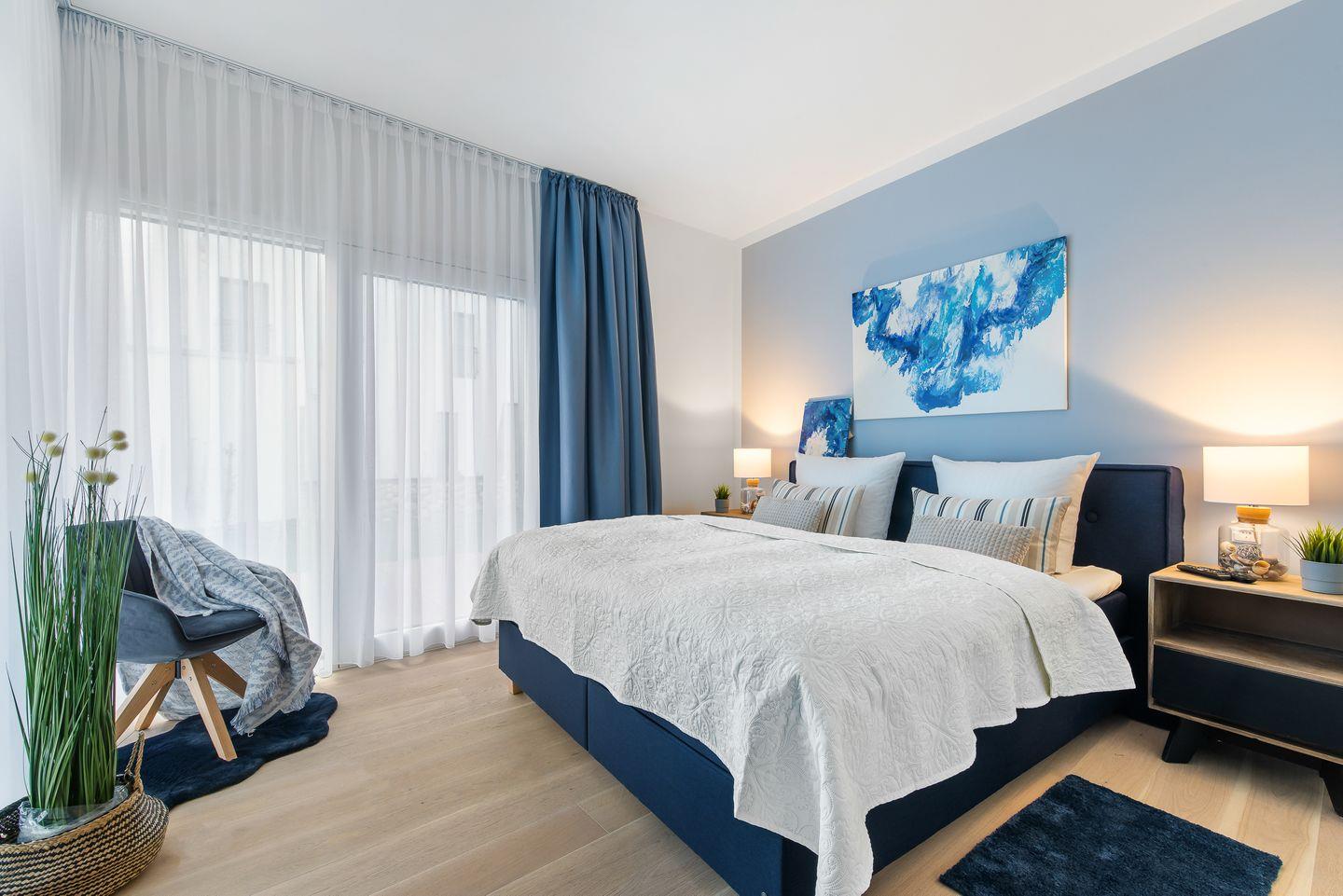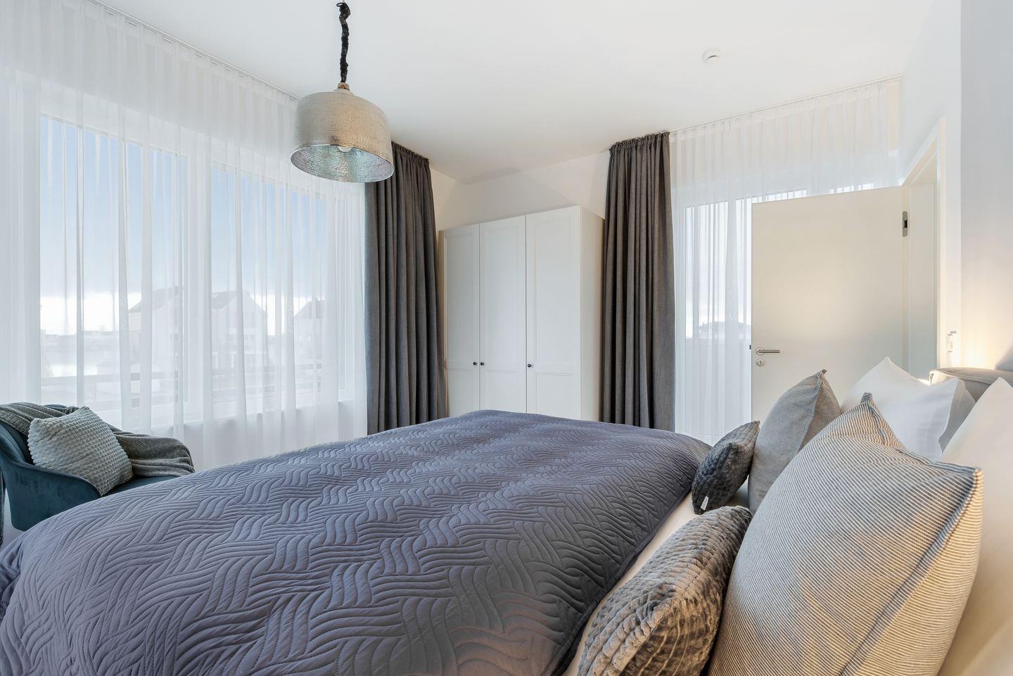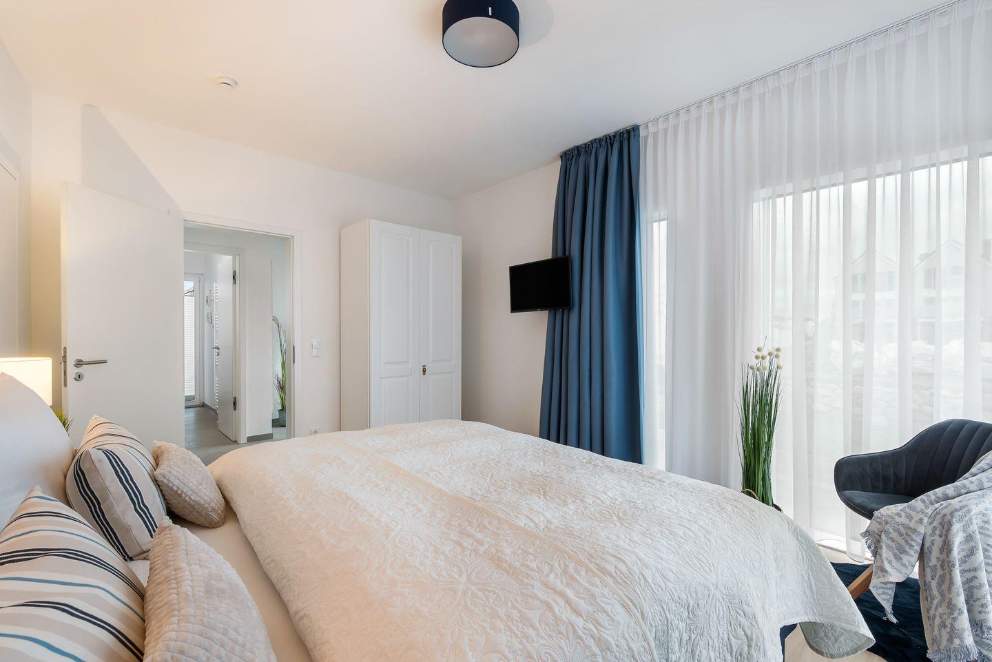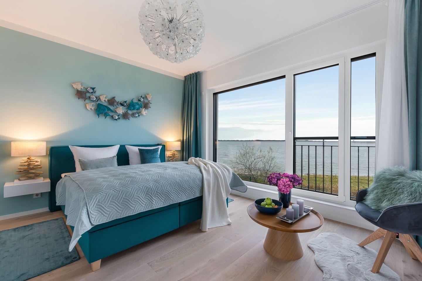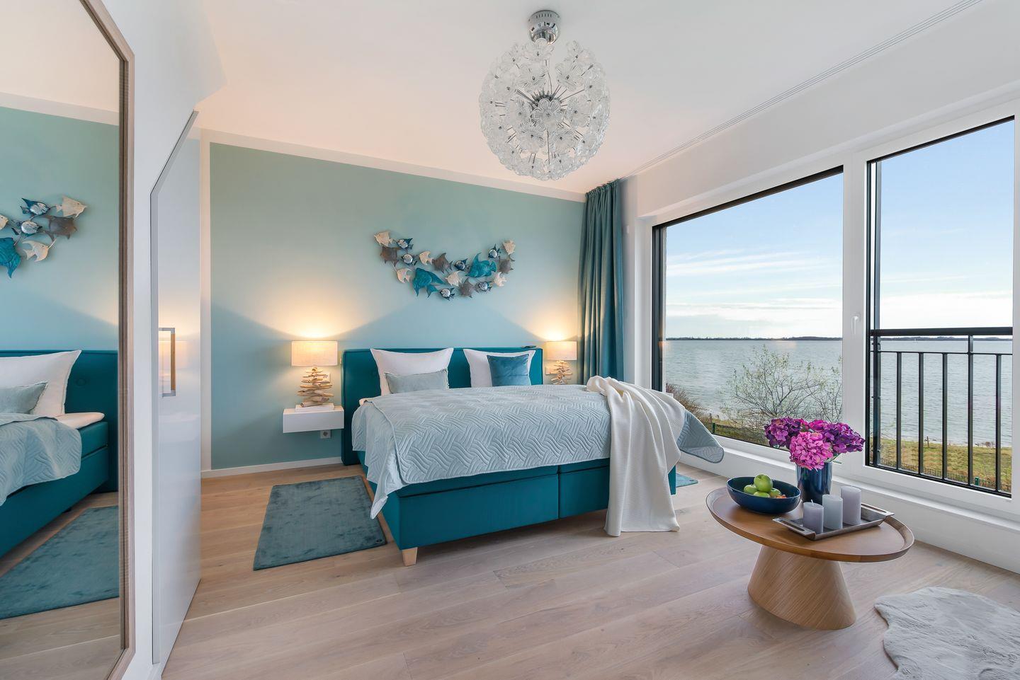 Die große edle Treppe hinauf geht es dann in das 1. Obergeschoss mit zwei weiteren Schlafzimmern, einem Wellenessbadezimmer mit Sauna, einer Sonnenterrasse und einem weiteren Badezimmer. Beide Schlafzimmer sind mit hochwertigen Betten - inkl. gemütlicher Daunen-Decken und Daunen-Kissen-, Kleiderschränken und TVs ausgestattet. Der Masterbedroom verfügt zudem noch über eine große Fensterfront mit Blick auf das Meer. Mit einer Tasse Kaffee oder Tee den Morgen begrüßen, den Segel- und Fischerbooten beim Auslaufen aus der Schlei zusehen und dabei den Sonnenaufgang bewundern. Schöner kann ein Tag nicht beginnen.