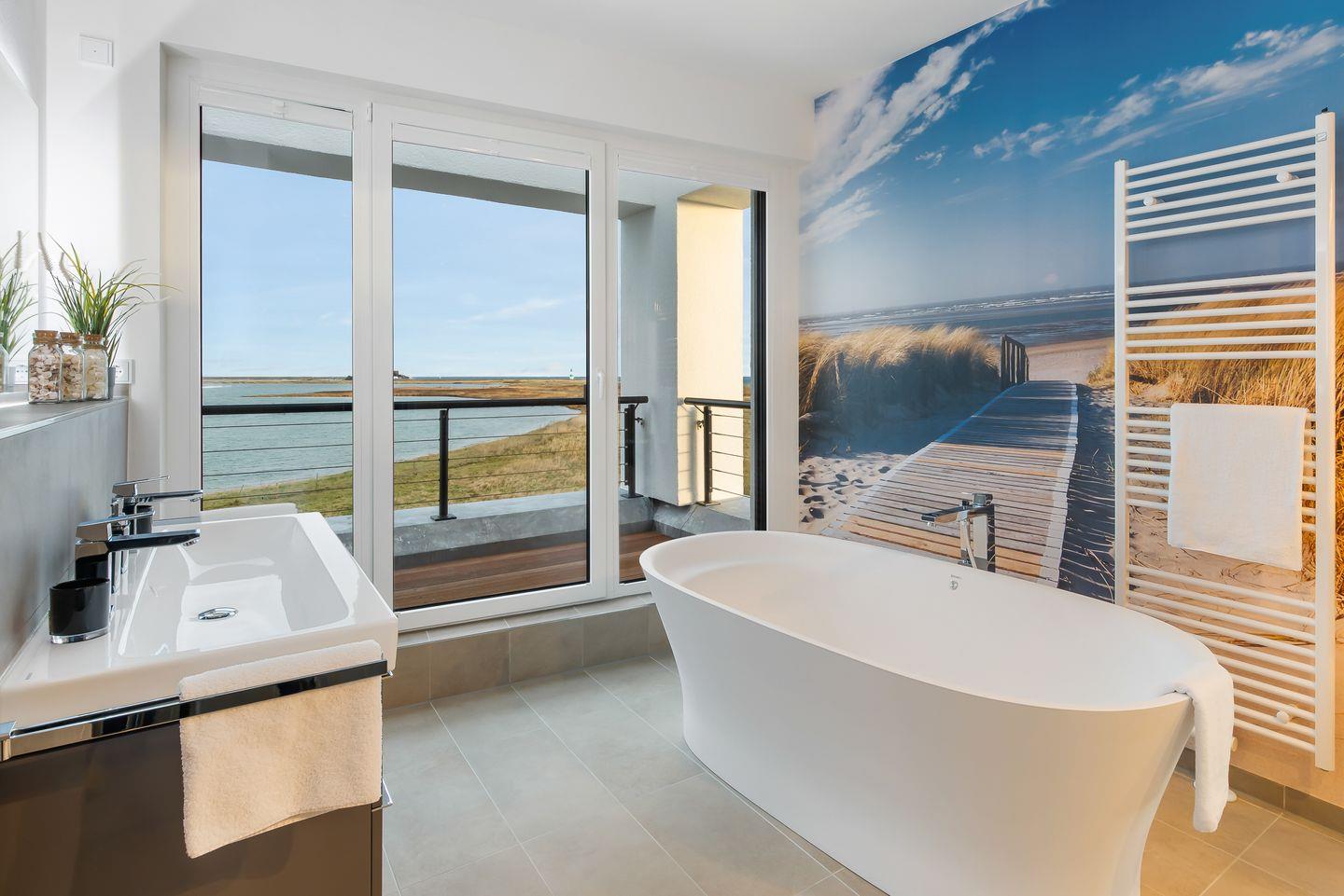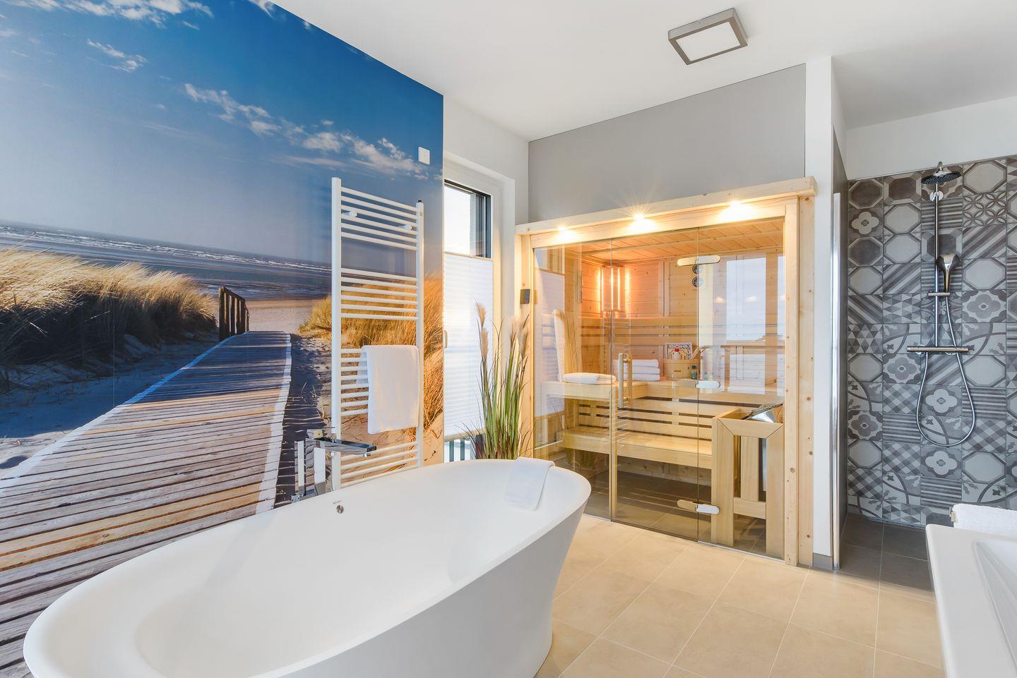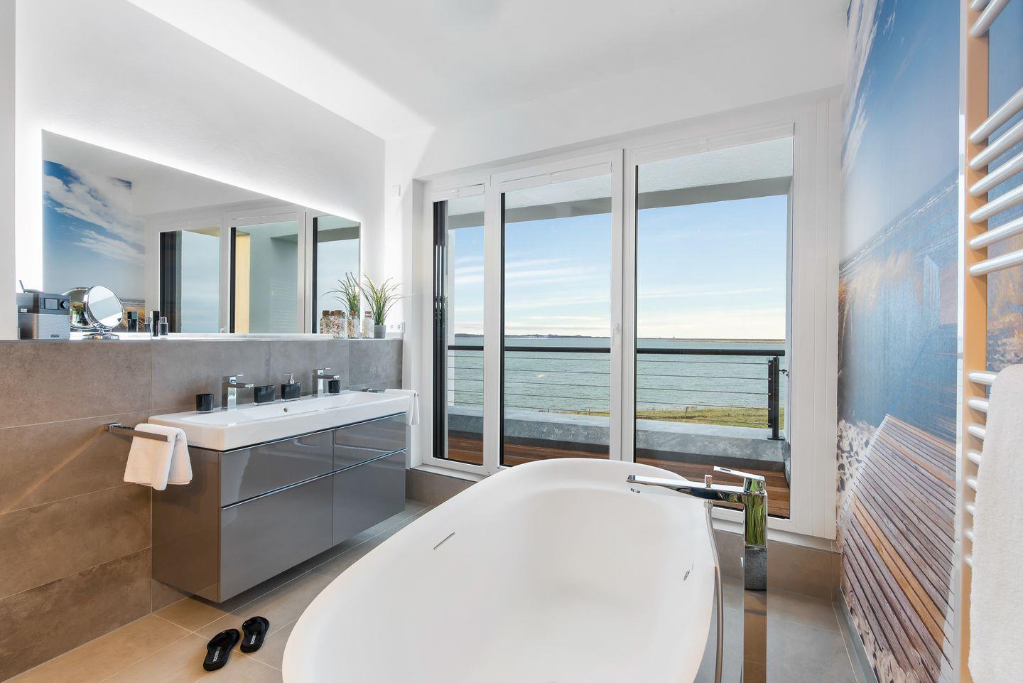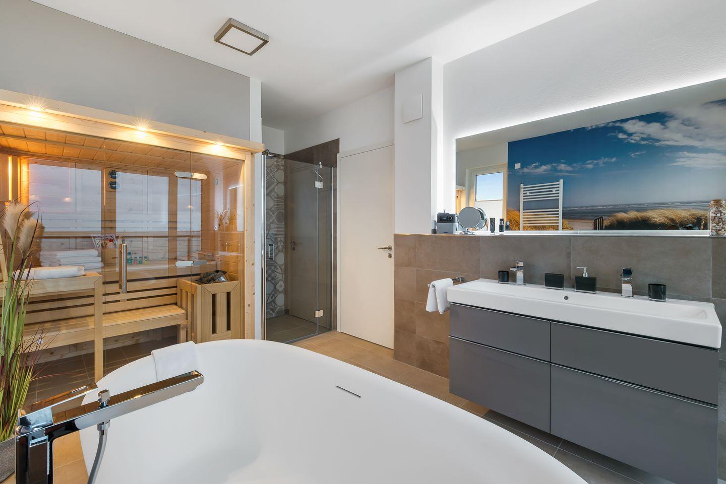 Das angrenzende Wellenessbadezimmer verfügt über eine große Badewanne mit Meerblick, eine finnische Sauna, eine Regendusche und einen großen Waschtisch. Zudem gelangen unsere Gäste vom Badezimmer auf den angrenzenden Balkon mit Meerblick. Das dritte Badezimmer verfügt ebenfalls über eine Regendusche, ein WC und einen Waschtisch.