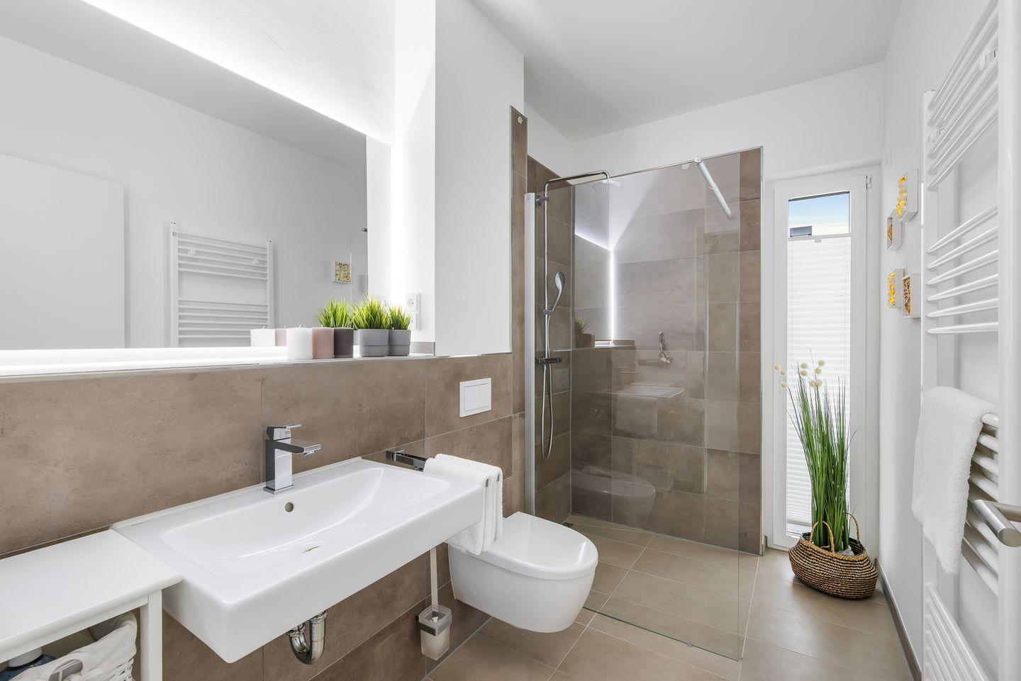 Über den ebenerdigen Eingangsbereich gelangen Sie direkt in den hellen Flur, wo sich die Garderobe und ein separater Hauswirtschaftsraum mit Waschmaschine befindet. Vom Flur abgehend befinden sich ein großes Schlafzimmer mit bodentiefen Fenstern, TV und gemütlichem Doppelbett sowie ein Badezimmer mit ebenerdiger Regendusche und Waschtisch.
