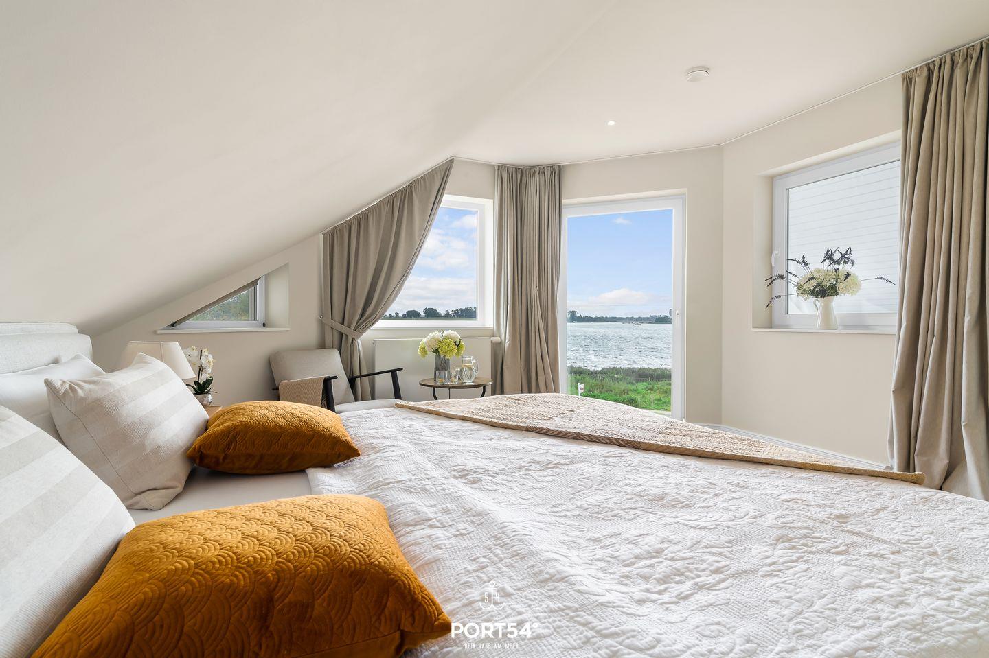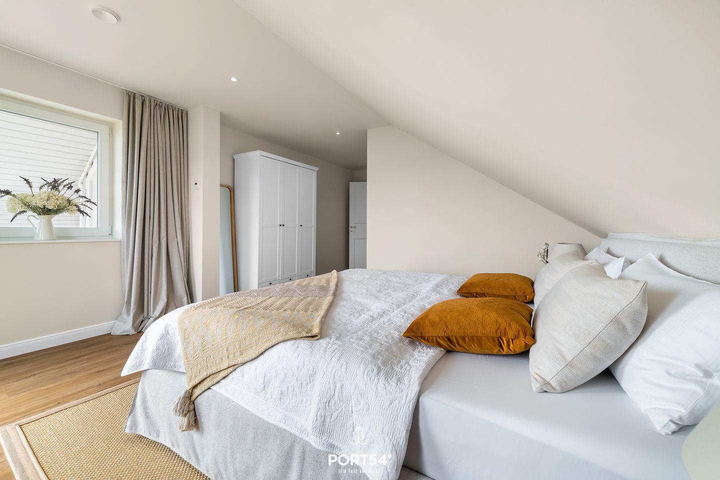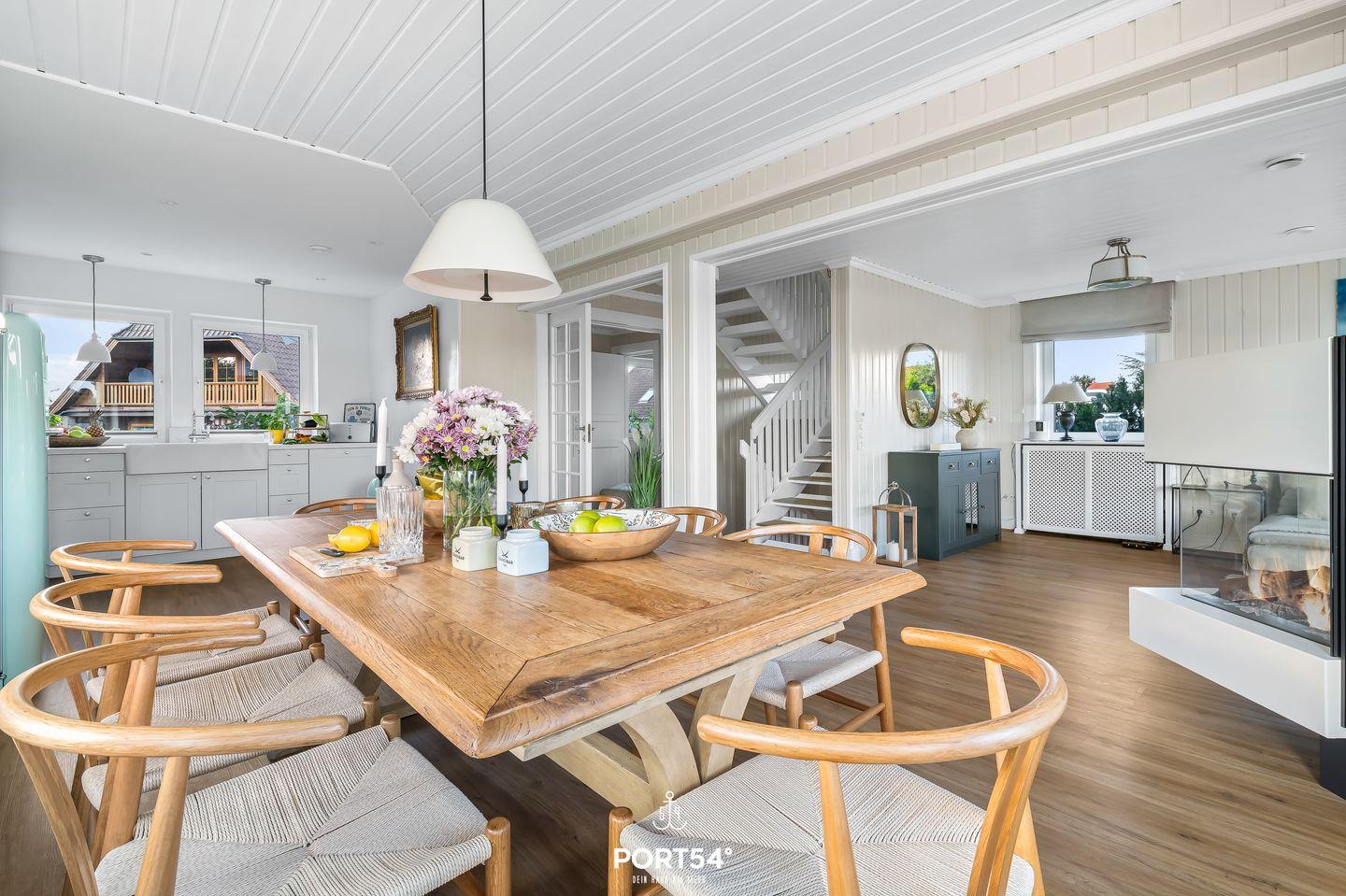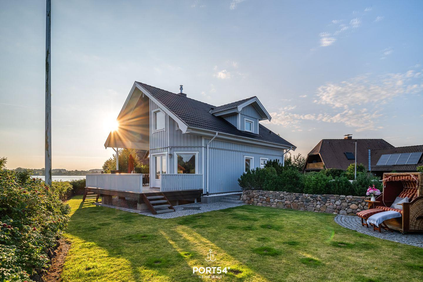 In Sackgassenendlage, nur 30 Meter von der Schlei entfernt, liegt das großzügige und stilvolle Schwedenhaus Breeze 71. Das Ferienhaus bietet auf etwa 180m² Platz für bis zu 8 Personen. Mit einzigartigem Ausblick auf die Schlei ist dieses Haus zu jeder Jahreszeit eine Reise wert. Das Herzstück des Hauses ist das Erdgeschoss mit dem offen gestalteten Wohn- und Essbereich und angrenzender offener Küche. Dieser großzügige Raum ist geschmackvoll eingerichtet und ermöglicht Ihnen einen traumhaften Blick auf die Schlei. Machen Sie es sich auf dem gemütlichen Sofa bequem und lassen Sie sich von einem Film im Flachbild-Fernseher unterhalten. Oder lesen Sie eines der hauseigenen Bücher auf dem komfortablen Sessel. Der zu drei Seiten offener Gas-Kamin sorgt zusätzlich für eine hyggelige Atmosphäre. Die angrenzende offene Küche ist mit alles ausgestattet, was Sie für Ihren Aufenthalt benötigen. Am großen Esstisch können Sie hervorragend gemeinsam essen oder auch lustige Spieleabende mit den hauseigenen Gesellschaftsspielen verbringen. Beim Essbereich befindet sich der Zugang zur möblierten Holzterrasse. Die Terrasse ist nach Süden ausgerichtet und bietet Ihnen einen unvergleichlichen Blick aufs Wasser. Von hier aus gelangen Sie in den Garten, in dem sich eine weitere Terrasse mit einem Strandkorb befindet. Im Souterrain des Ferienhauses laden zwei Schlafzimmer mit jeweils einem Boxspring-Doppelbett (eines in 180x200cm, eines in 160x200cm) zur erholsamen Nachtruhe ein. Eines dieser Schlafzimmer verfügt über ein Duschbad en Suite. Das Gäste-WC finden Sie im Erdgeschoss. Im Obergeschoss erwartet Sie ein Schlafzimmer mit Boxspring-Doppelbett (180x200cm) und ebenfalls einem Duschbad en Suite. Das andere Schlafzimmer ist mit zwei Einzelbetten ausgestattet (90x200cm). Diverse Spielsachen, Bücher und ein gemütlicher Sessel machen dieses Zimmer zu einem wahren Paradies für Kinder. Auch dieses Schlafzimmer verfügt ebenfalls über ein Bad en Suite. Die Badewanne dieses Bades verspricht Entspannung pur. Eine Waschmaschine und ein Trockner stehen Ihnen im Haus zur Verfügung. Für die kleinsten Gäste stehen ein Reisebettchen, zwei Hochstühle und ein Kindertritthocker bereit. Ein Treppenschutzgitter sorgt für Sicherheit. Auch bis zu zwei Fellnasen sind in diesem Haus Herzlich Willkommen. Vor dem Haus befinden sich zwei kostenlose PKW-Stellplätze und eine E-Ladesäule. Nur wenige Meter entfernt befindet sich ein kleiner Weg entlang der Schlei - ideal für einen Spaziergang. Ob stürmische Herbststage oder laue Sommerabende - dieses Haus bietet für jede Jahreszeit den höchsten Komfort.