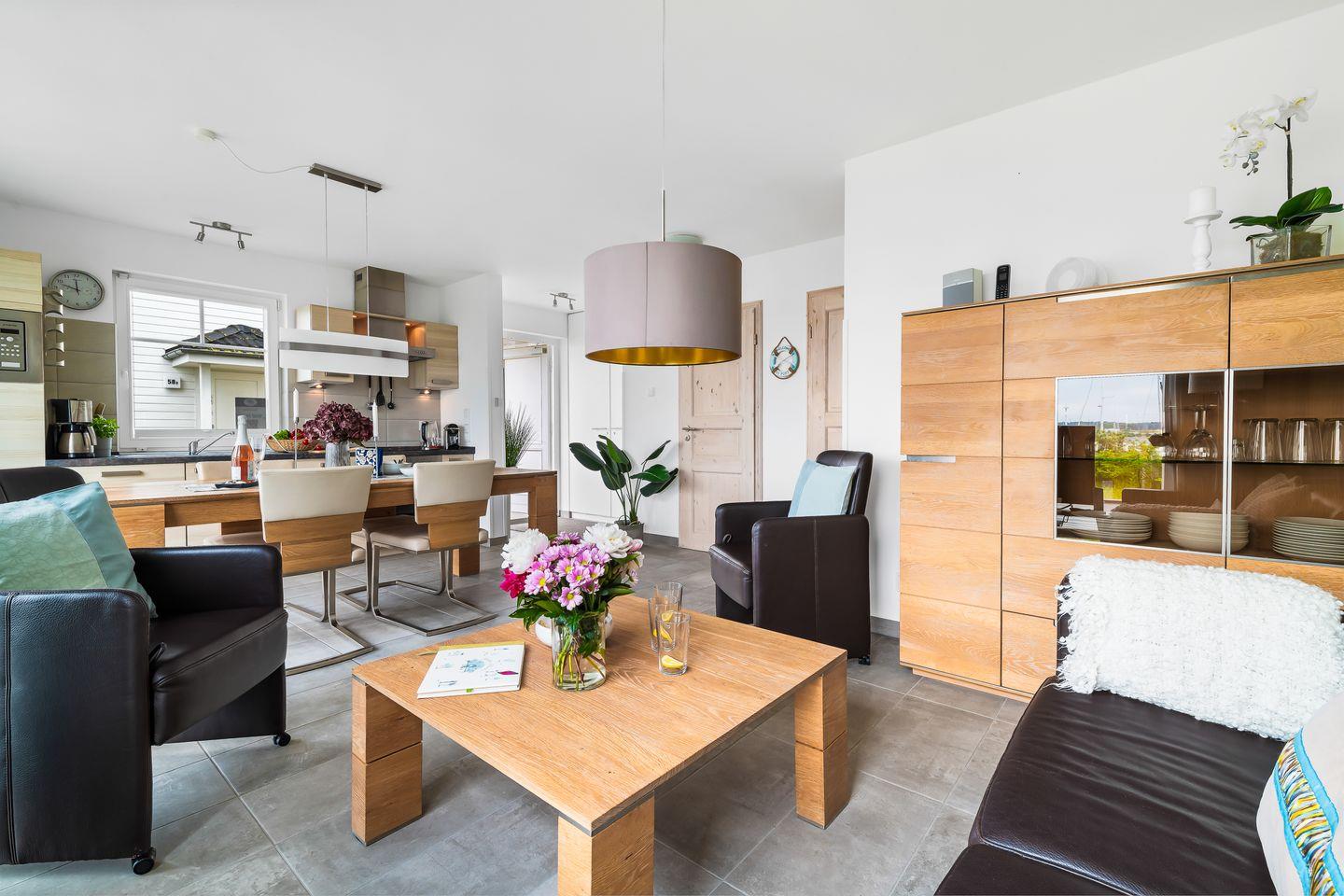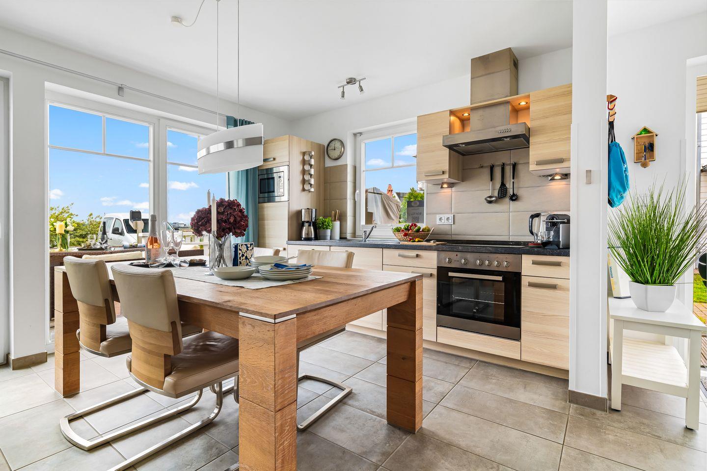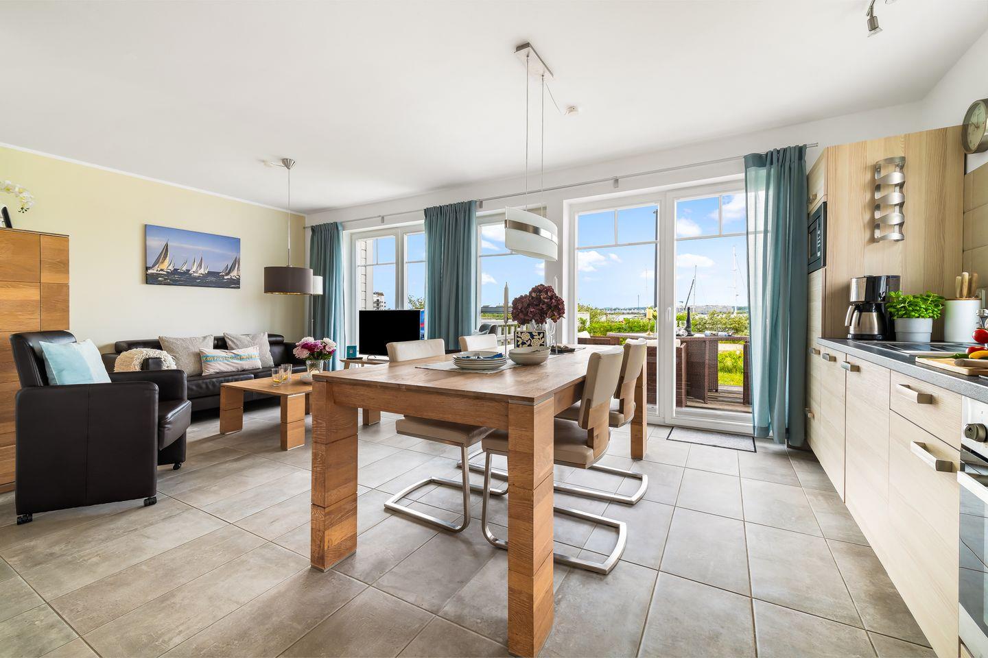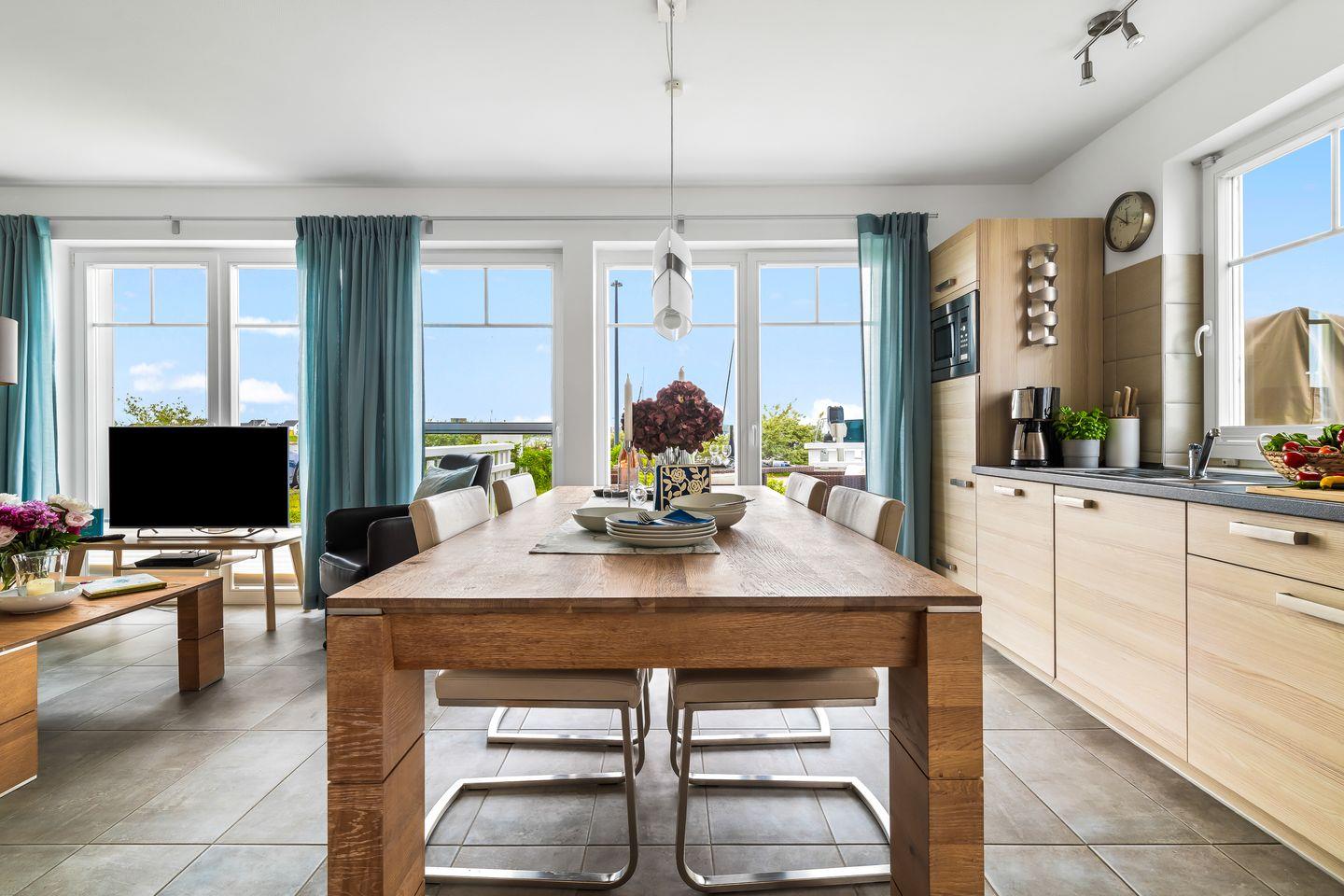 Das lichtdurchflutete Erdgeschoss des "Witthus 2" umfasst einen großzügigen Wohn- und Essbereich, der zum Mittelpunkt Ihres gemeinsamen Urlaubs wird. Die voll ausgestattete Wohnküche lässt keine Wünsche offen. Bodentiefe Fenster sorgen für viel Tageslicht und bieten direkten Zugang zur Sonnenterrasse am Yachthafen, wo Sie mit Blick aufs Wasser entspannen können. Ein Gäste-WC im Erdgeschoss bietet zusätzlichen Komfort.