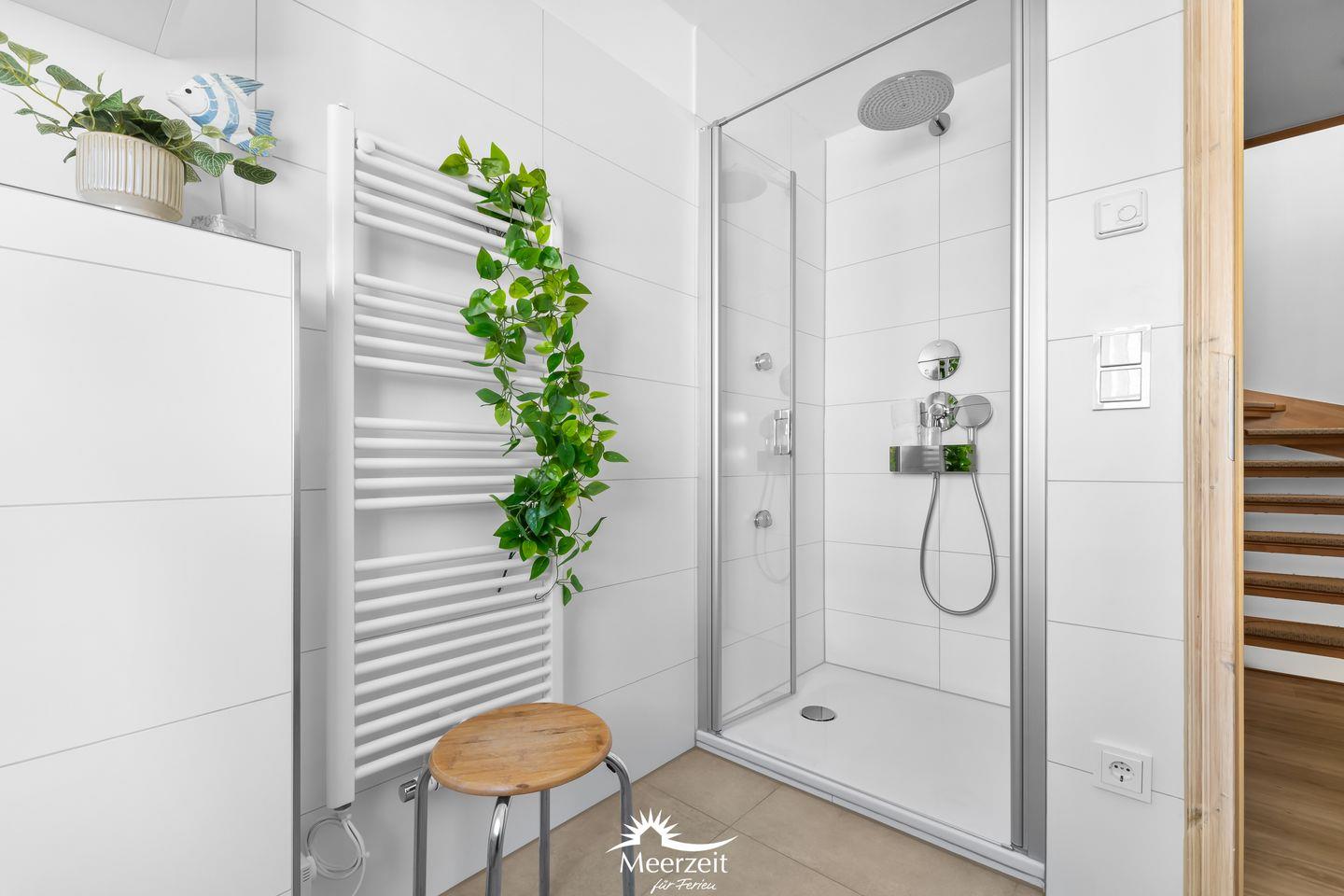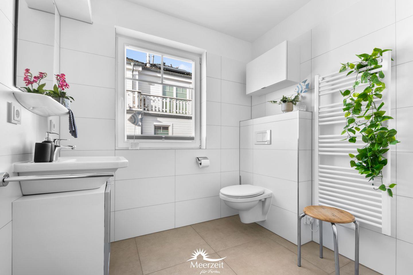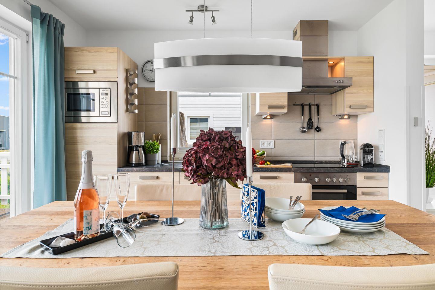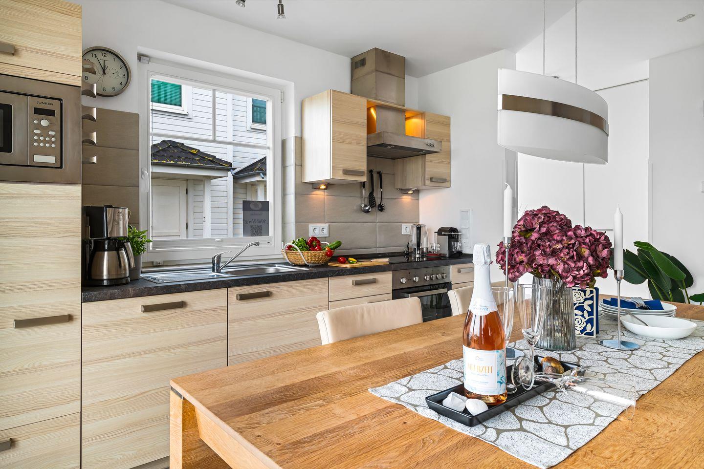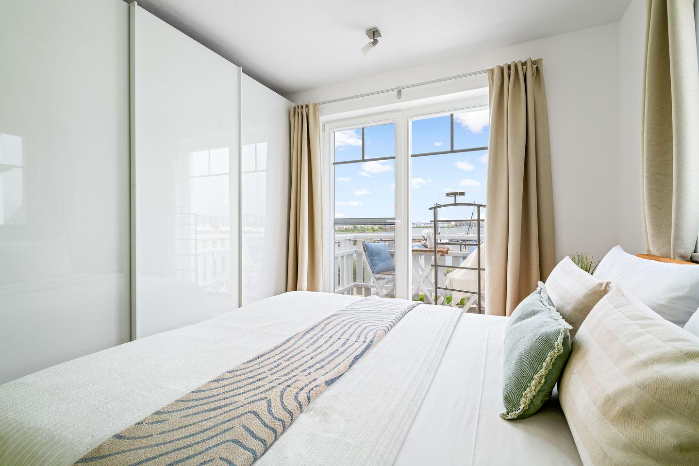 Das lichtdurchflutete Erdgeschoss des "Witthus 2" umfasst einen großzügigen Wohn- und Essbereich, der zum Mittelpunkt Ihres gemeinsamen Urlaubs wird. Die voll ausgestattete Wohnküche lässt keine Wünsche offen. Bodentiefe Fenster sorgen für viel Tageslicht und bieten direkten Zugang zur Sonnenterrasse am Yachthafen, wo Sie mit Blick aufs Wasser entspannen können. Ein Gäste-WC im Erdgeschoss bietet zusätzlichen Komfort.