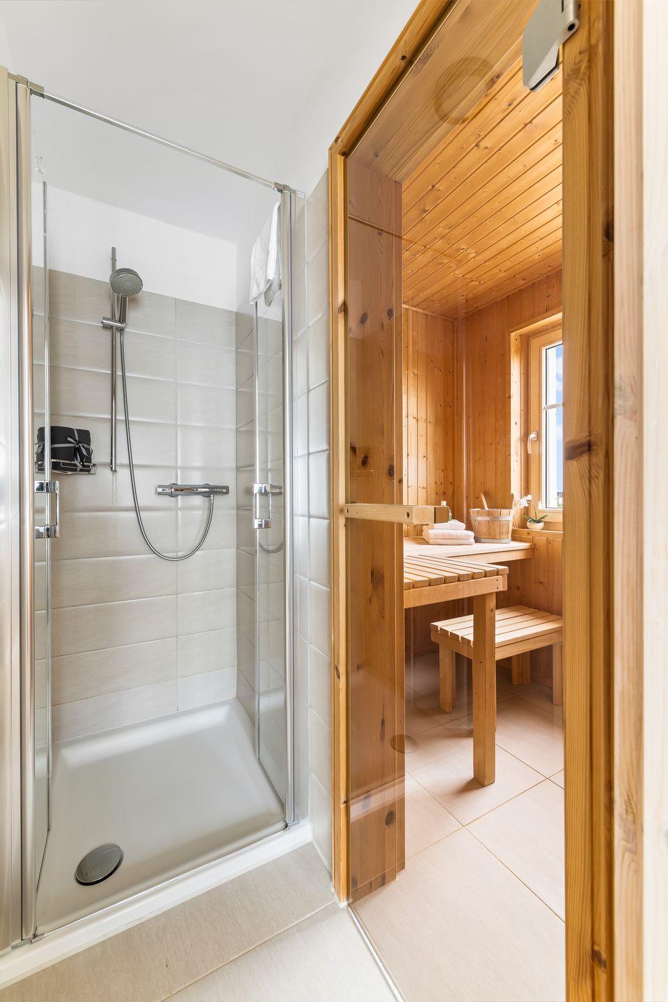 Im ersten Obergeschoss erwarten Sie zwei helle Schlafzimmer, eines mit zwei Einzelbetten und ein weiteres mit einem komfortablen Doppelbett. Das Badezimmer ist mit einer Dusche ausgestattet und die Sauna im Dachgeschoss macht auch weniger sonnige Tage zu einem entspannenden Erlebnis.