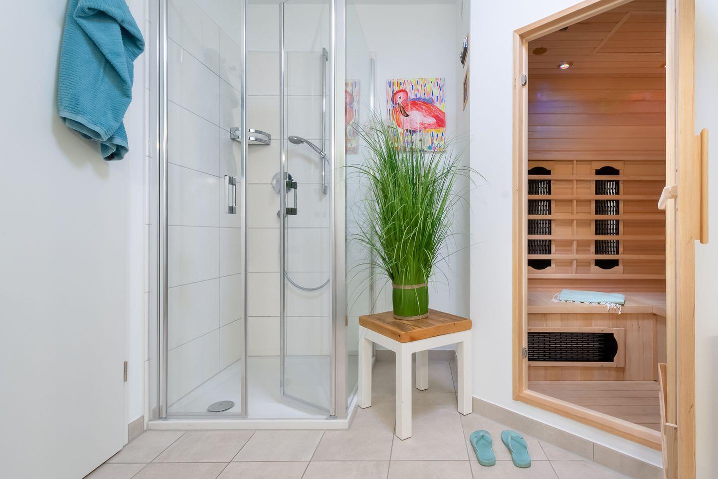 Hier finden Sie Entspannung zu jeder Jahreszeit, die Infrarot-Wärmekabine ausgestattet mit Hifi-Sound-System und LED-Farblichttherapie sowie einer Relax-Whirlwanne sorgen für Wohlfühlmomente bei jedem Wetter. Neben dieser Wellness-Ausstattung bietet die Ferienwohnung praktische Annehmlichkeiten wie einen Fahrradschuppen, einen PKW-Stellplatz direkt vor dem Haus und schnelles WLAN. Haustiere sind herzlich willkommen, sodass Sie Ihren Strandurlaub gemeinsam mit Ihrem vierbeinigen Freund genießen können.