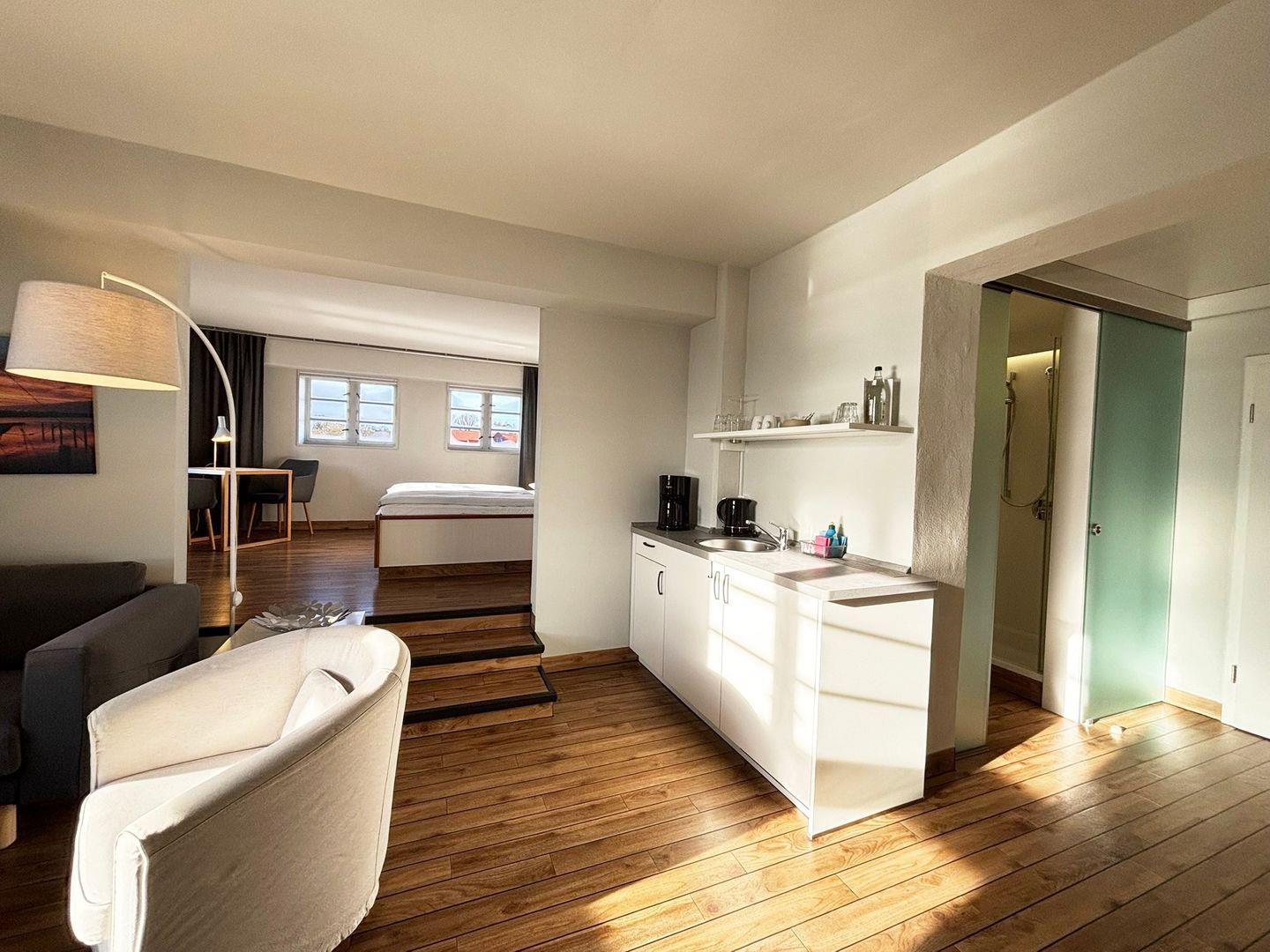 Das Appartement liegt in der vierten Etage des Pierspeichers und ist bequem über einen Aufzug oder das Treppenhaus erreichbar. Der offene Wohnbereich ist mit einem Esstisch, Sessel sowie einem Sofa und einem TV-Gerät ausgestattet. Der Schlafbereich verfügt über ein komfortables Doppelbett (180x200 cm) mit getrennten Matratzen und offenem Fußende, ergänzt durch einen Kleiderschrank, Kofferablage und Verdunklungsmöglichkeiten für erholsame Nächte.
