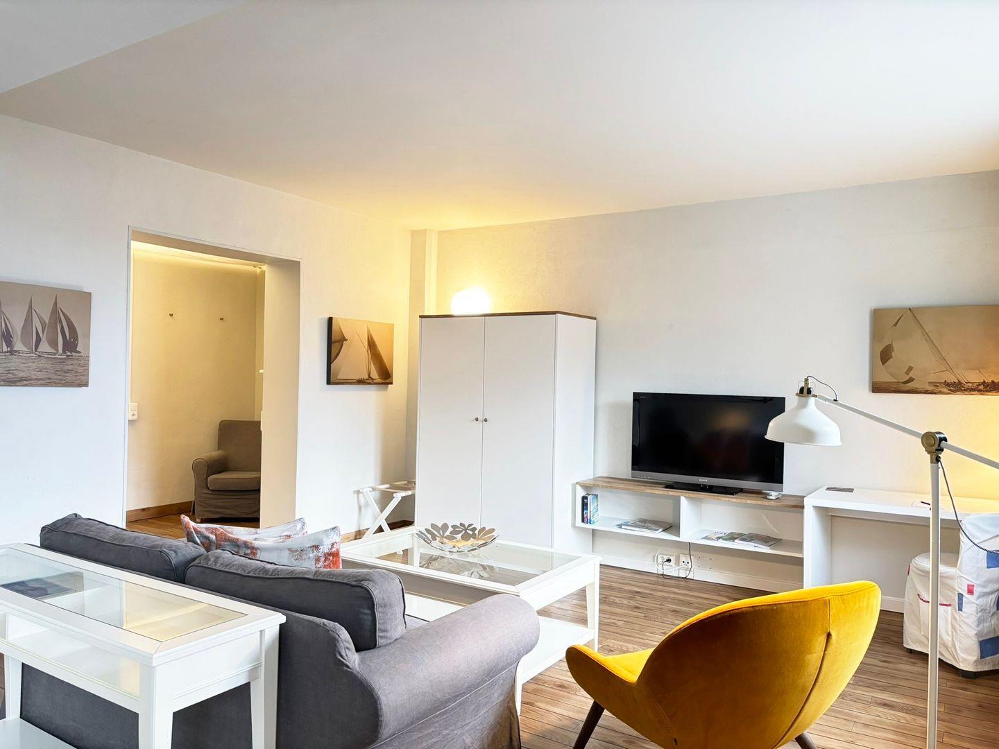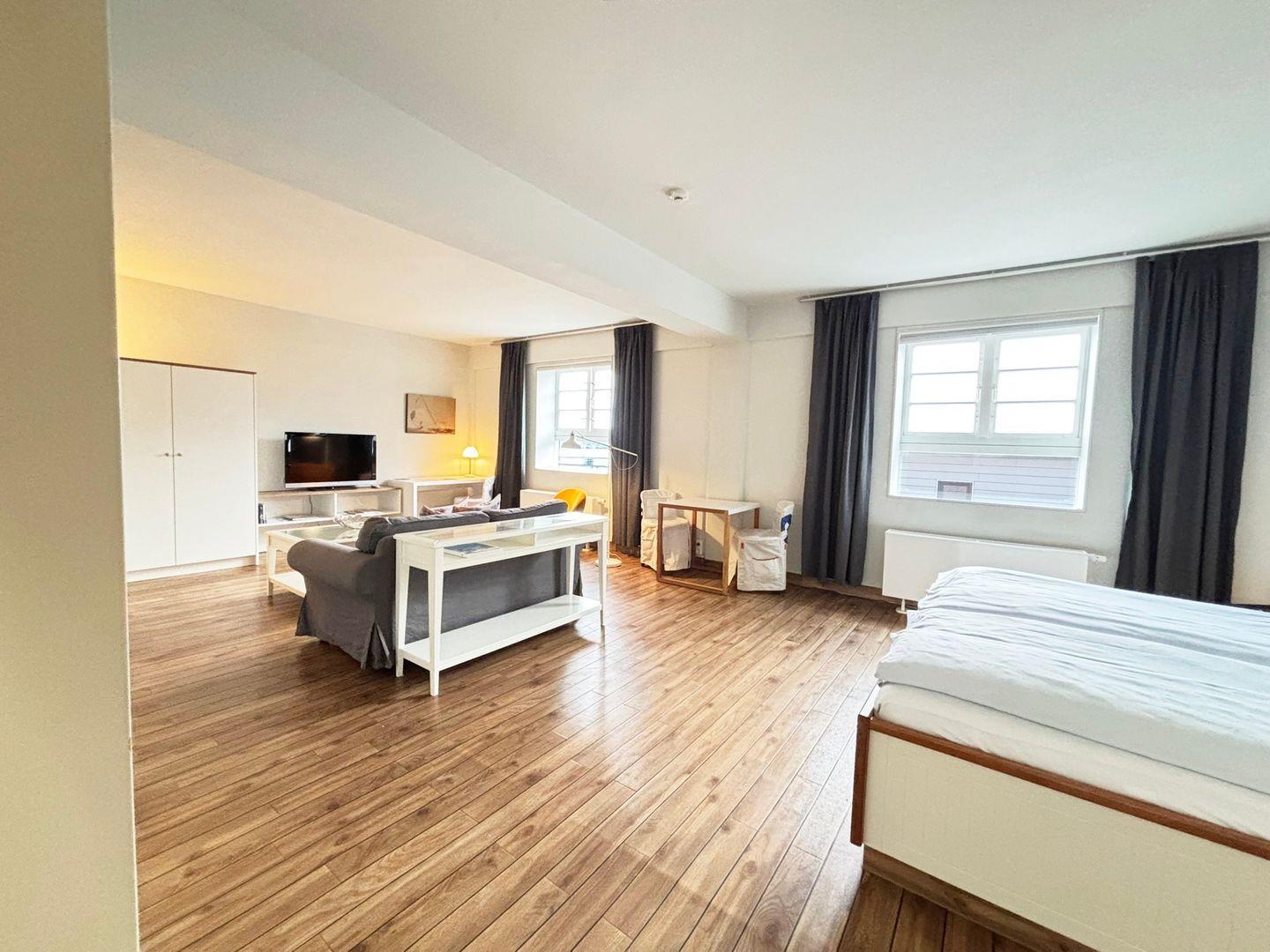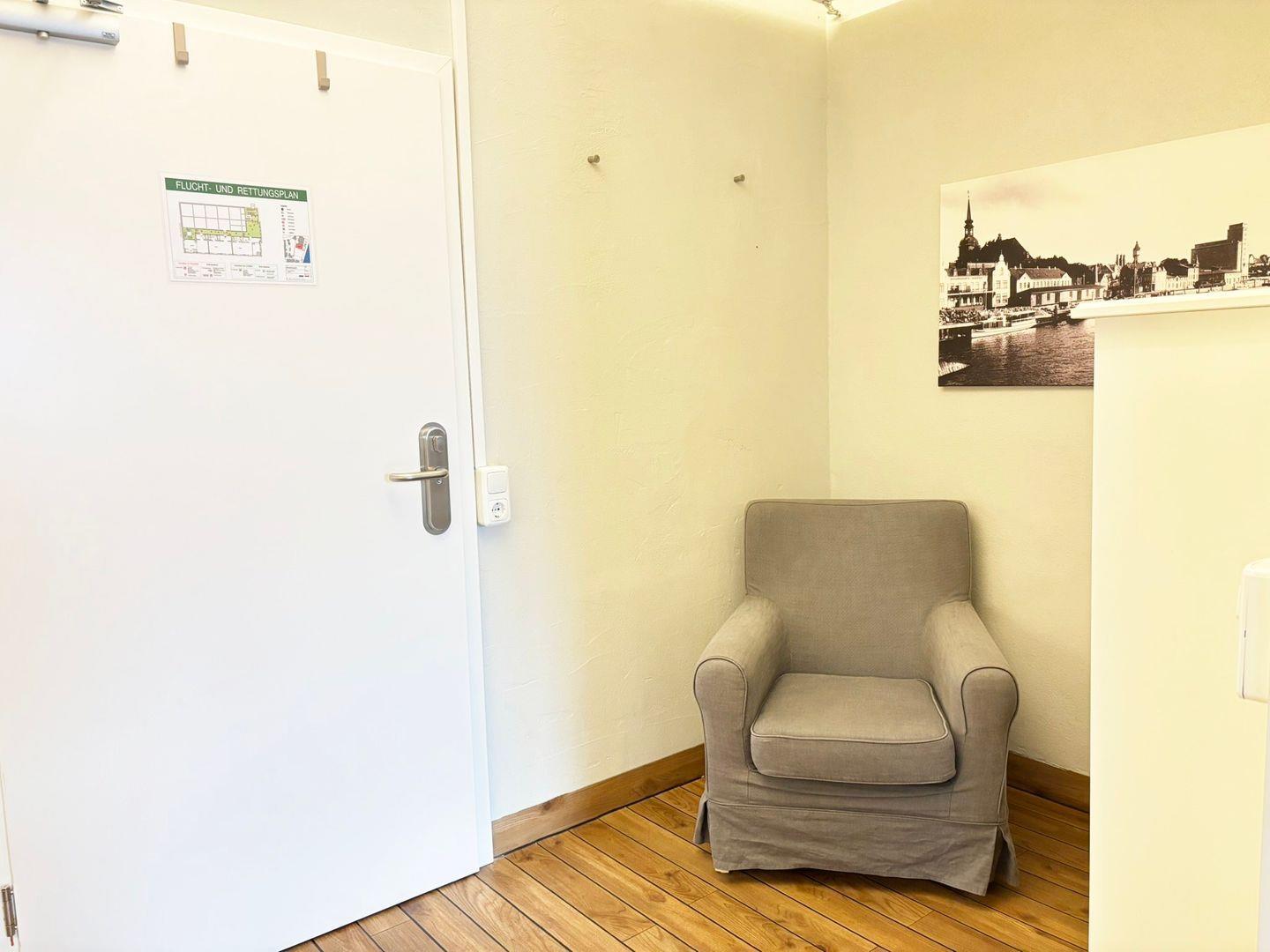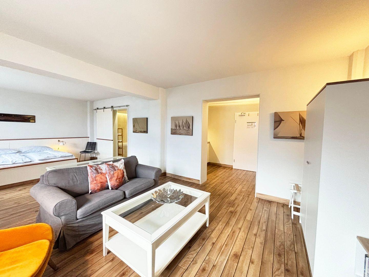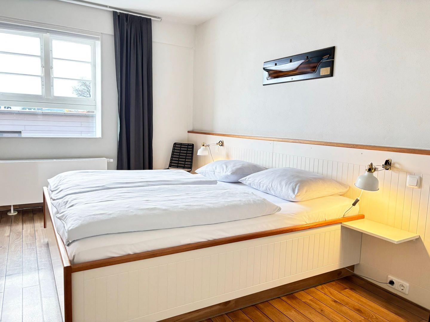 Das Appartement liegt in der dritten Etage des Pierspeichers und ist bequem über einen Aufzug oder das Treppenhaus erreichbar. Der offene Wohnbereich ist mit einem Esstisch, Sessel sowie einem Sofa und einem TV-Gerät ausgestattet. Der Schlafbereich verfügt über ein komfortables Doppelbett (180x200 cm) mit getrennten Matratzen und offenem Fußende, ergänzt durch einen Kleiderschrank, Kofferablage und Verdunklungsmöglichkeiten für erholsame Nächte.