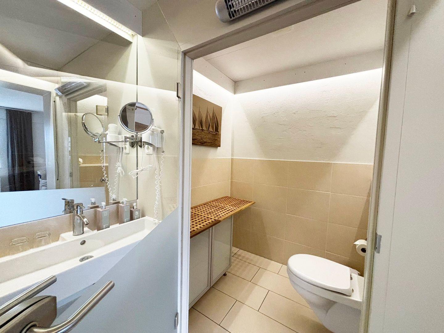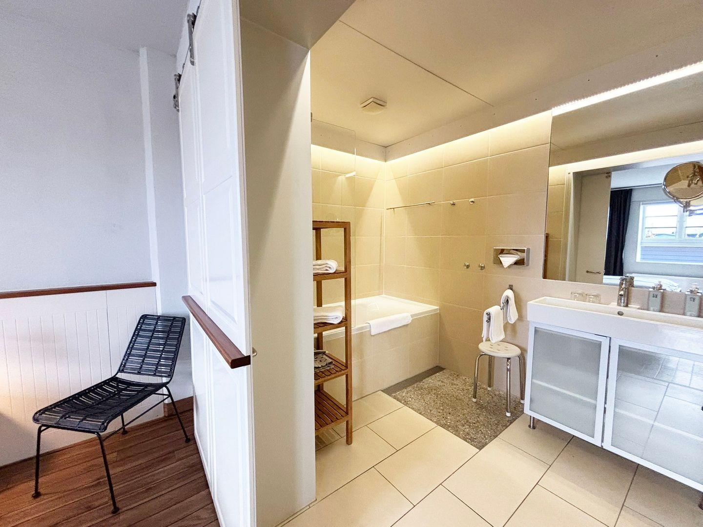 Das Badezimmer ist funktional in zwei separate Bereiche aufgeteilt: In einem Bereich finden Sie das WC, während der andere Bereich mit einer Badewanne, Haartrockner, Kosmetikspiegel, Spiegel und einem Waschbecken ausgestattet ist.