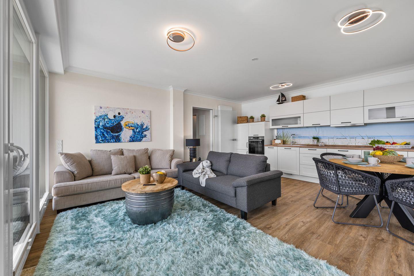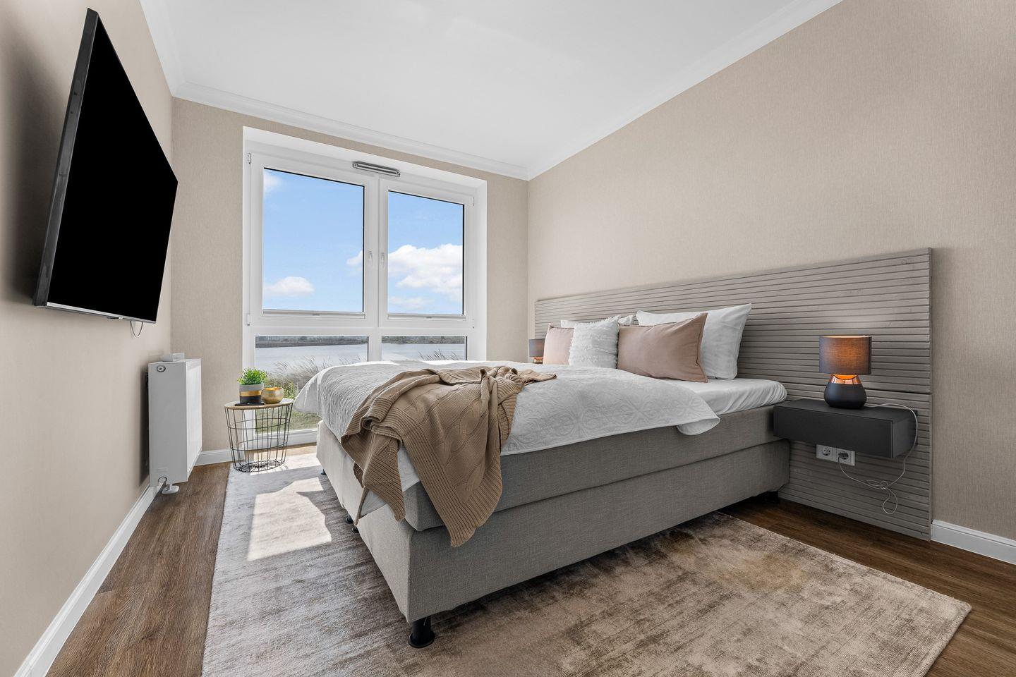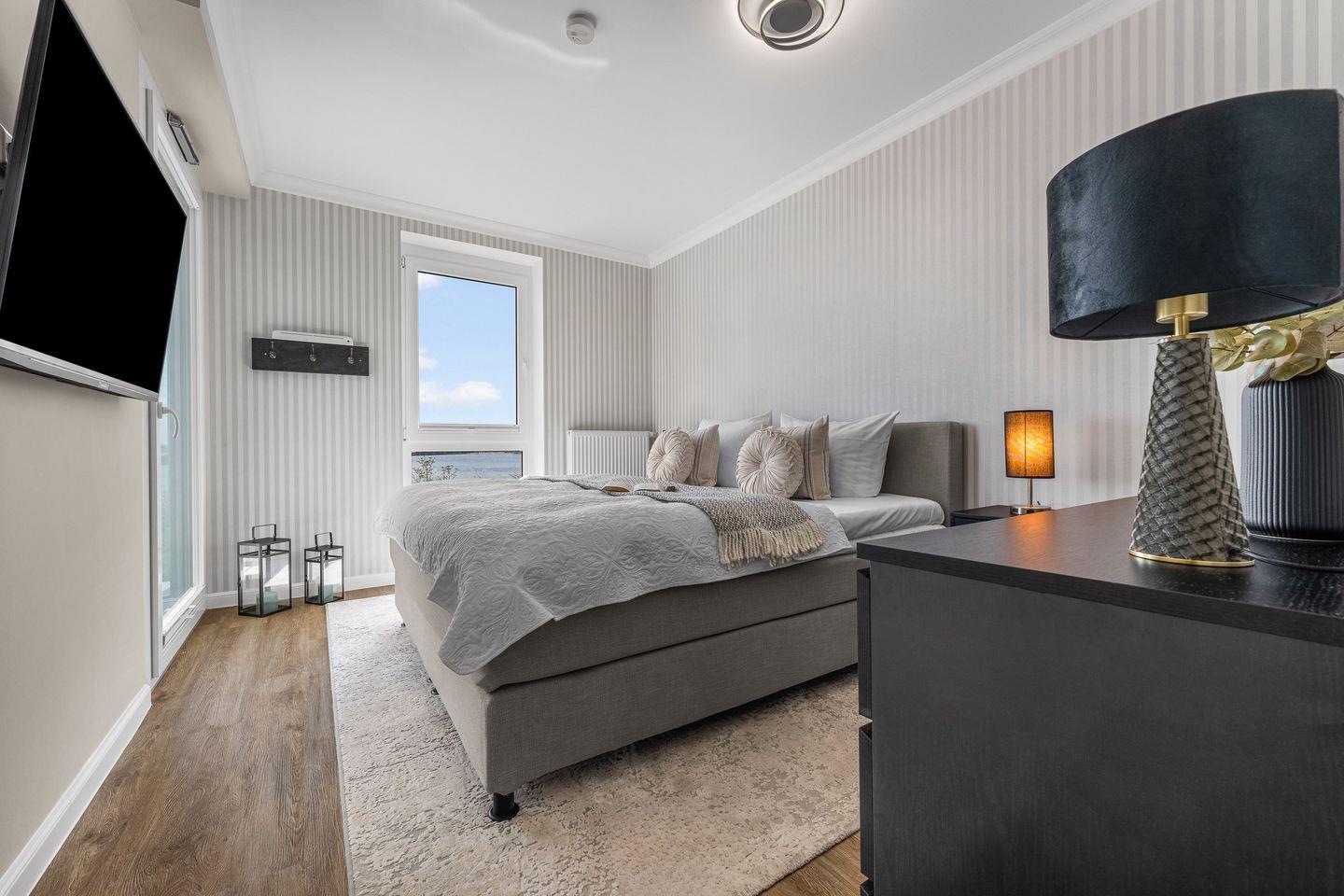 Im Wohnzimmer laden ein komfortables Dreier- und ein Zweiersofa sowie ein variabler Couchtisch zum Relaxen ein, während ein Flat-Screen-TV für Unterhaltung sorgt. Zwei Schlafzimmer mit jeweils einem großen Boxspringbett versprechen erholsame Nächte. Bodentiefe Fenster gewähren auch hier einen herrlichen Meerblick und lassen sich mit praktischen Plissees verdunkeln, falls gewünscht.