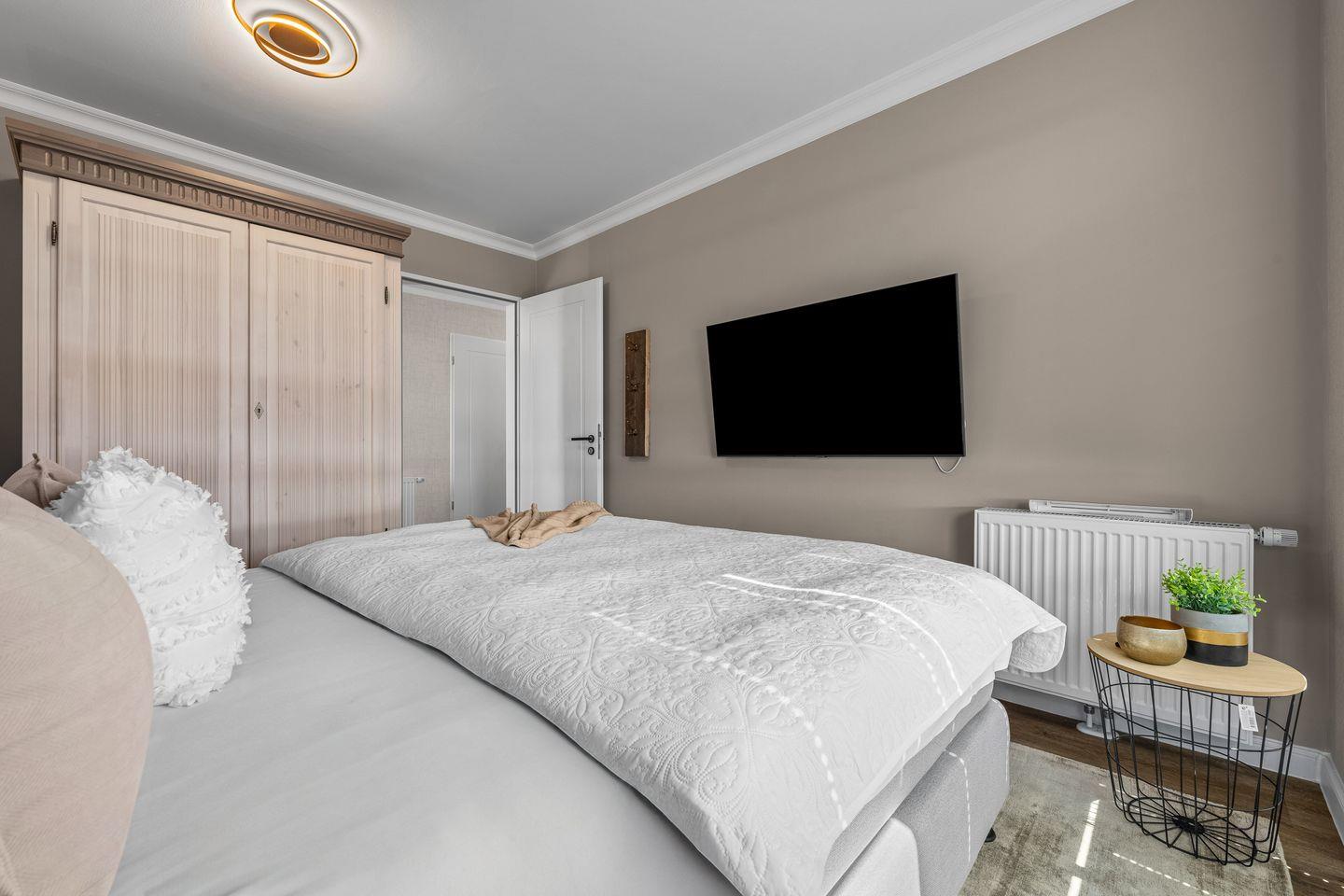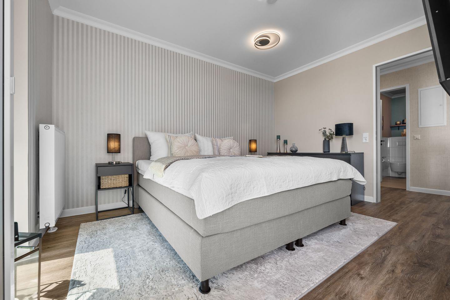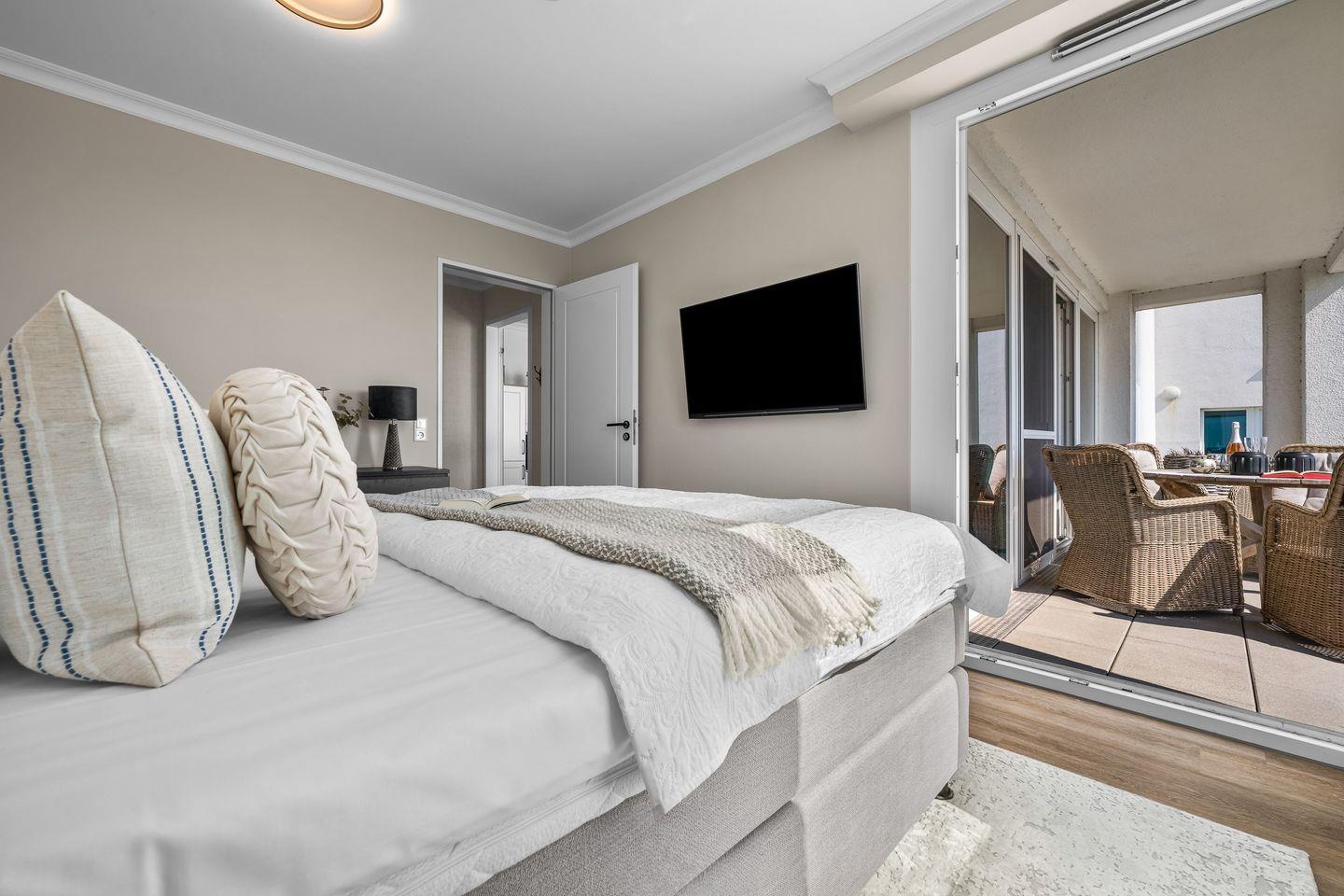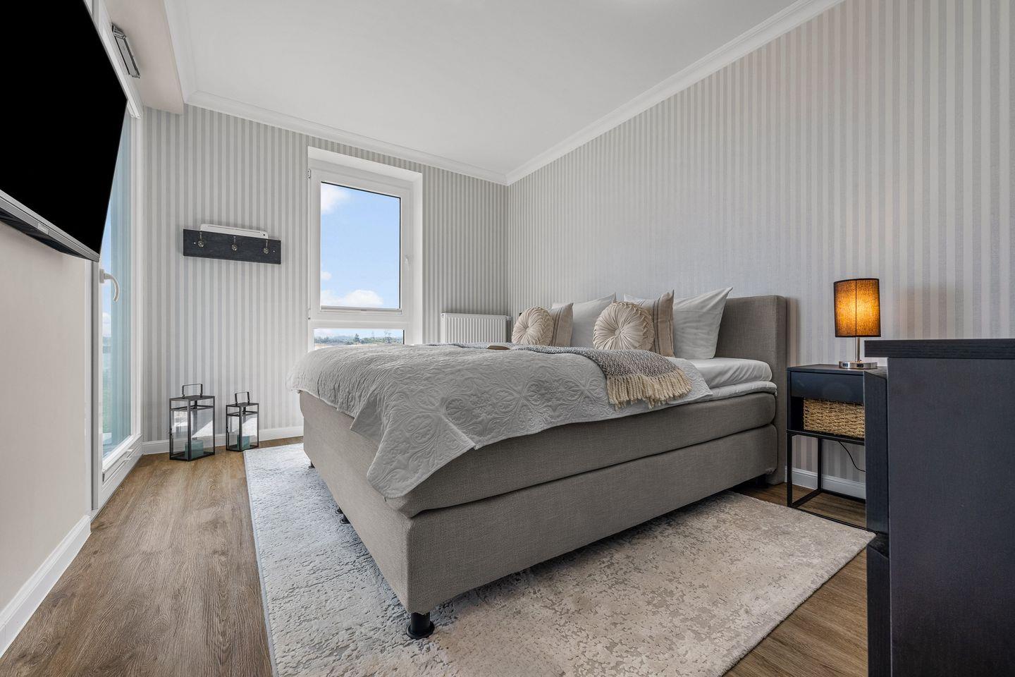 Im Wohnzimmer laden ein komfortables Dreier- und ein Zweiersofa sowie ein variabler Couchtisch zum Relaxen ein, während ein Flat-Screen-TV für Unterhaltung sorgt. Zwei Schlafzimmer mit jeweils einem großen Boxspringbett versprechen erholsame Nächte. Bodentiefe Fenster gewähren auch hier einen herrlichen Meerblick und lassen sich mit praktischen Plissees verdunkeln, falls gewünscht.