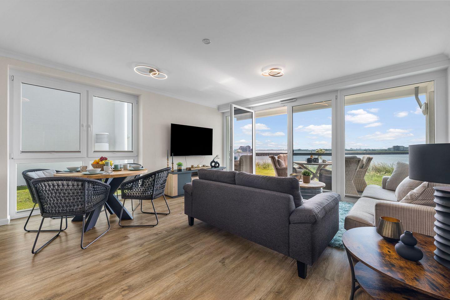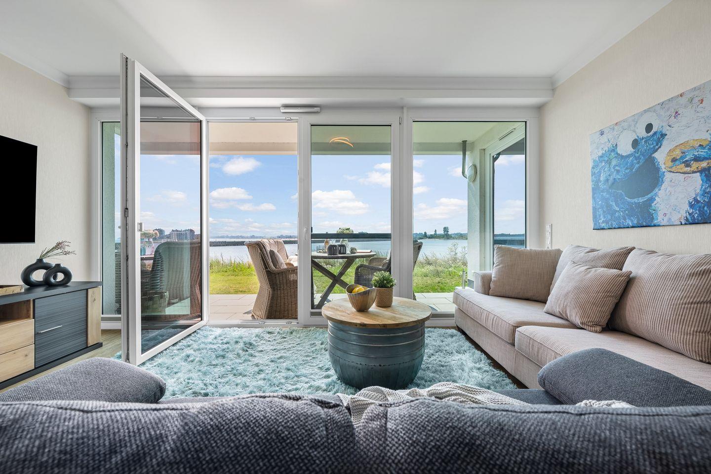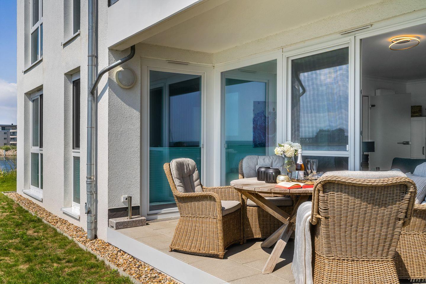 "Hafenspitze": Erdgeschosswohnung mit Ostseeblick, Terrasse & Wellnessbereich